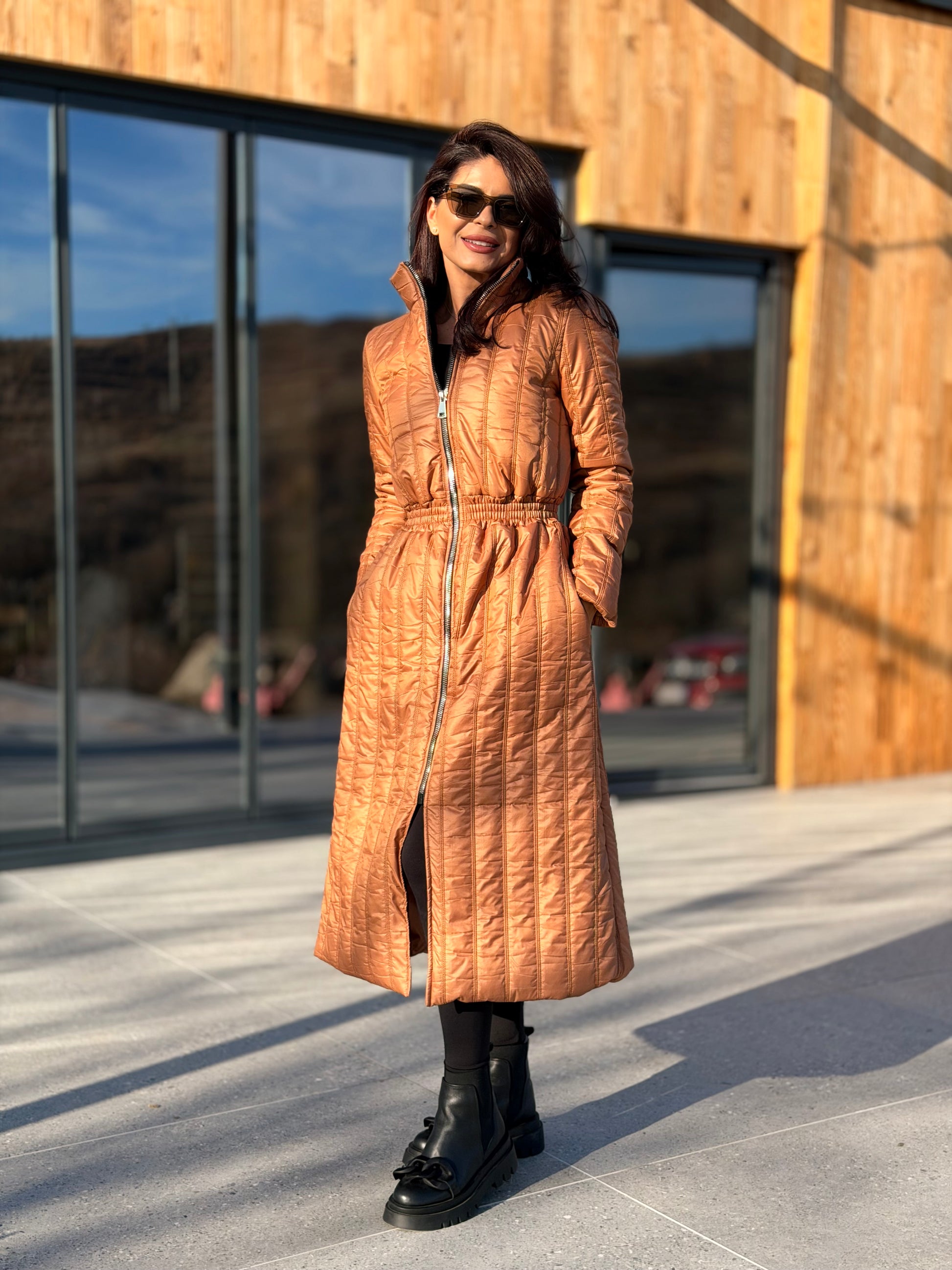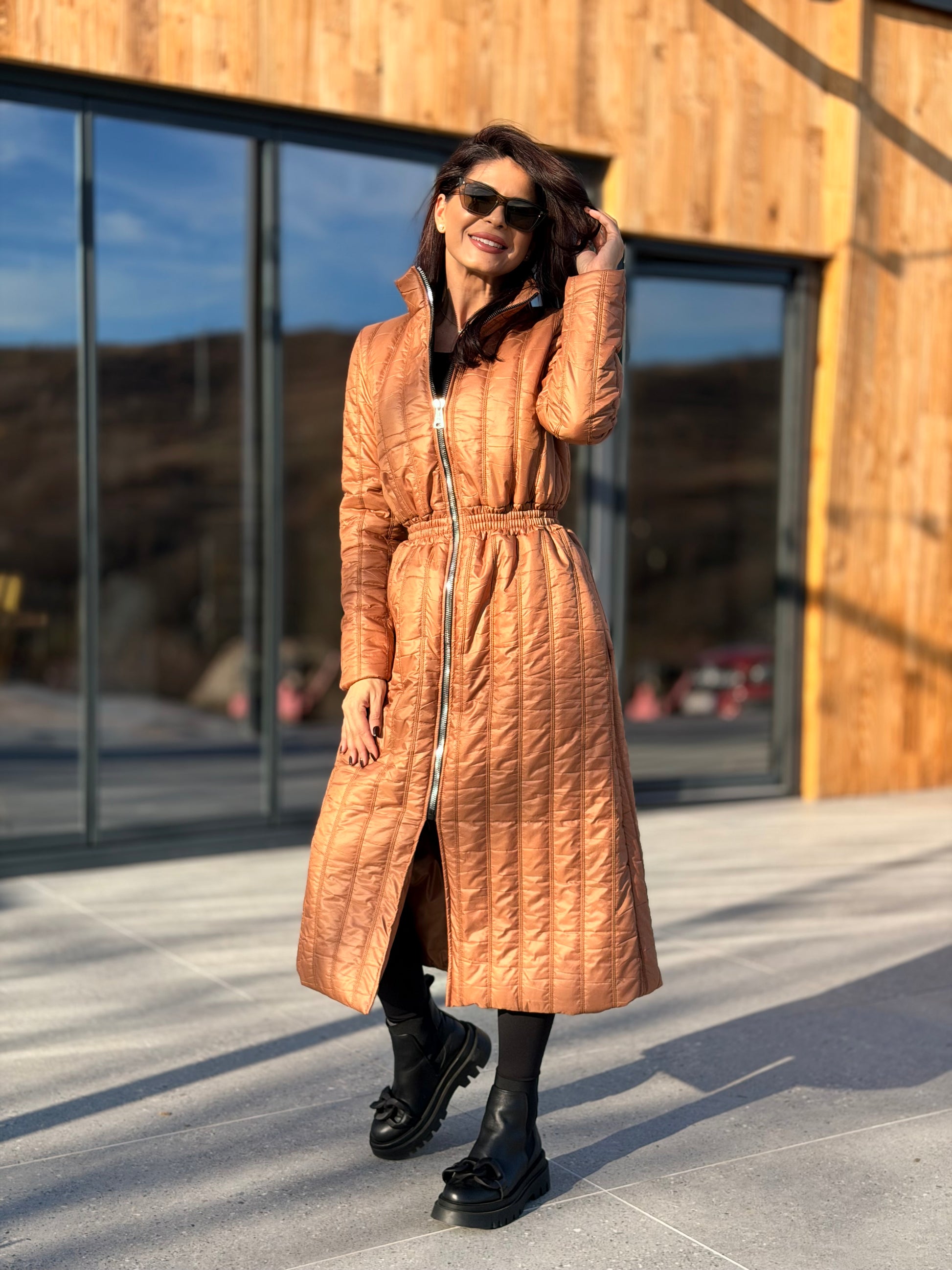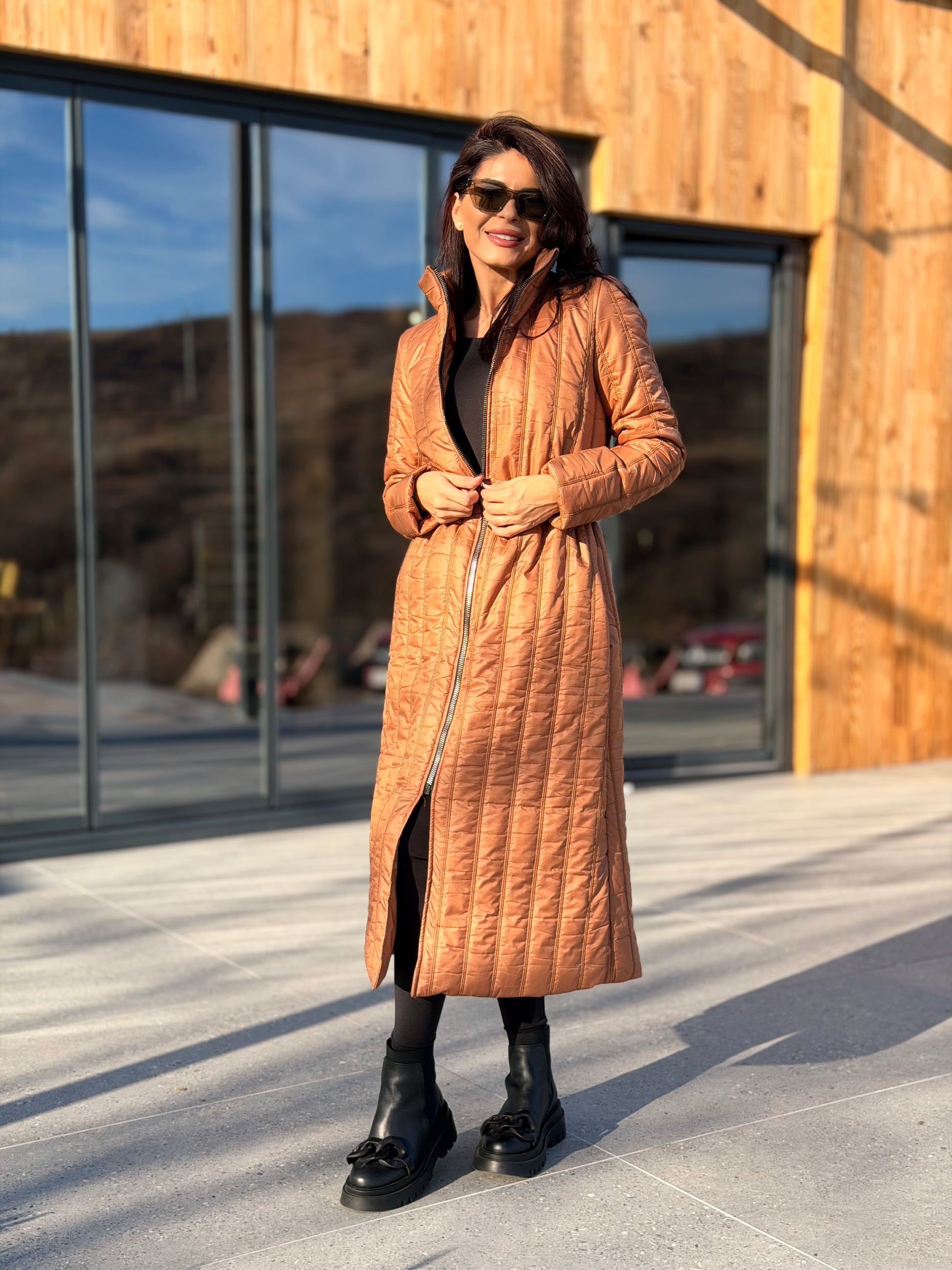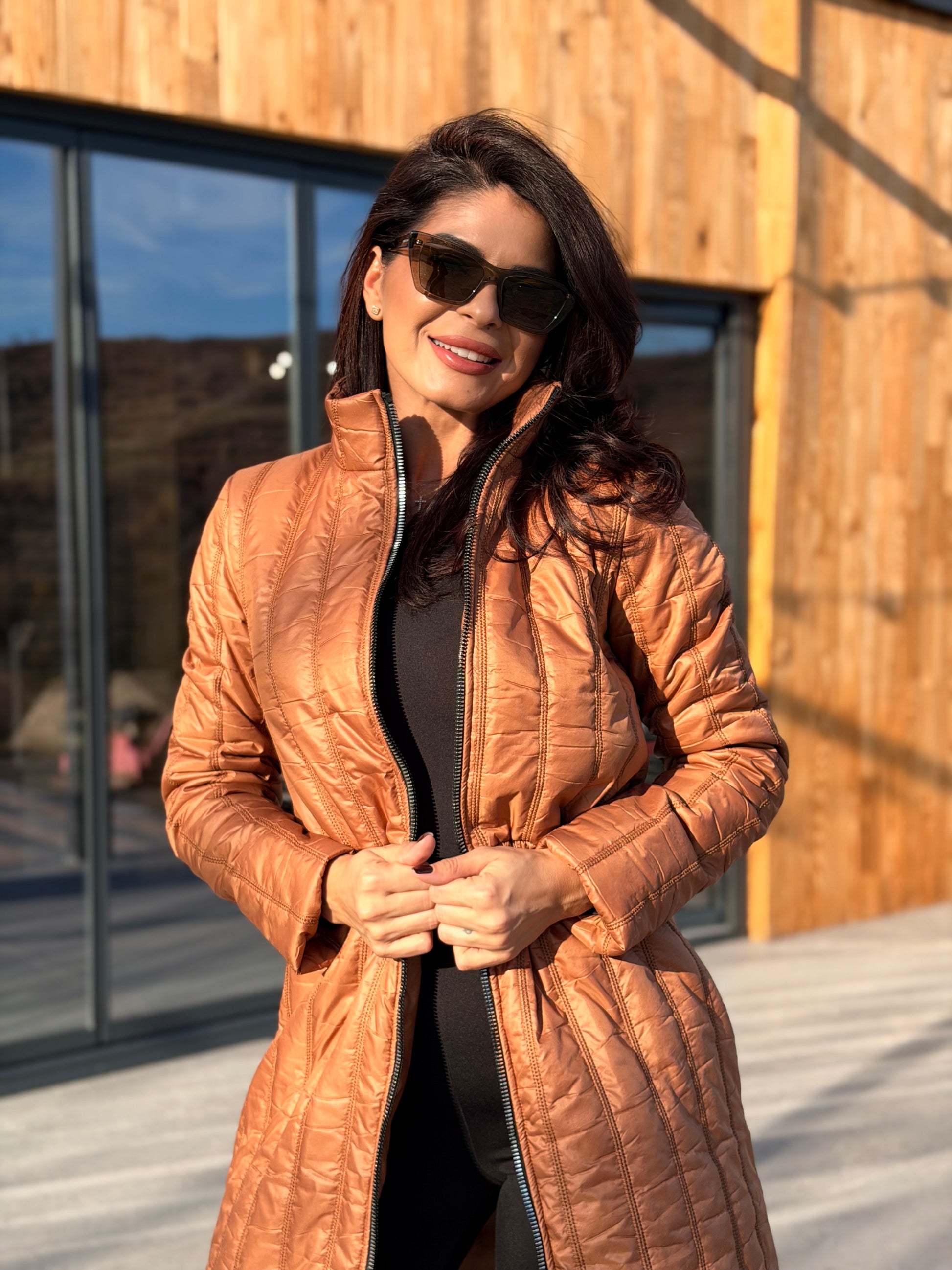 – Lungime midi-lungă, care alungește vizual silueta și protejează eficient în zilele reci