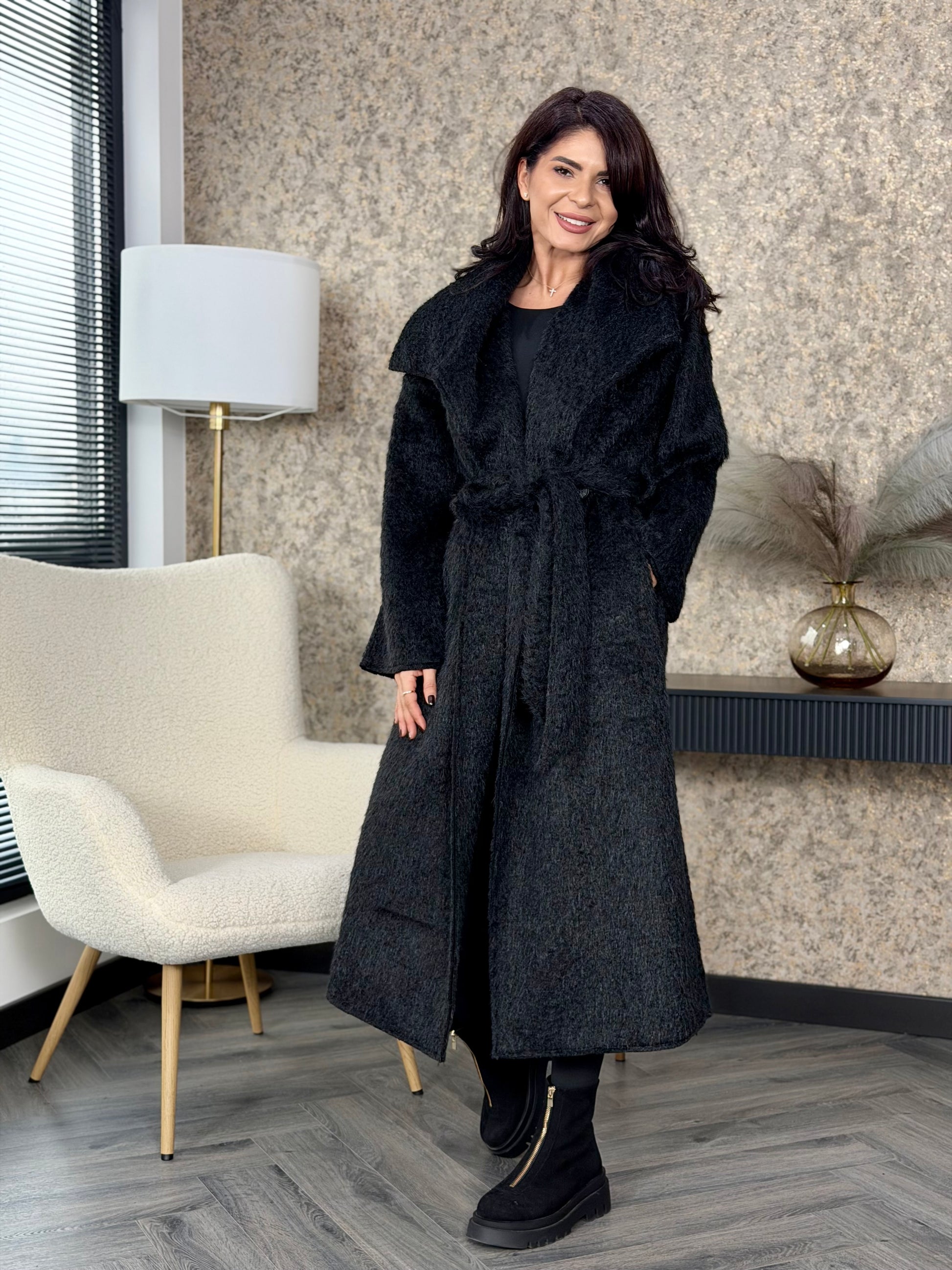 Modelul are închidere cu nasture frontal și cordon în talie, care conturează frumos silueta. Lungimea de 125 cm îl transformă într-o piesă spectaculoasă, ce alungește elegant linia corpului. Ideal de purtat cu botine, pantaloni conici sau rochii midi, pentru un outfit cald, cozy & sofisticat.
