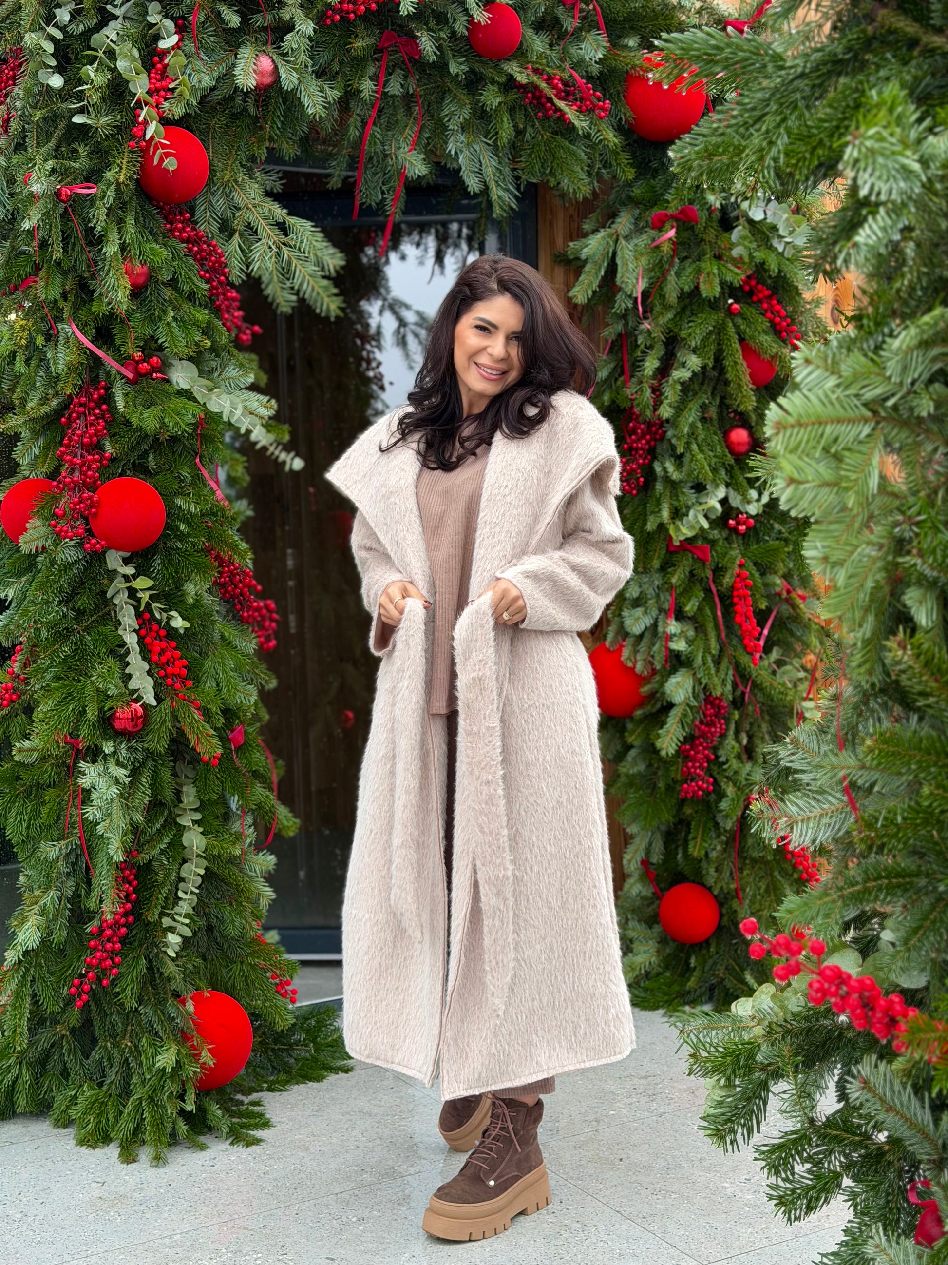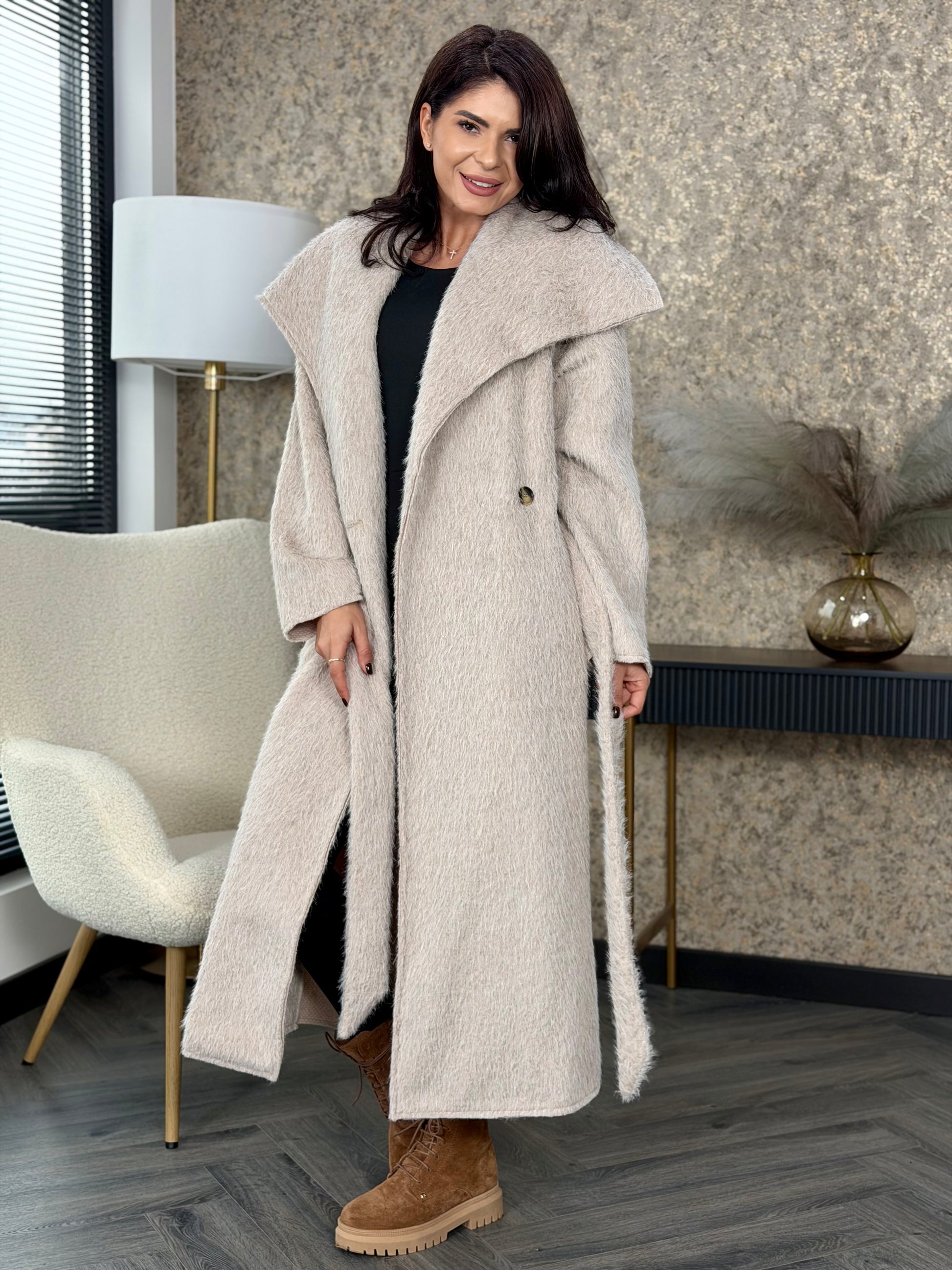 Modelul are închidere cu nasture frontal și cordon în talie, care conturează frumos silueta. Lungimea de 125 cm îl transformă într-o piesă spectaculoasă, ce alungește elegant linia corpului. Ideal de purtat cu botine, pantaloni conici sau rochii midi, pentru un outfit cald, cozy & sofisticat.