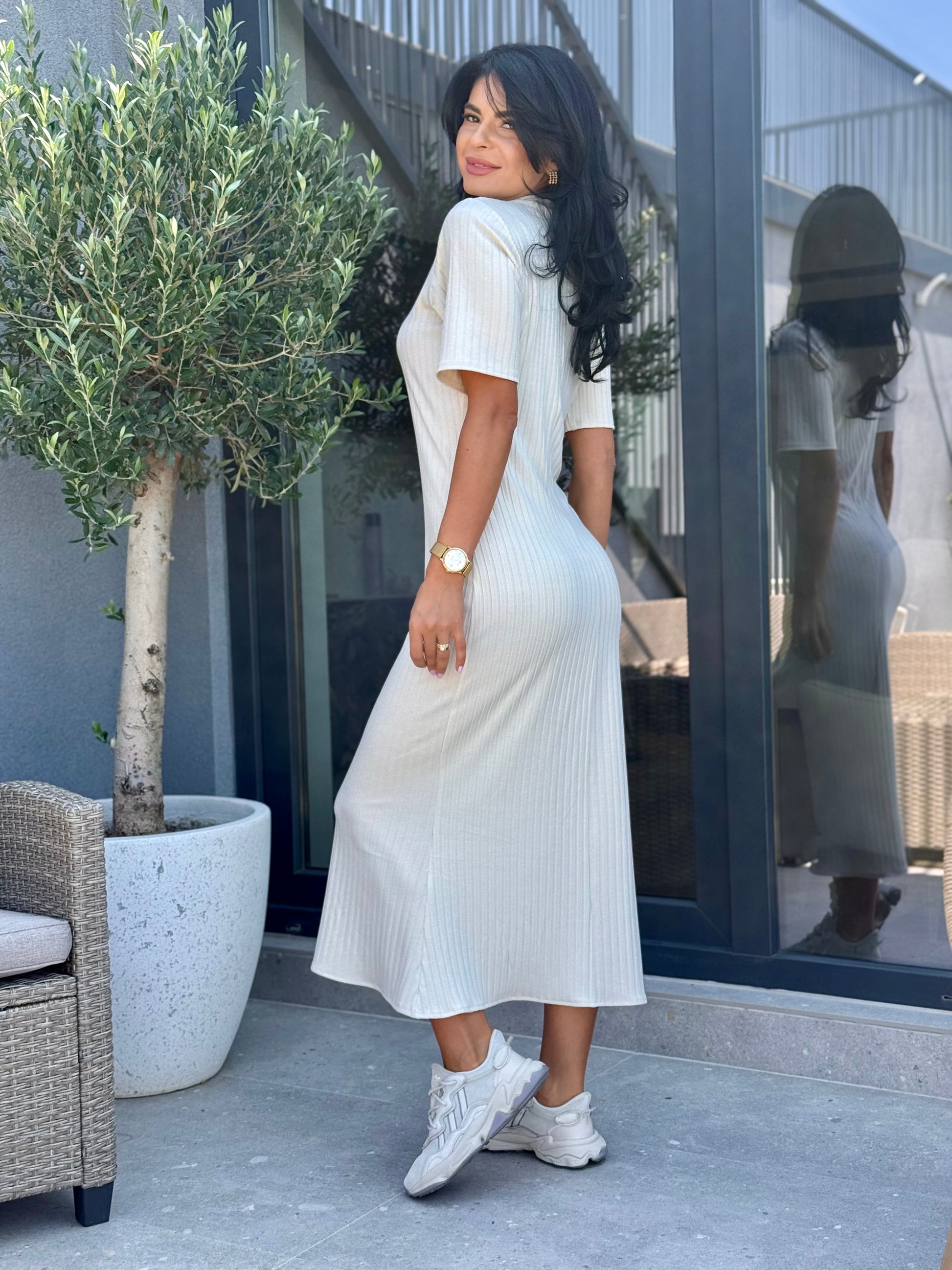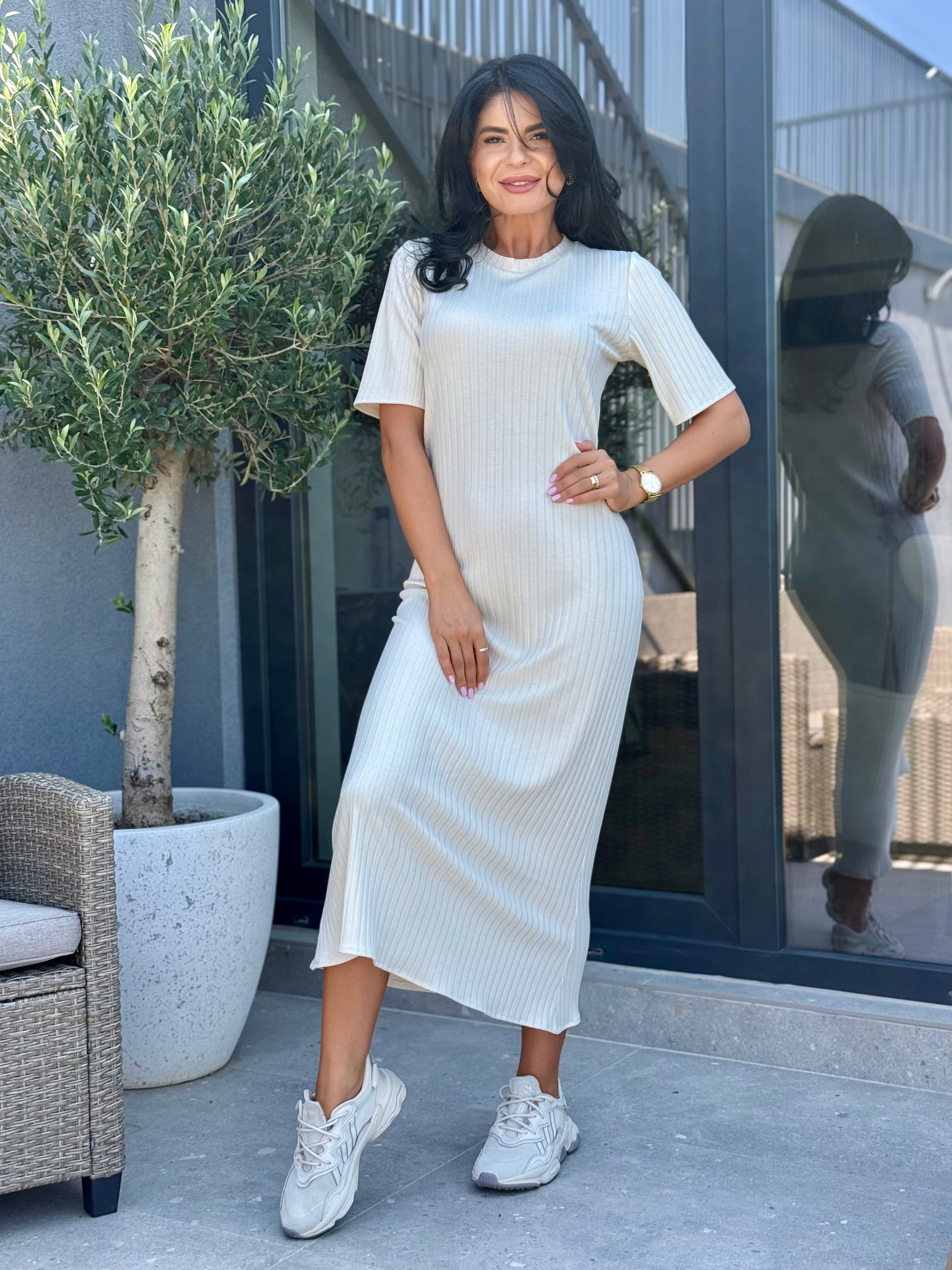 Rochie midi din tricot reiat, cu un croi drept ce urmărește delicat liniile corpului, oferind un look modern și confortabil. Are mâneci scurte, guler rotund și lungime până la gleznă, fiind ideală pentru un stil casual-chic. Poate fi purtată cu sneakers pentru un outfit relaxat de zi sau cu sandale/pantofi pentru un aer mai elegant.