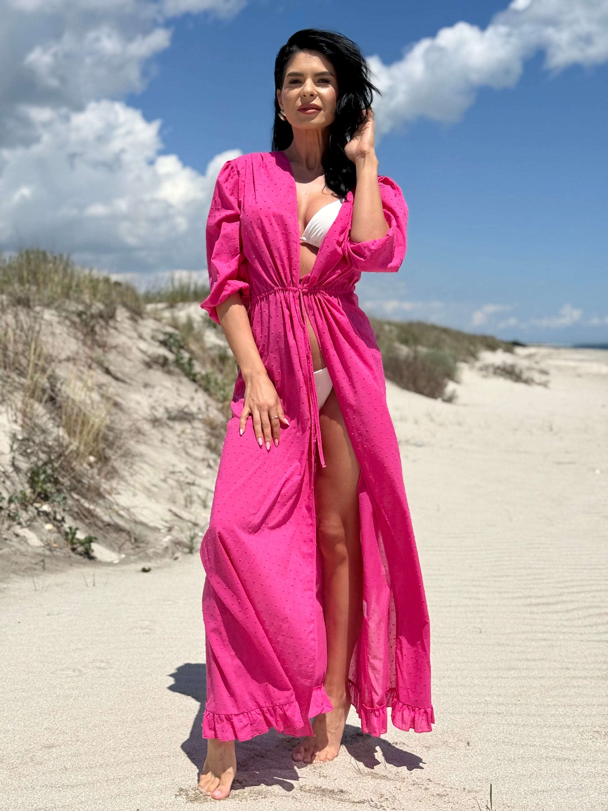 Rochie de plaja din 100% bumbac, ideala pentru zile insorite de vacanta. Croiala lejera, cu snur in talie si volan discret la baza, ofera confort si un look feminin. Se poarta peste costumul de baie.