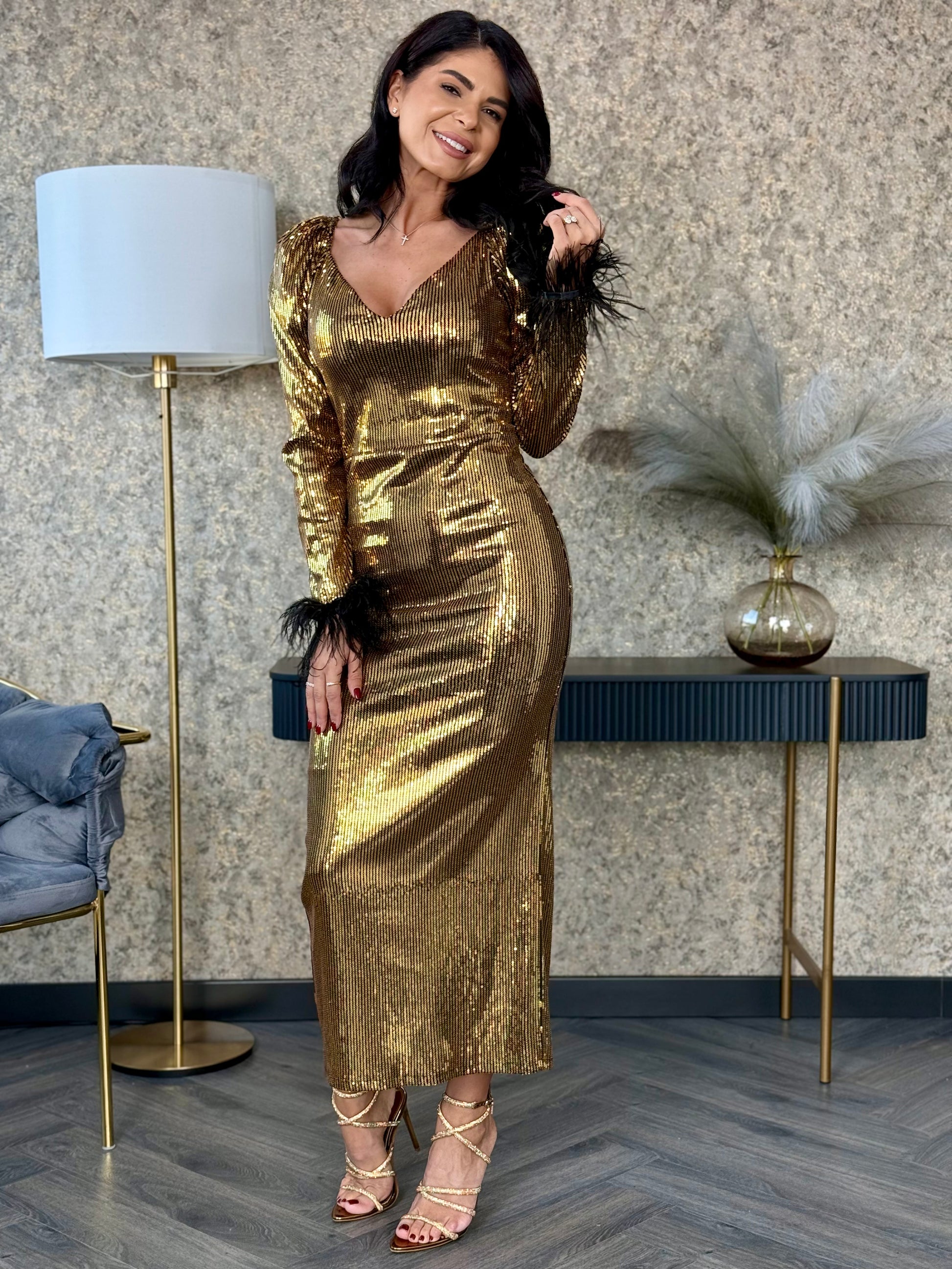 Rochie midi din paiete aurii, cu detalii spectaculoase din pene fine la mâneci și croială ce conturează elegant silueta.