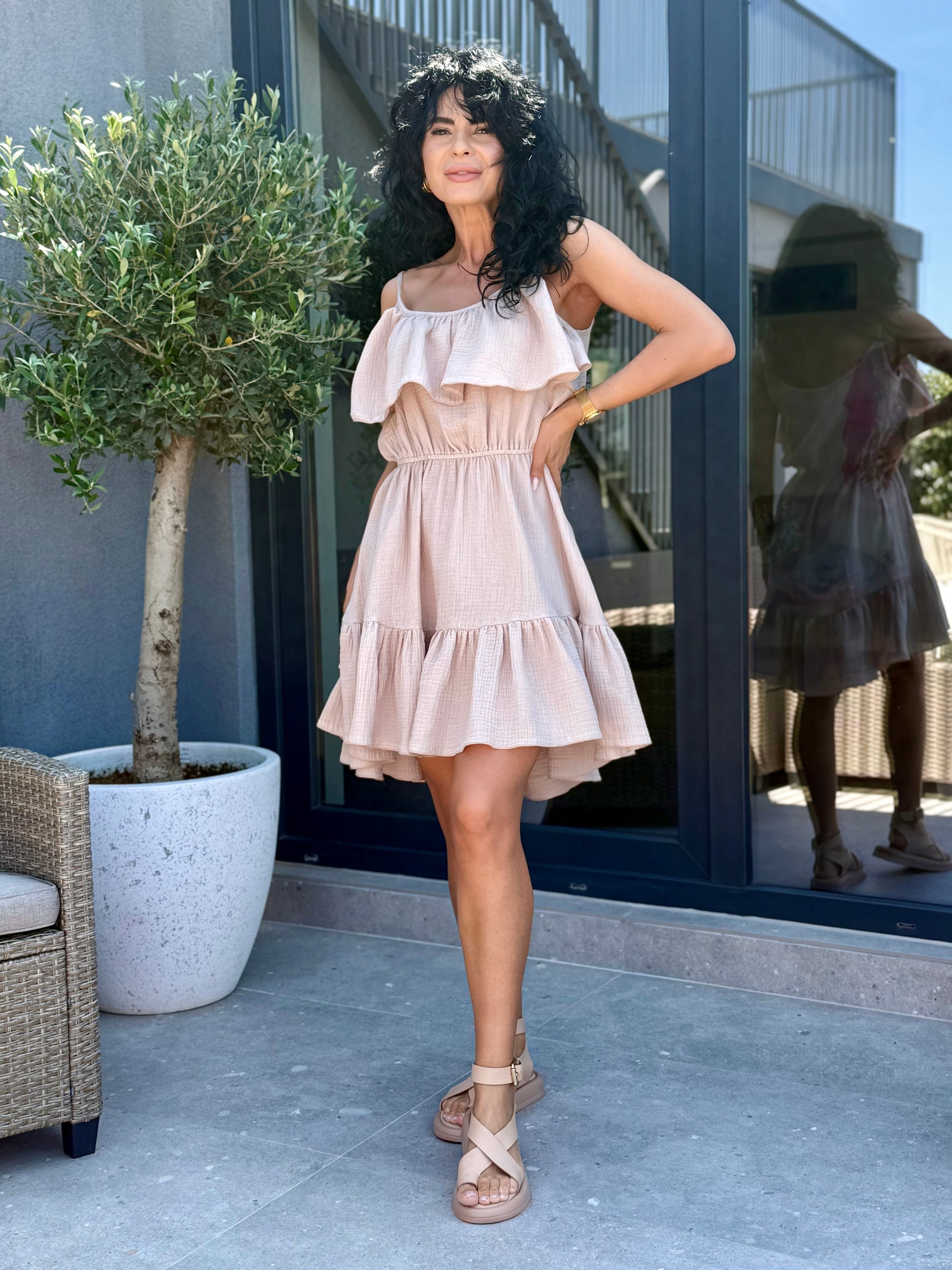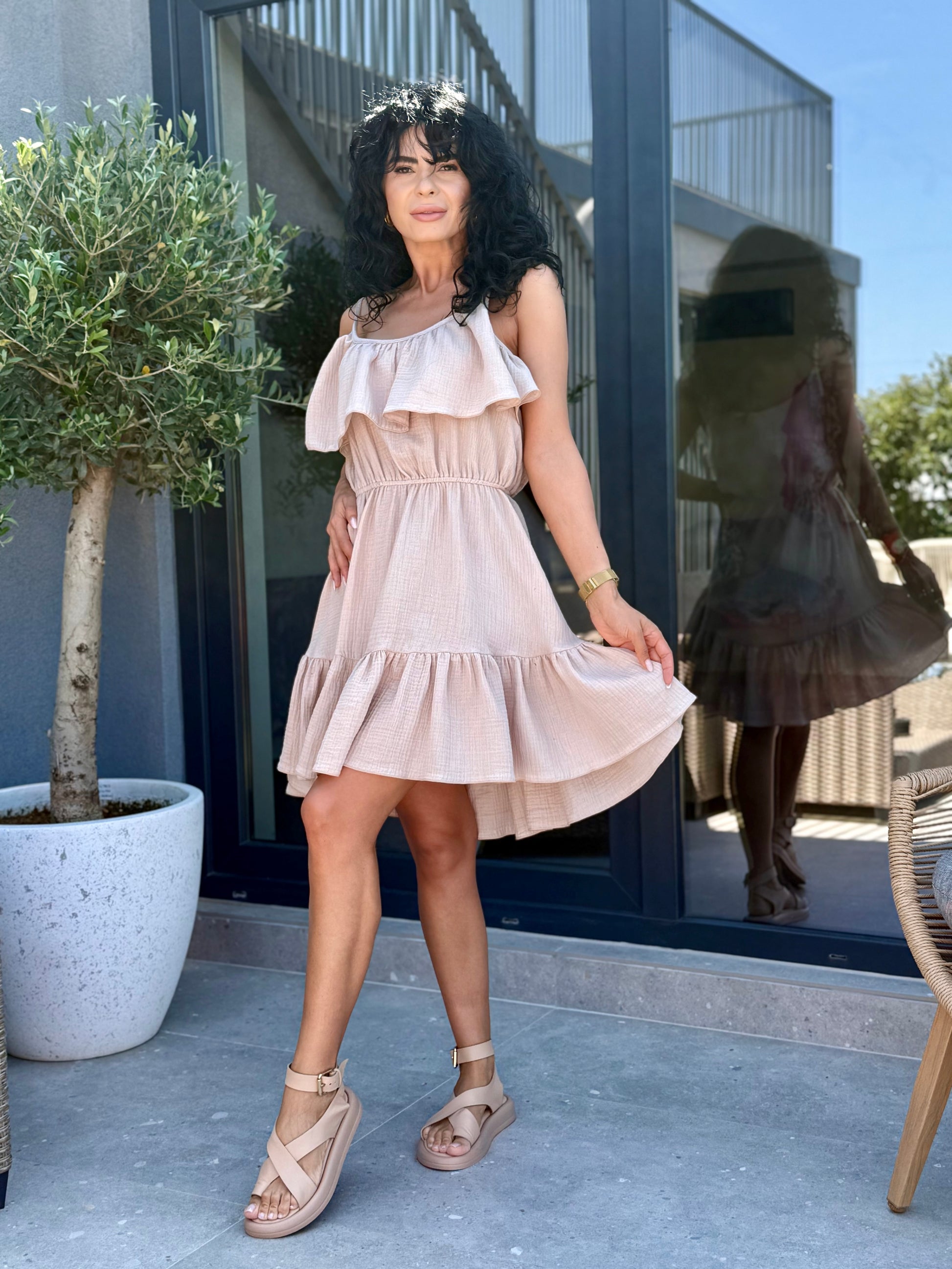 Rochie scurta, realizata din muselina vaporoasa, cu bretele subtiri si volan amplu in zona bustului. Croiala lejera, cu talia marcata elastic si fusta in clos, usor asimetrica. Un model feminin, perfect pentru vara.