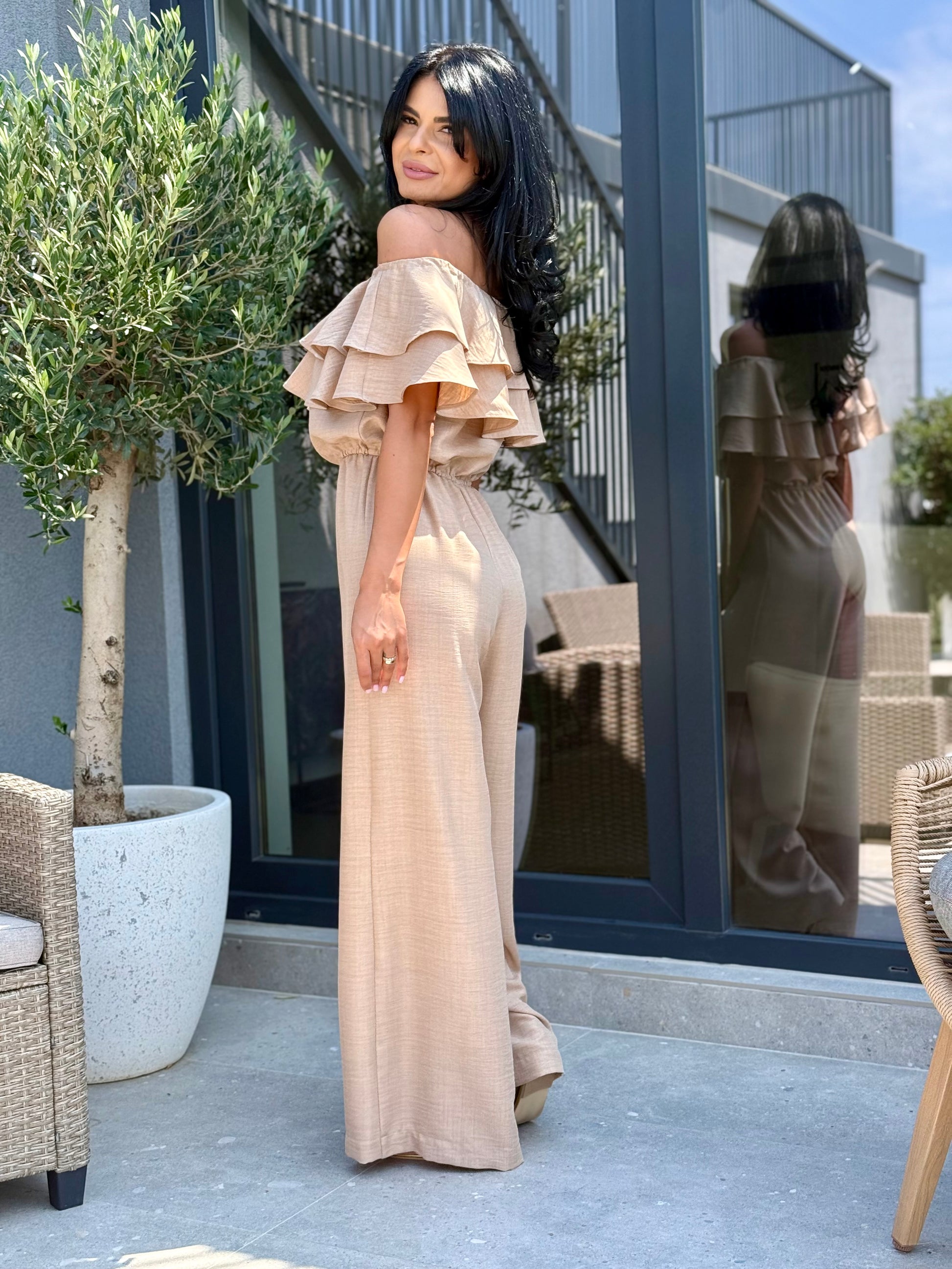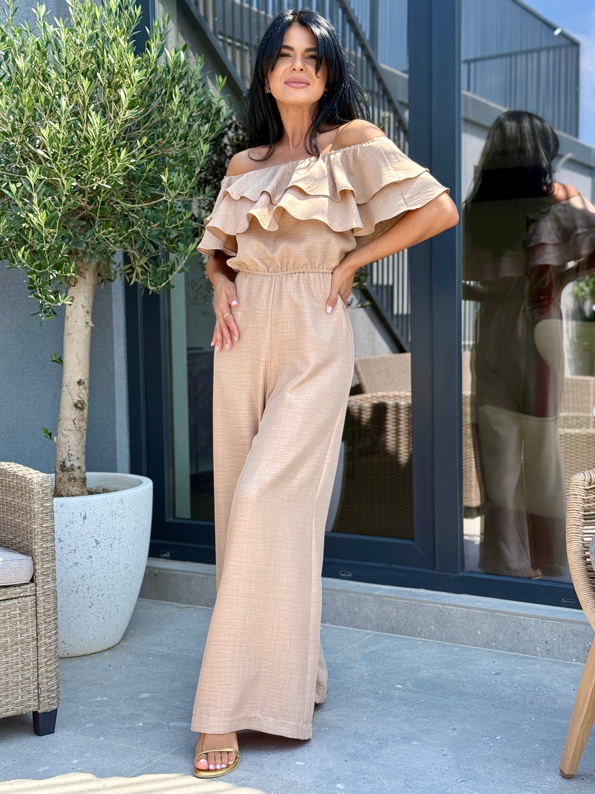 Salopeta are un croi lejer, cu pantaloni largi care alungesc silueta și oferă confort. Partea superioară este cu umerii goi, evidențiată de volane ample dispuse în straturi, care adaugă un aer romantic și modern. Talia este elastică, marcând subtil silueta fără să incomodeze.