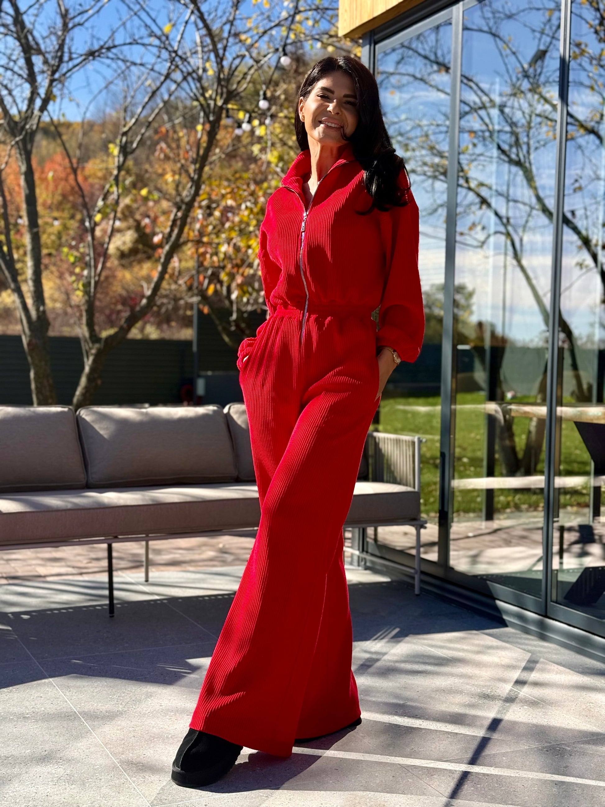 Ideală pentru zilele răcoroase, această salopetă din catifea reiată îmbină confortul cu stilul sofisticat.