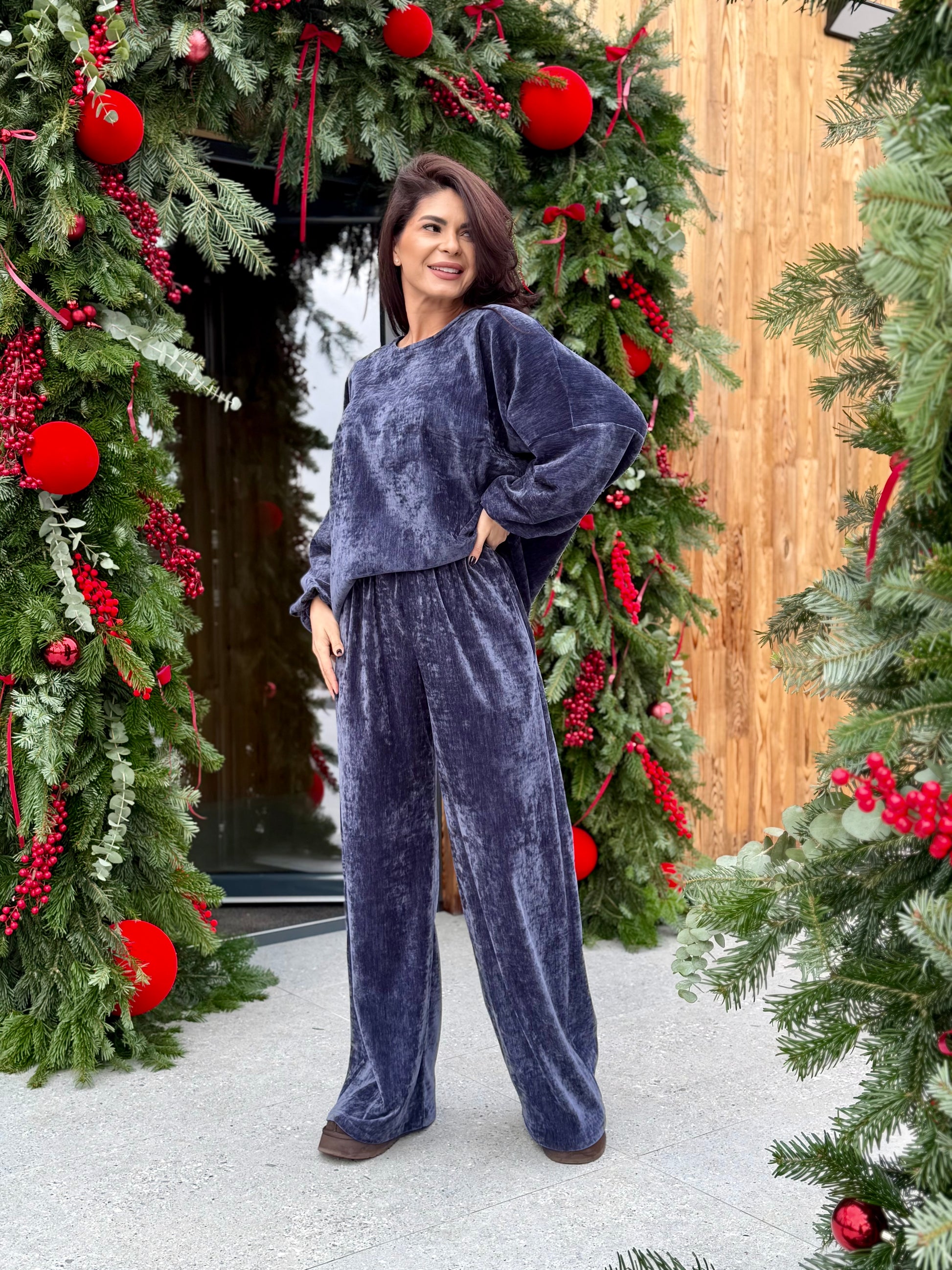 Un set elegant, confecționat din catifea moale cu reflexii subtile, care captează frumos lumina și oferă un efect luxuriant. Materialul este plăcut la atingere, fluid și confortabil, ideal pentru zilele reci în care vrei să îmbini rafinamentul cu relaxarea.