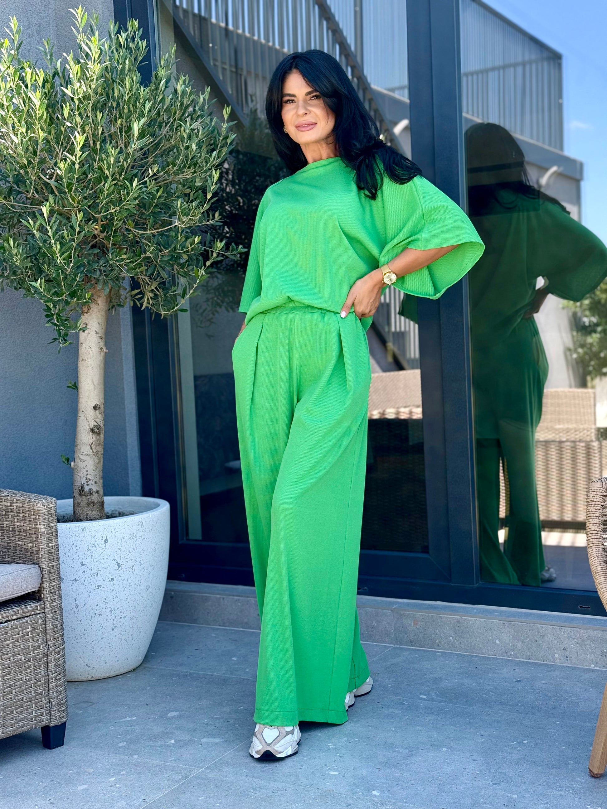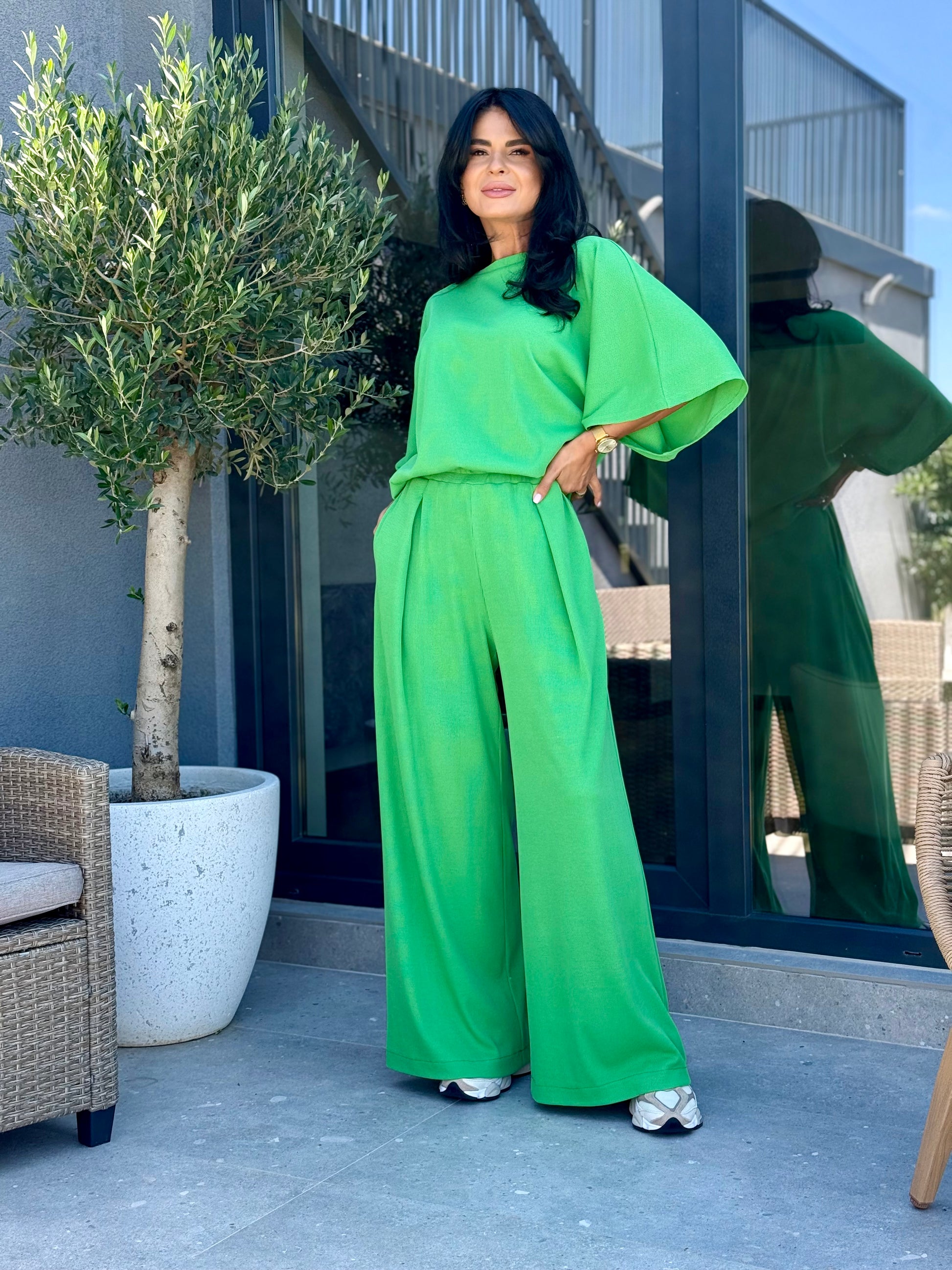 Costumul este compus din bluza cu croi drept, usor oversized, maneci largi trei sferturi si un decolteu rotund elegant. Pantalonii sunt lungi, evazati, cu talie elastica, oferind libertate de miscare si confort maxim. Tesatura are o textura usor fluida, perfecta pentru zilele active in care vrei sa te simti bine, dar si sa arati impecabil.