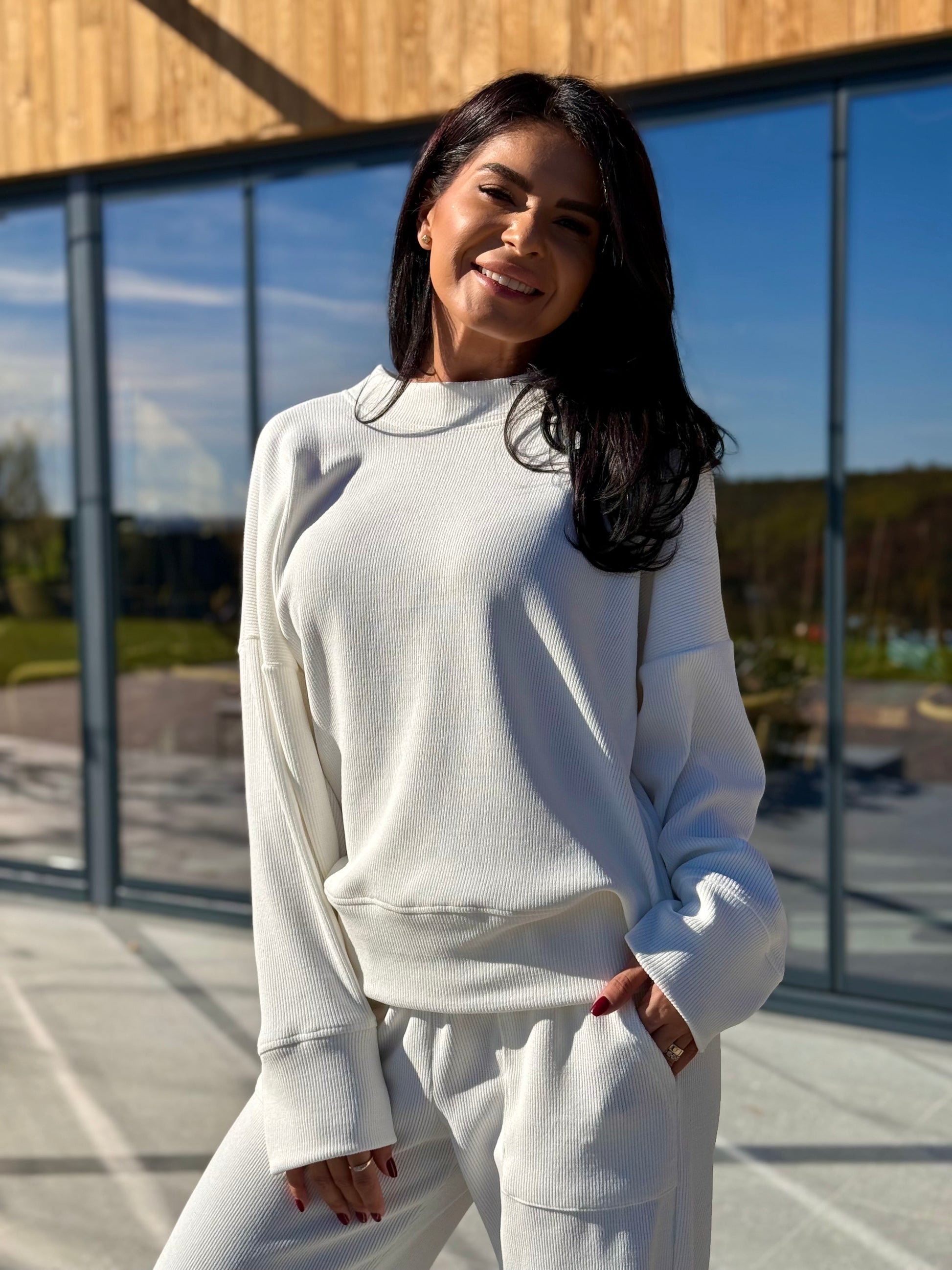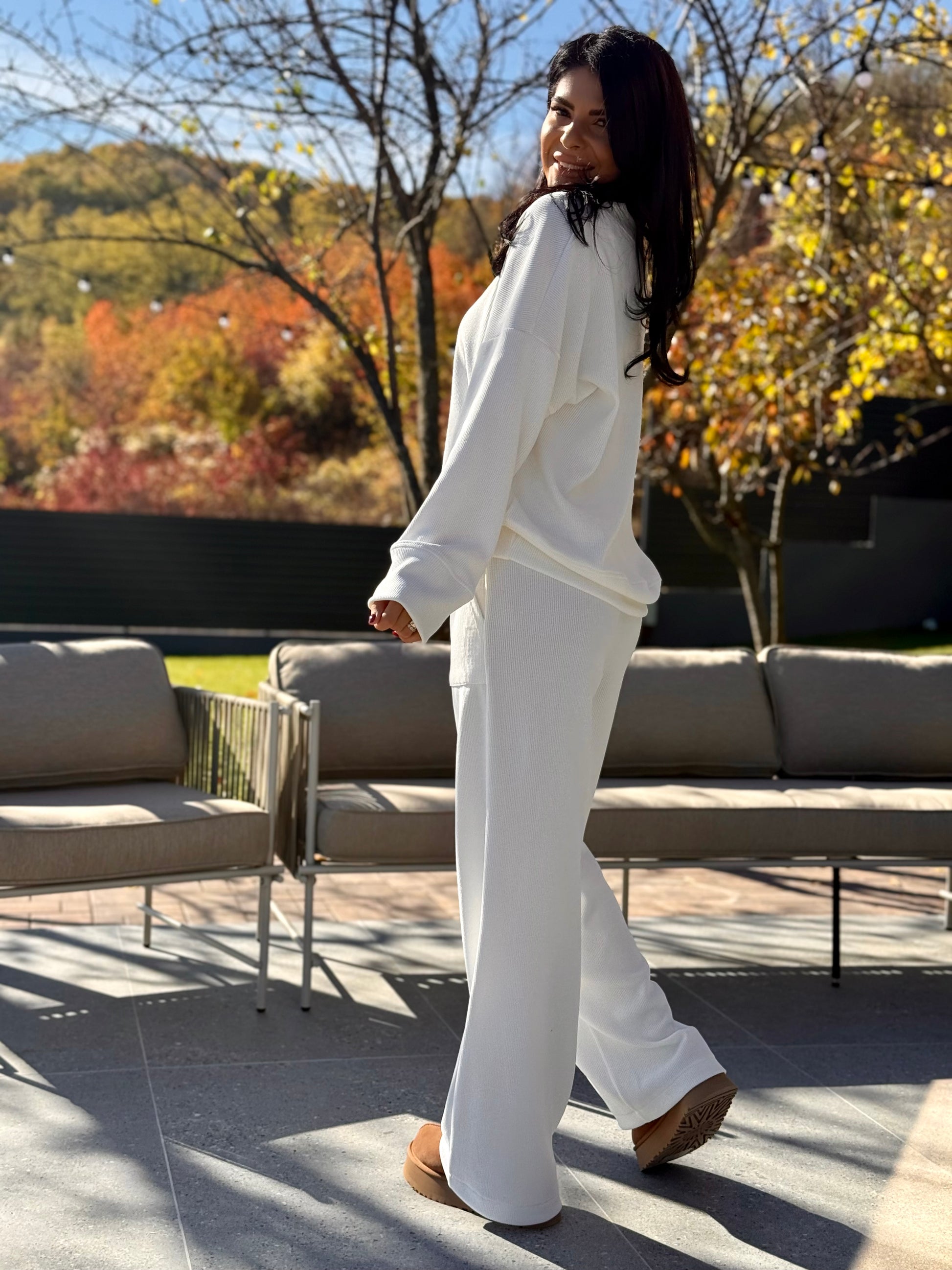 Un outfit cozy si rafinat, realizat dintr-o catifea velur moale, cu textura fina si placuta la atingere. Tesatura are o densitate ideala, oferind confort si stabilitate. Bluza are croiala lejera, cu maneci lungi si mansete late, iar pantalonii sunt prevazuti cu talie elastica si croi drept, ce alungeste silueta.