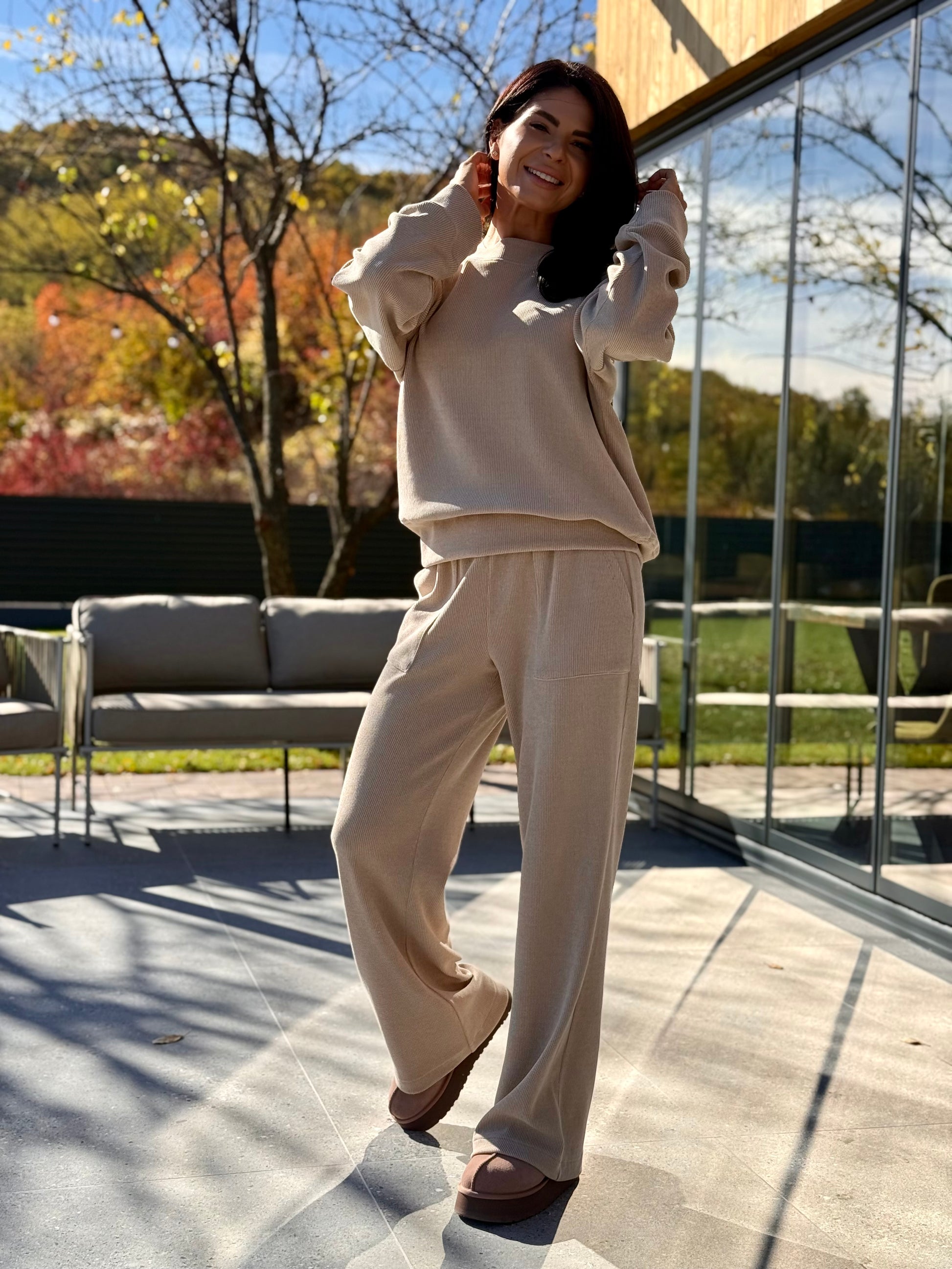 Un outfit cozy si rafinat, realizat dintr-o catifea velur moale, cu textura fina si placuta la atingere. Tesatura are o densitate ideala, oferind confort si stabilitate. Bluza are croiala lejera, cu maneci lungi si mansete late, iar pantalonii sunt prevazuti cu talie elastica si croi drept, ce alungeste silueta.