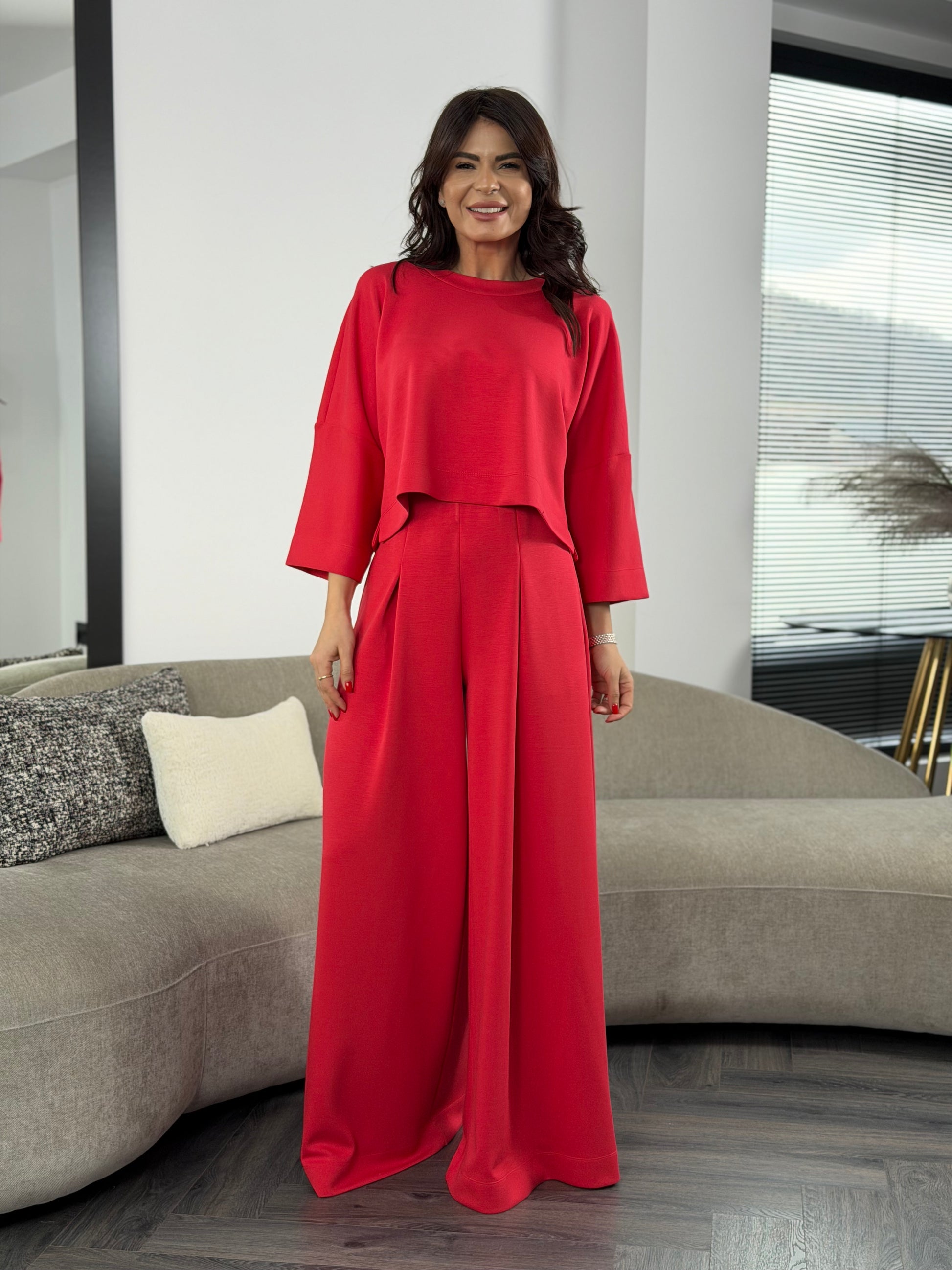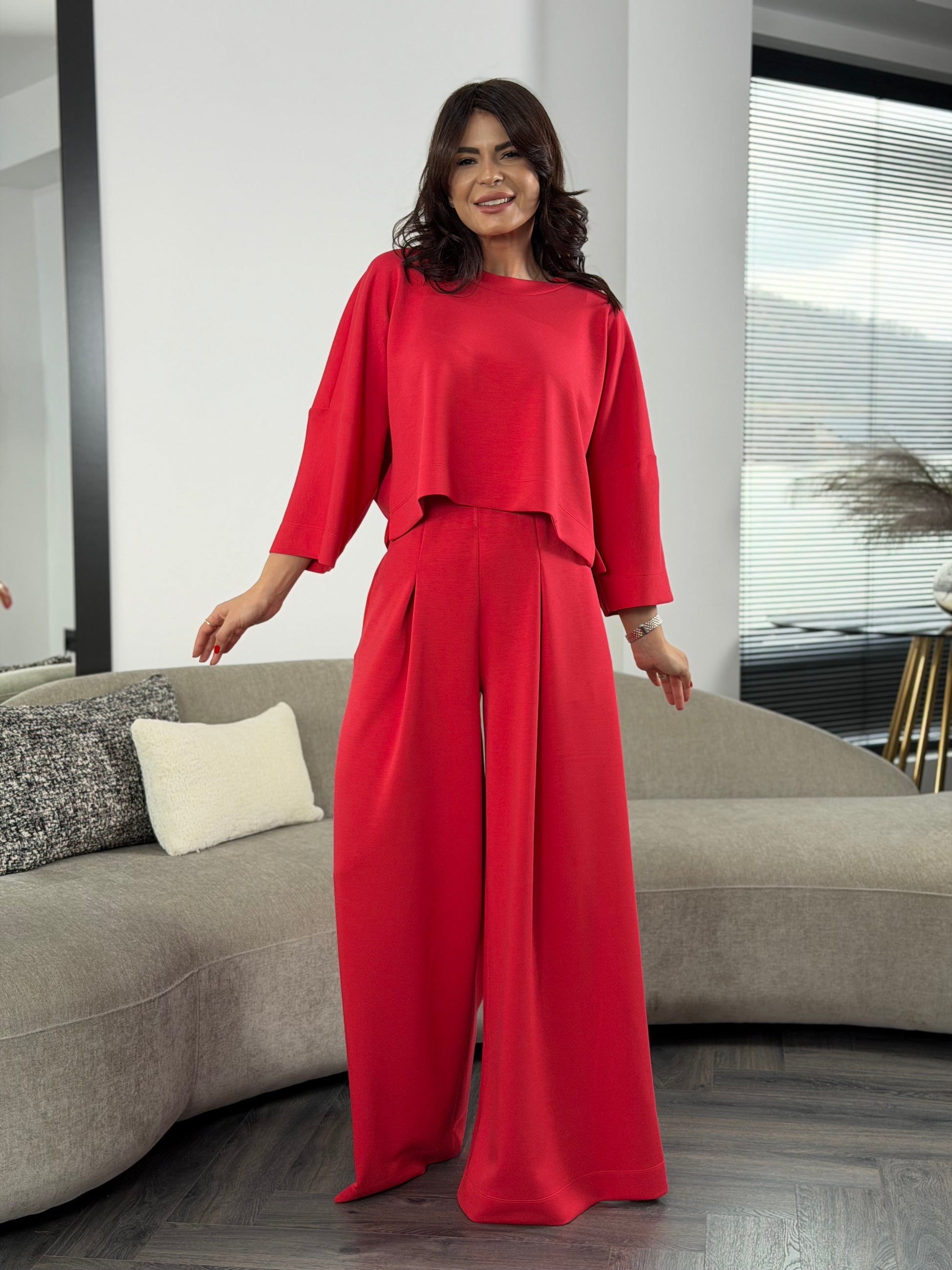 Un outfit care îmbină confortul absolut cu o siluetă feminină și modernă. Realizat din țesătură modal fină, moale la atingere și cu o cădere naturală impecabilă, setul oferă libertate de mișcare și un aspect rafinat în același timp.