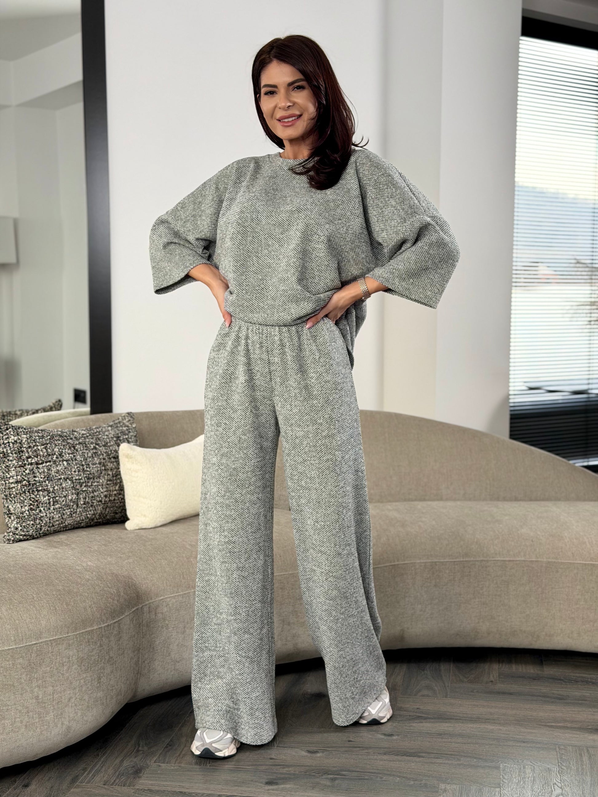 Textura fină creează un efect vizual elegant, fără a încărca ținuta, transformând acest set într-o alegere echilibrată între confort și stil.