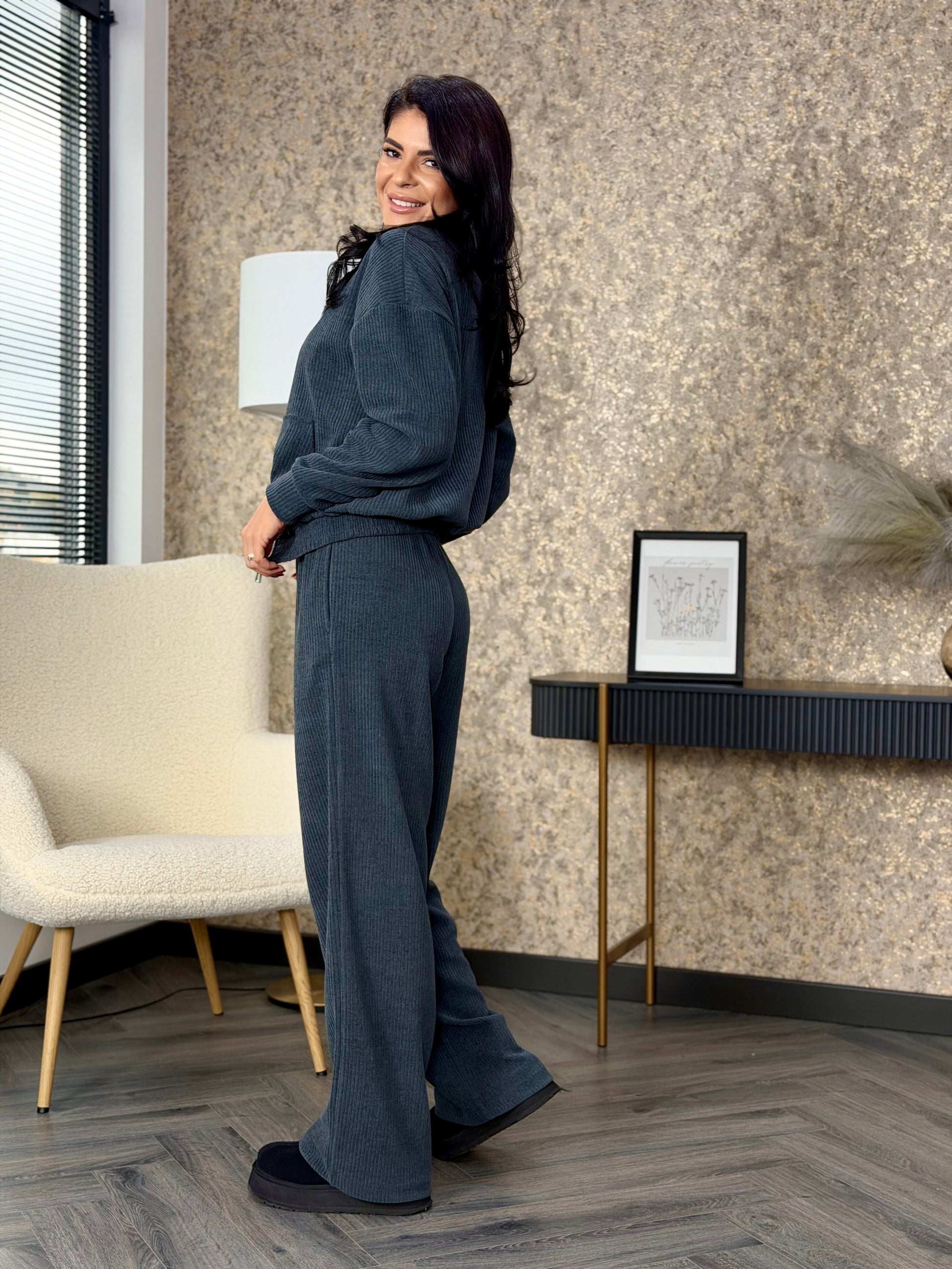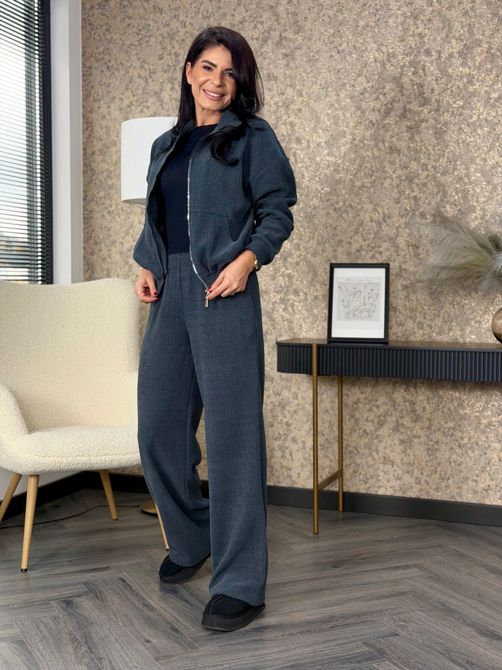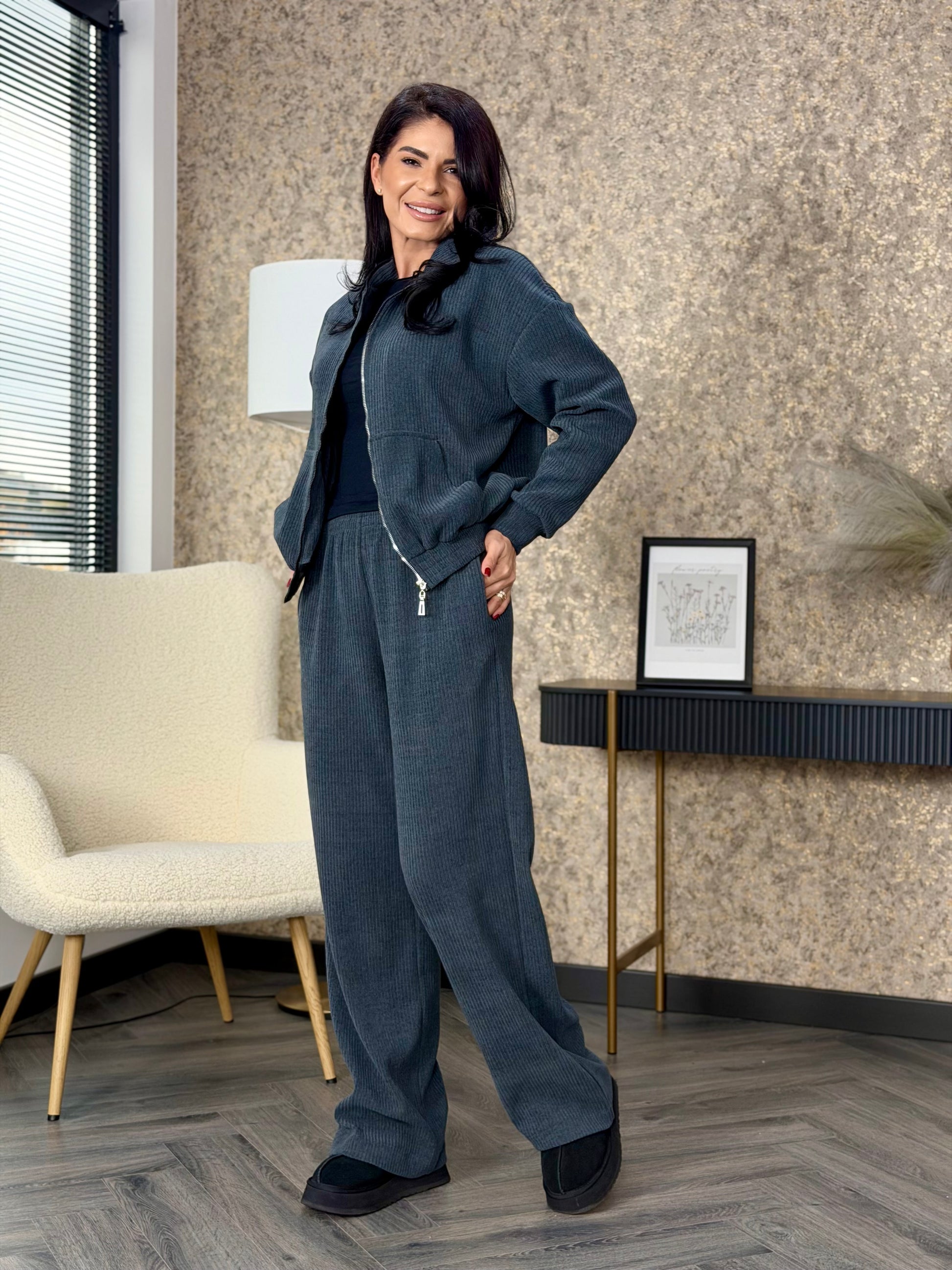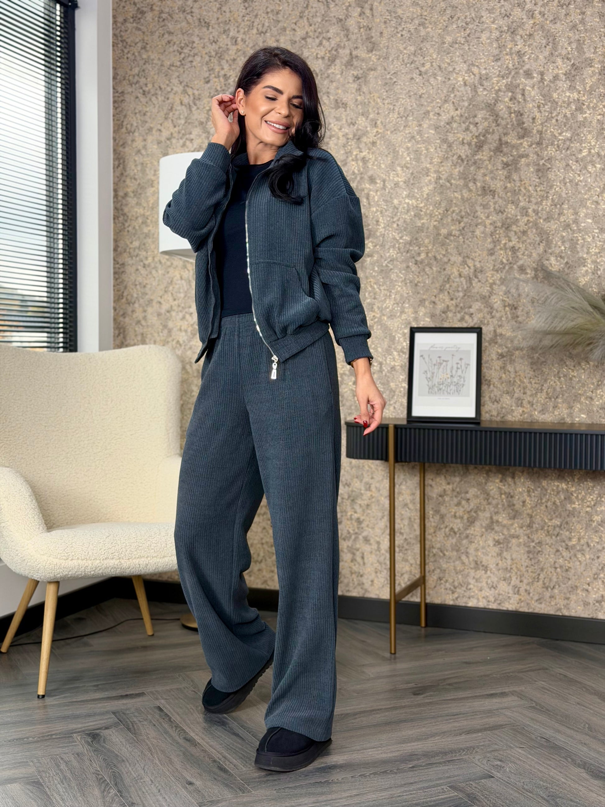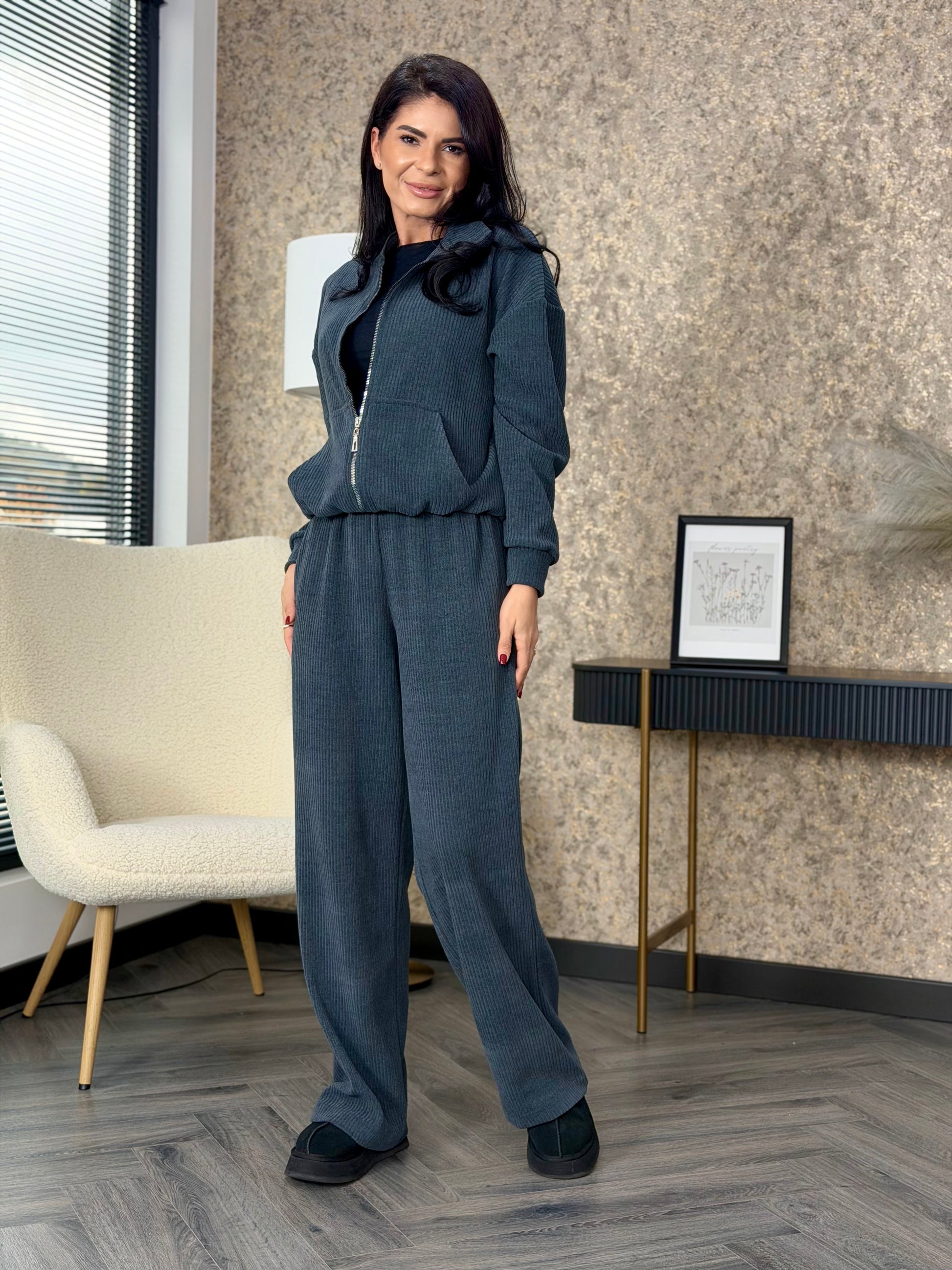 Costumul are o croiala lejera si moderna, ce imbina confortul cu stilul. Bluza este prevazuta cu fermoar frontal, bamda elastica, buzunare si guler, fiind ideala pentru un look casual si versatil. Pantalonii au talie elastica, tipar drept, fluid, care alungeste silueta si ofera libertate de miscare.