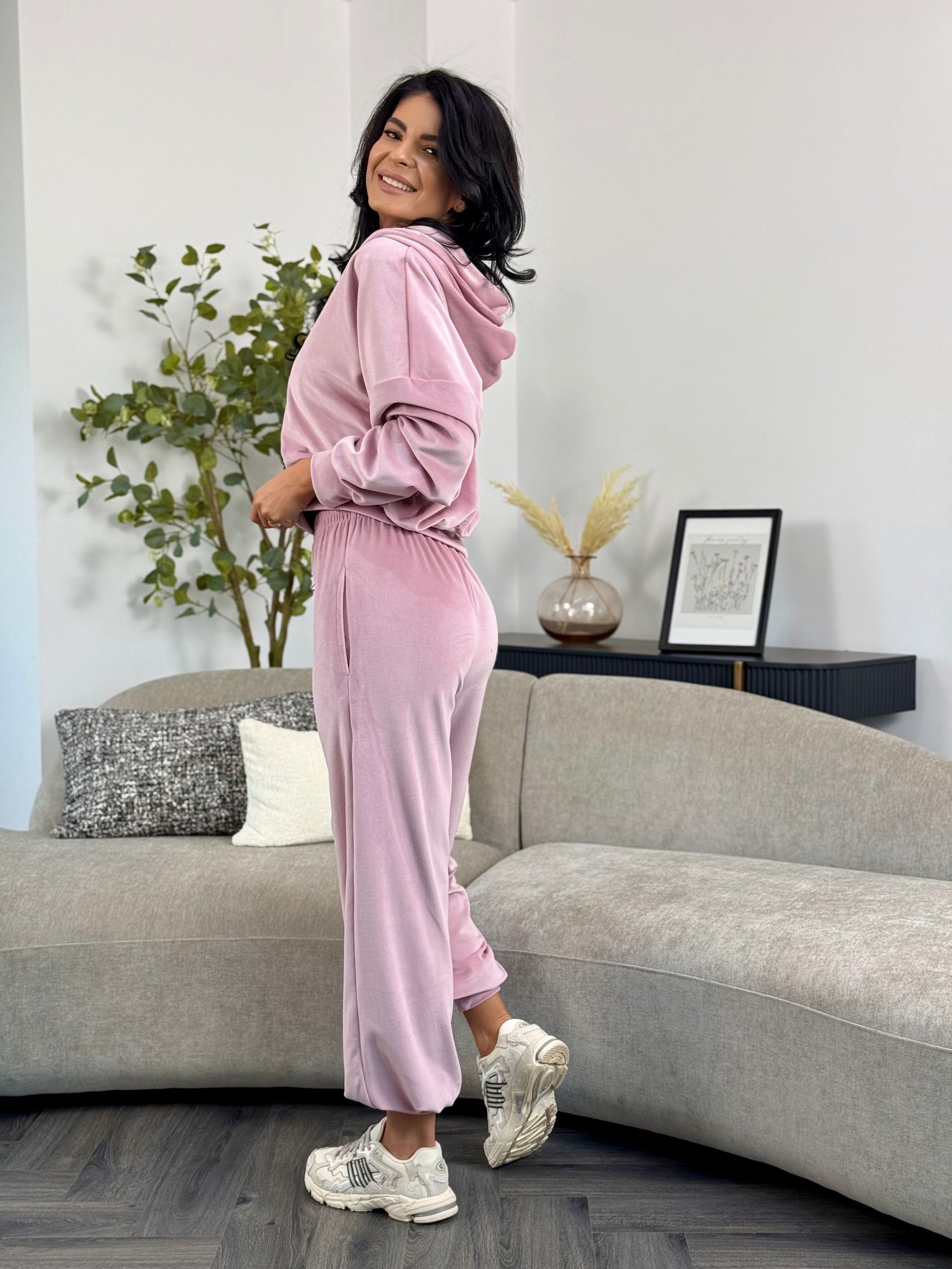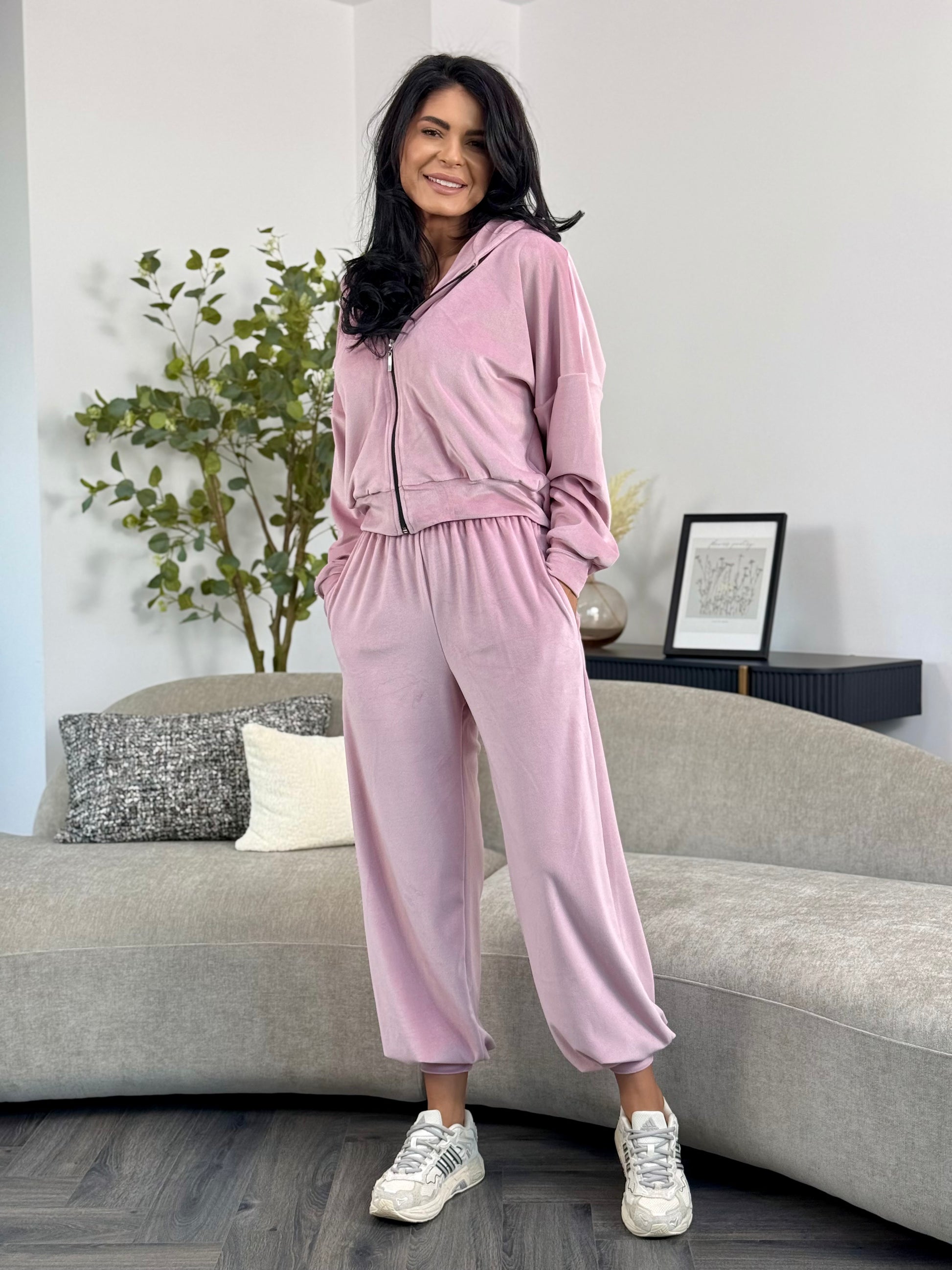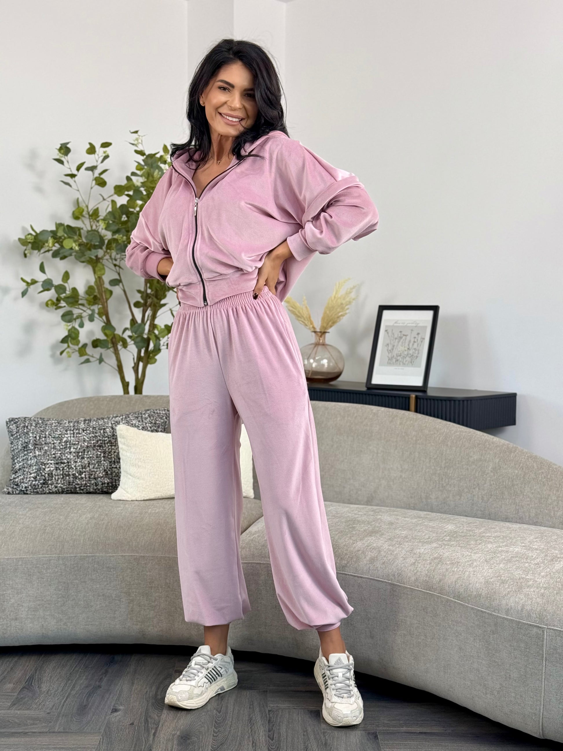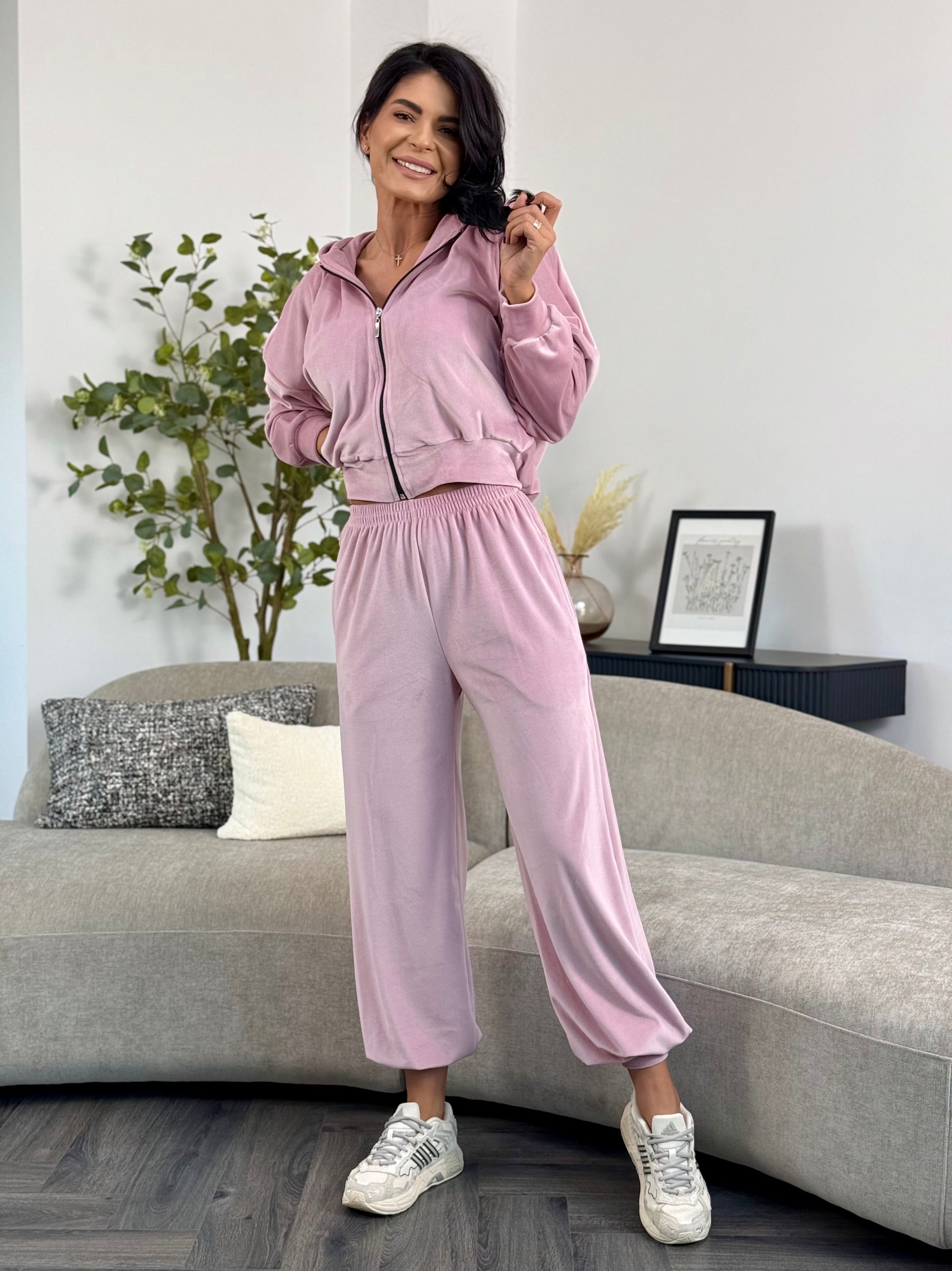 Un set modern și relaxat, realizat din catifea soft, cu textură fină și plăcută la atingere. Bluza are croială lejeră, tip hanorac, cu fermoar frontal și glugă practică, ce adaugă un aer casual și versatil. Pantalonii au talie elastică și croi lejer, cu terminație elastică la baza piciorului, ce conferă confort și libertate de mișcare.