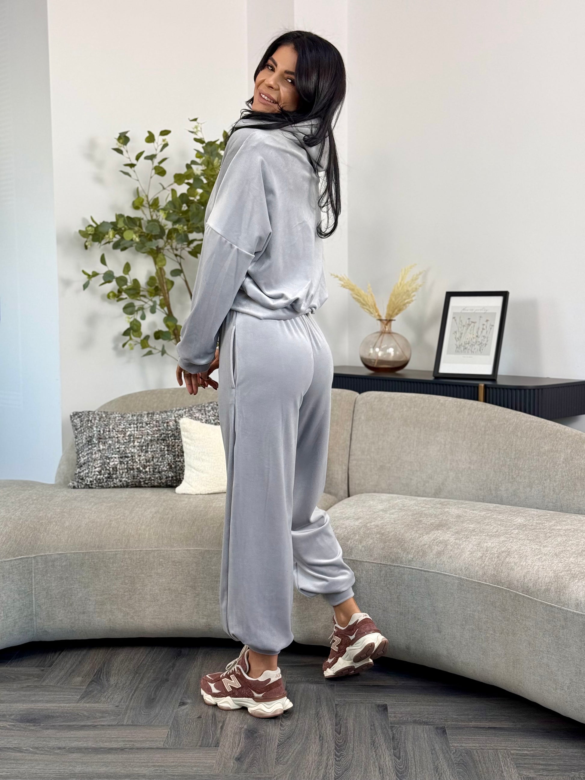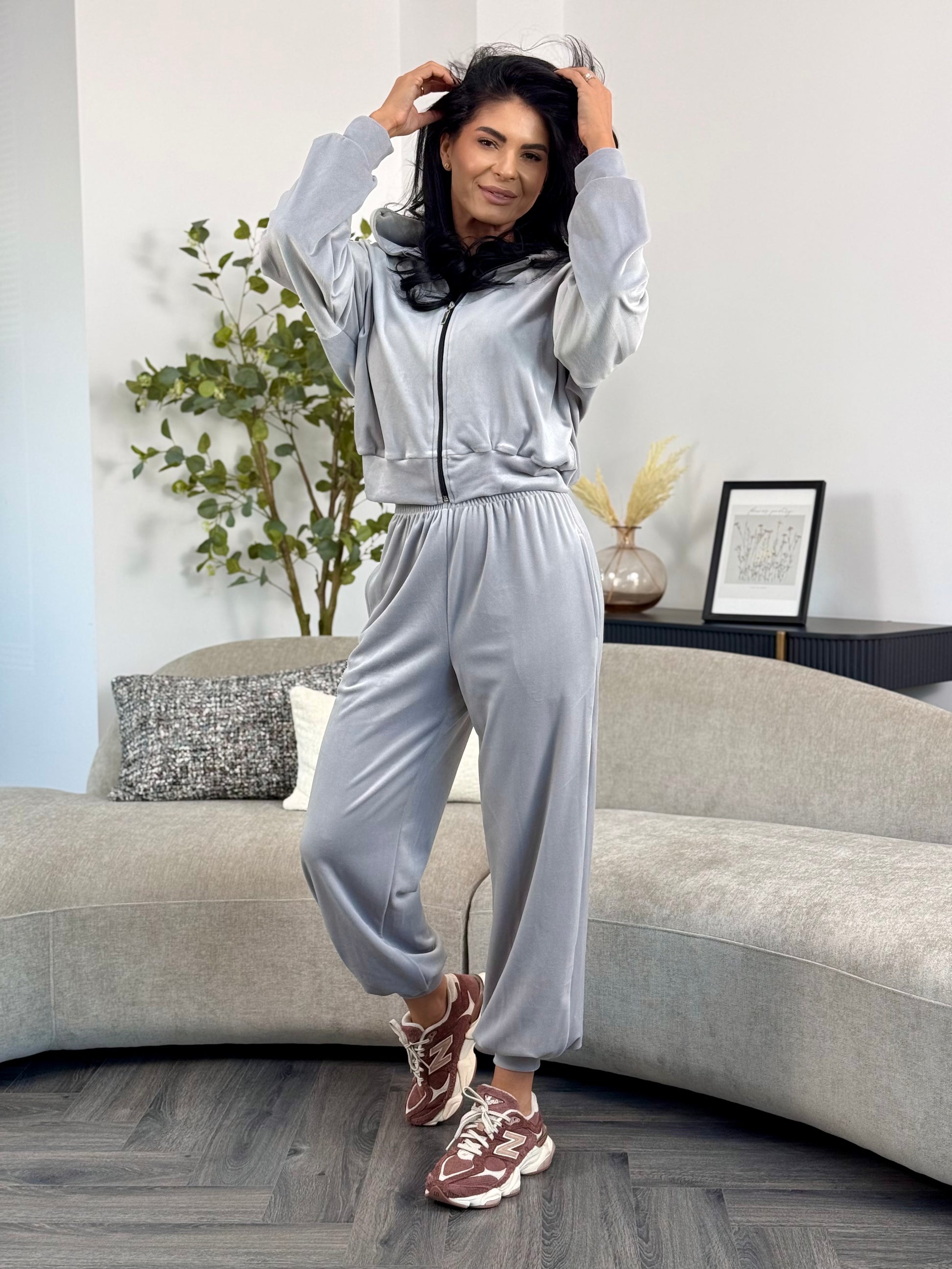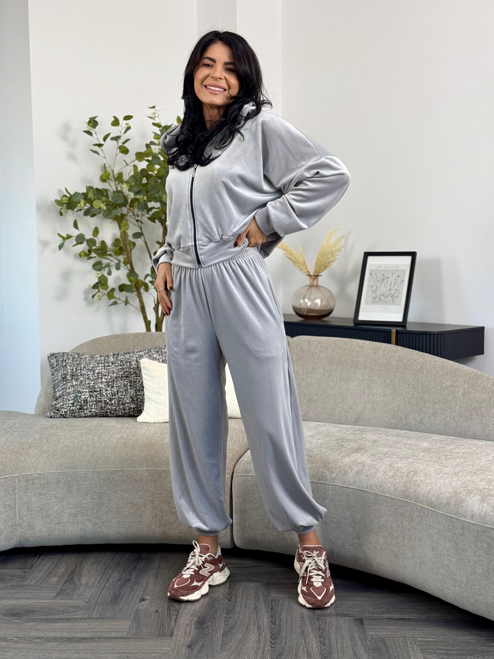 Un set modern și relaxat, realizat din catifea soft, cu textură fină și plăcută la atingere. Bluza are croială lejeră, tip hanorac, cu fermoar frontal și glugă practică, ce adaugă un aer casual și versatil. Pantalonii au talie elastică și croi lejer, cu terminație elastică la baza piciorului, ce conferă confort și libertate de mișcare.