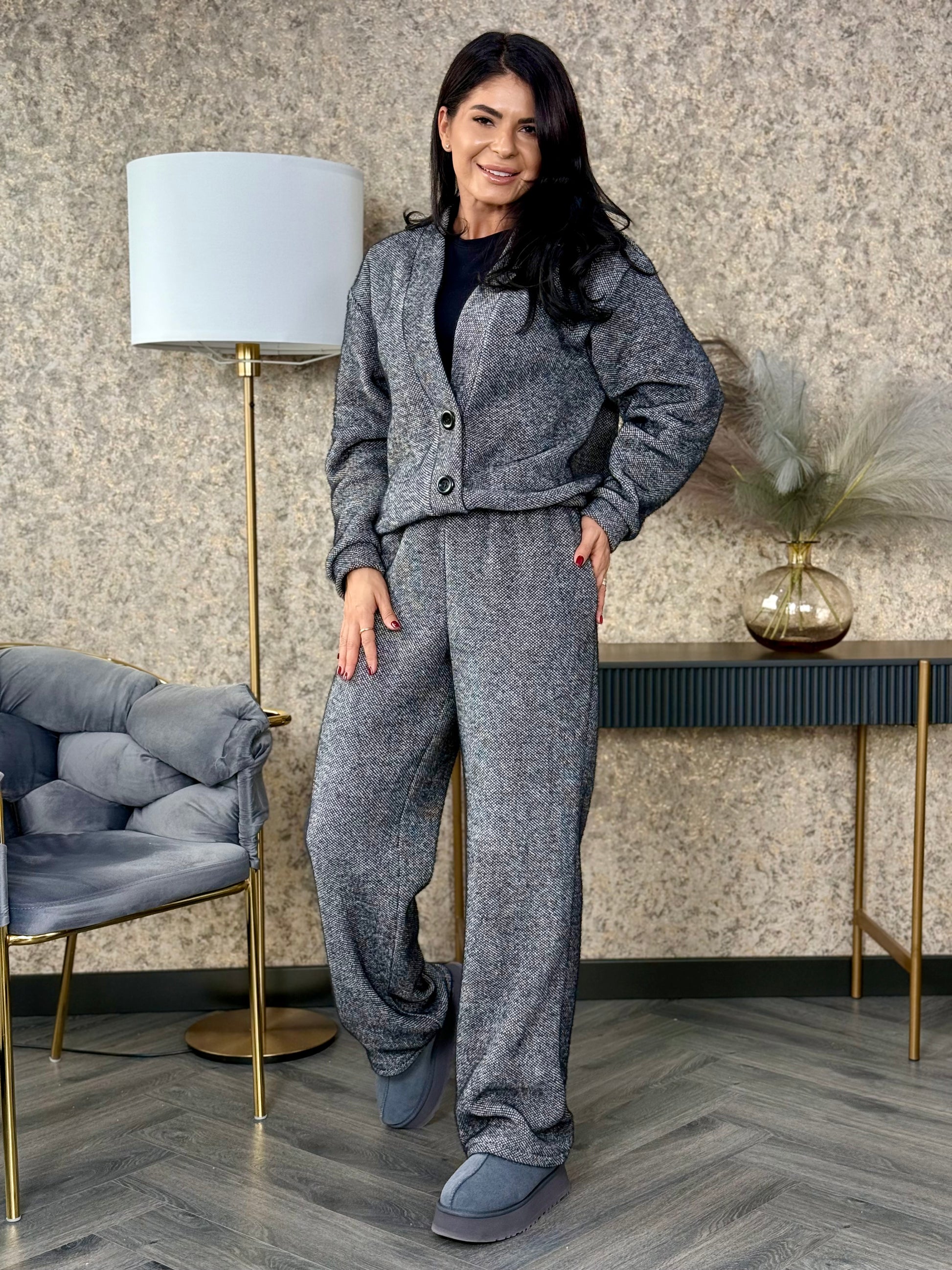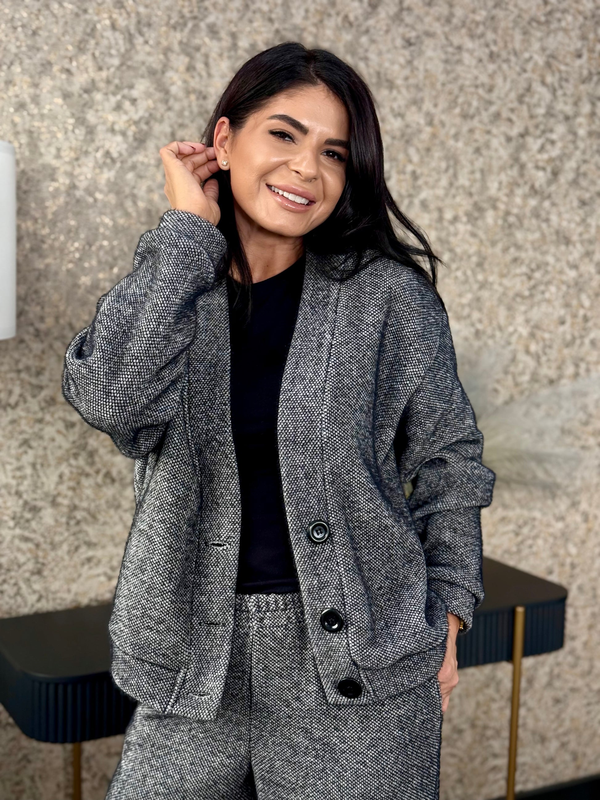 Set din material pufos, moale și plăcut la atingere, ideal pentru sezonul rece. Materialul gros oferă confort termic și un look elegant-relaxat. Bluza are croială lejeră, de tip cardigan, cu 3 nasturi de închidere și decolteu în V, iar pantalonii au talie elastică și croi drept, ce alungește silueta.