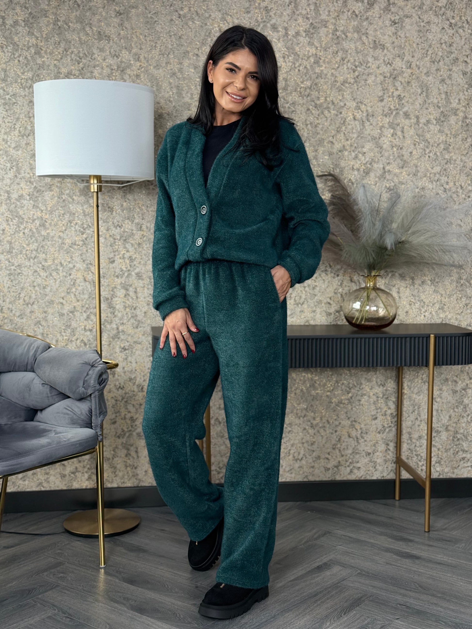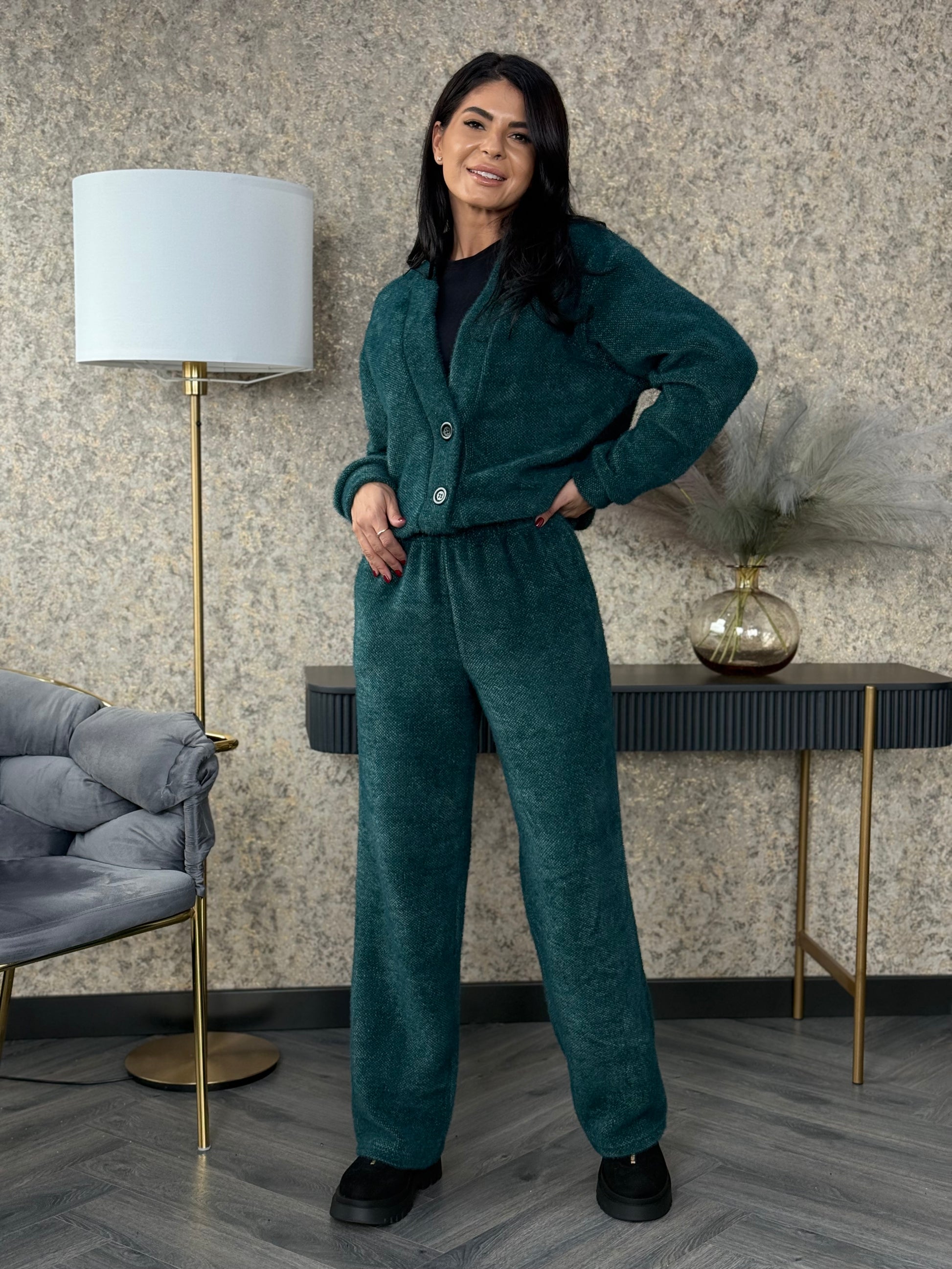 Set din material pufos, moale și plăcut la atingere, ideal pentru sezonul rece. Materialul gros oferă confort termic și un look elegant-relaxat. Bluza are croială lejeră, de tip cardigan, cu 3 nasturi de închidere și decolteu în V, iar pantalonii au talie elastică și croi drept, ce alungește silueta.