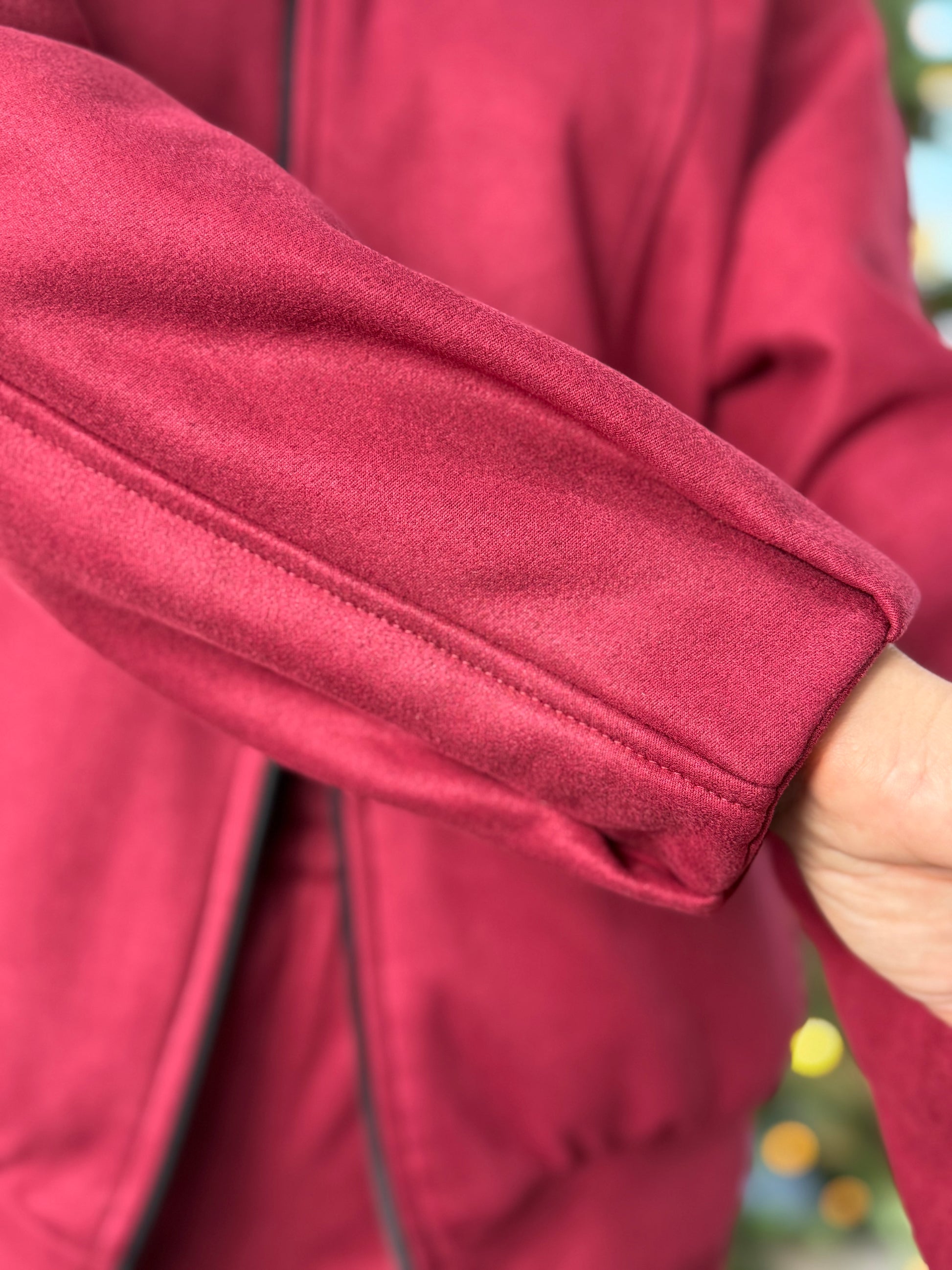 Acest costum este realizat dintr-o imitatie de piele intoarsa , finish mat, extrem de placut la atingere. Interiorul este captusit cu material plusat moale, care ofera o senzatie cozy in sezonul rece.