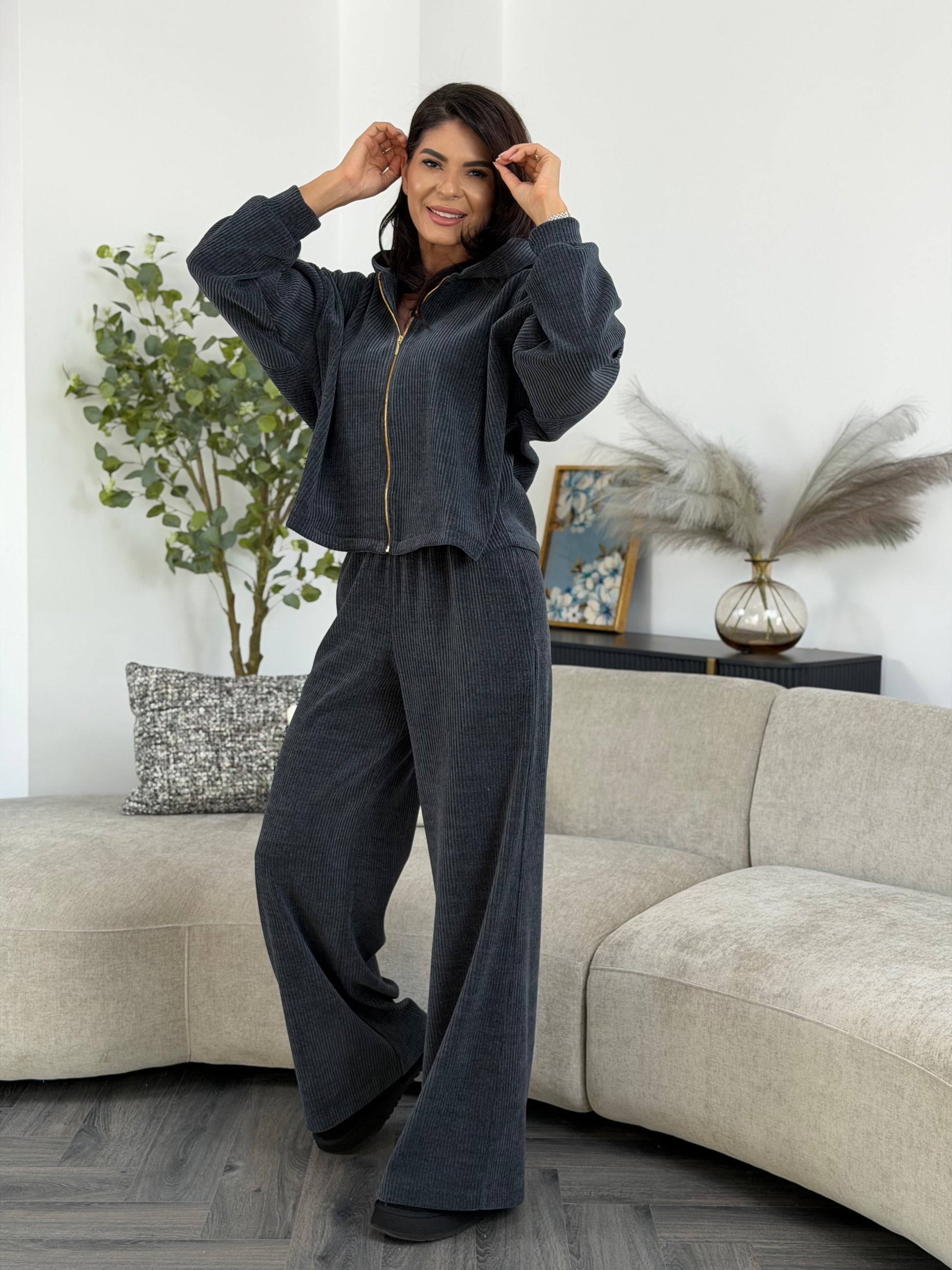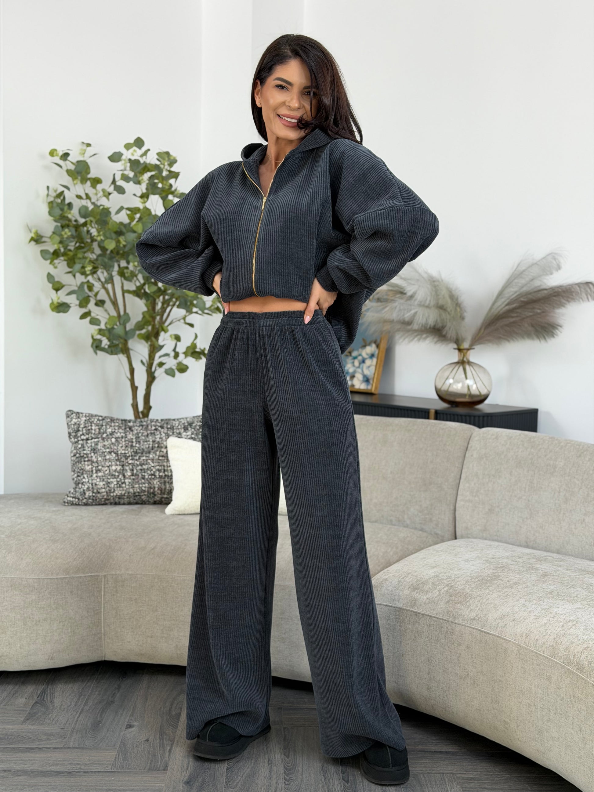 Set realizat din catifea reiat moale și plăcută la atingere, cu textură fină ce oferă profunzime culorii și un aspect elegant, dar relaxat. Materialul are o cădere naturală și asigură confort sporit, fiind ideal pentru purtare zilnică, ținute casual-chic sau momente în care îți dorești un look sofisticat, fără efort.