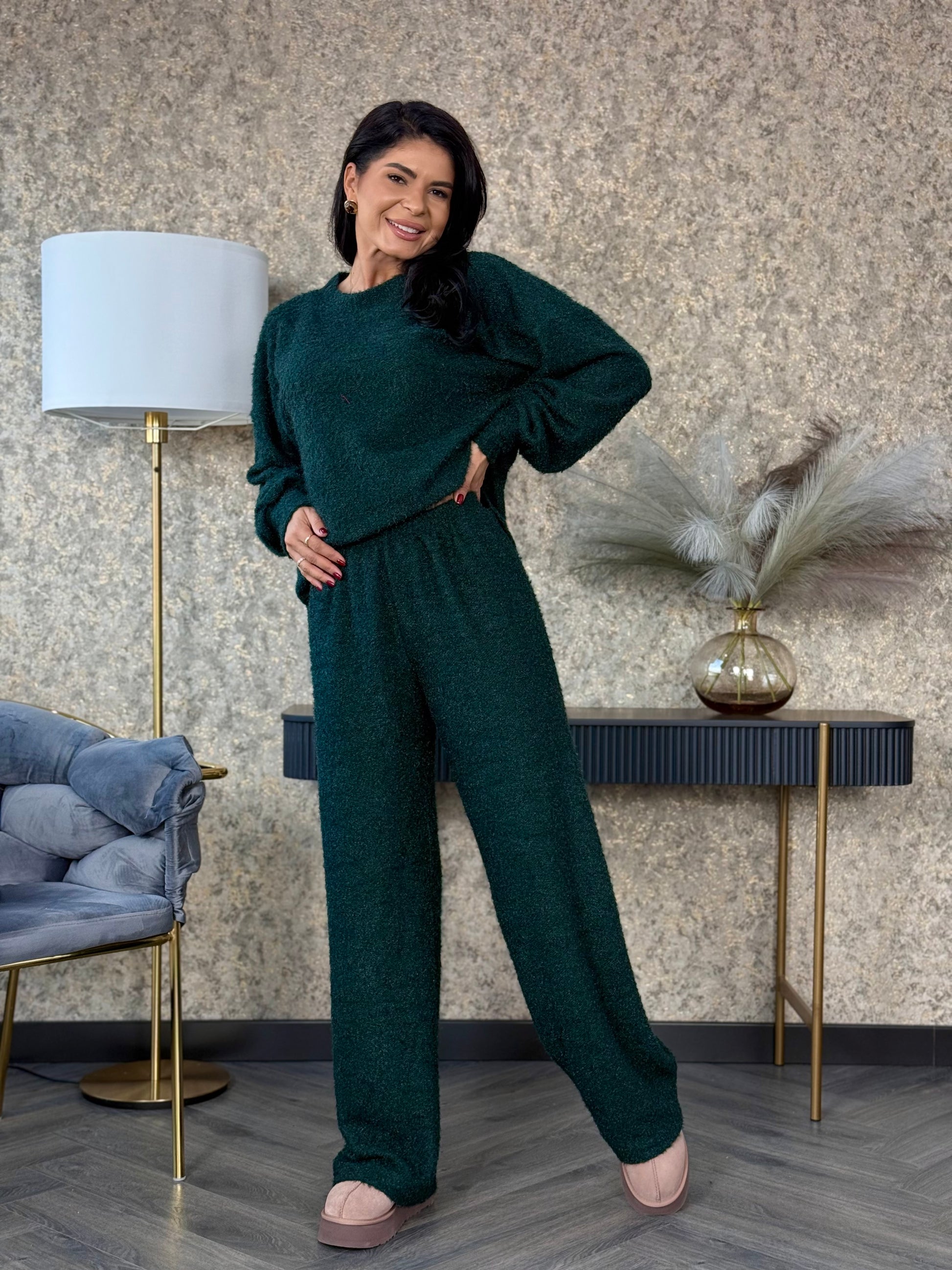 Set din tricot pufos, moale și plăcut la atingere, ideal pentru zilele răcoroase. Materialul cald și confortabil oferă o senzație plăcută la purtare, menținând în același timp un look elegant și relaxat. Bluza are croială lejeră, mâneci lungi și fente laterale discrete, iar pantalonii au talie elastică și croi drept, ce alungește silueta.