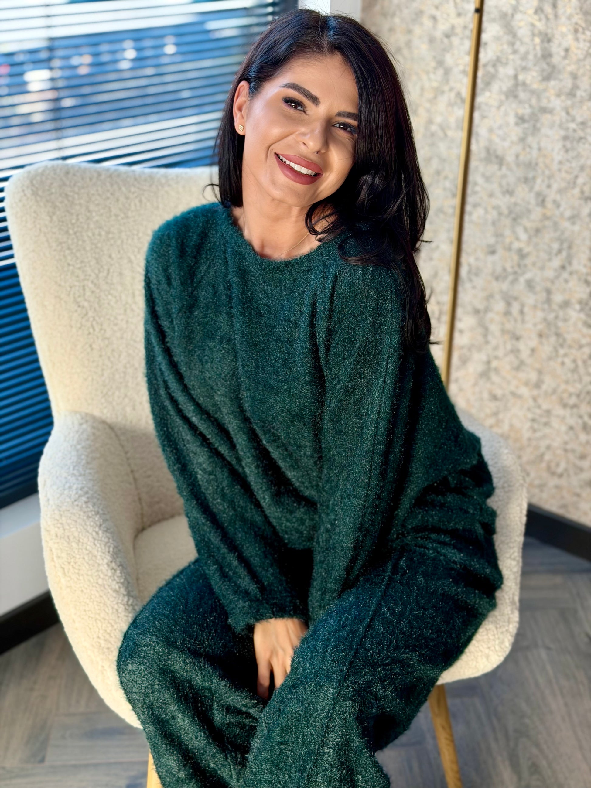 Acest set este alegerea perfectă pentru zilele în care vrei să te simți relaxată, dar să arăți impecabil. Realizat dintr-un material moale și pufos, oferă o senzație plăcută la atingere și un confort desăvârșit pe tot parcursul zilei.