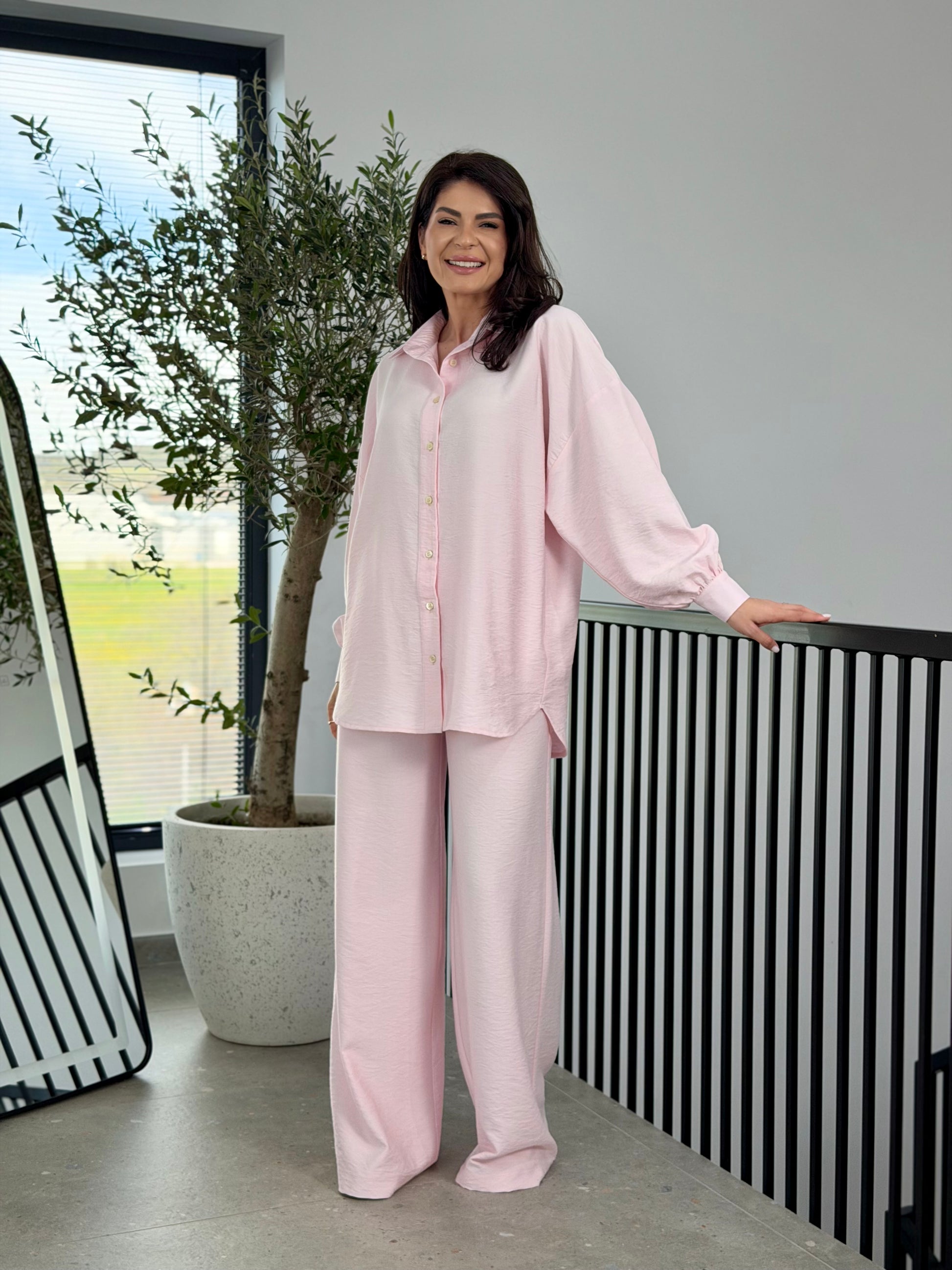 Setul este construit pe un tipar lejer, modern, care pune accent pe confort și fluiditate. Cămașa are croi oversize, cu linie relaxată și mâneci ușor bufante, oferind un aer sofisticat, dar effortless. Pantalonii sunt cu talie înaltă și croi amplu, tip wide-leg, alungind vizual silueta și oferind libertate de mișcare. Întregul outfit creează un echilibru perfect între elegant și casual.
