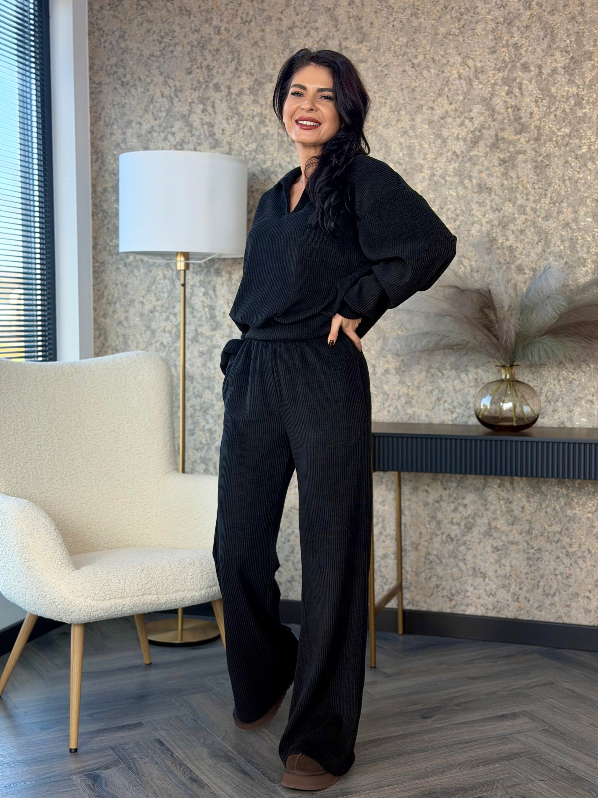 Un outfit modern si versatil, realizat dintr-o catifea reiata moale, cu textura placuta la atingere si aspect elegant. Bluza are croiala lejera, guler si maneci lungi, oferind libertate de miscare si un aer relaxat.