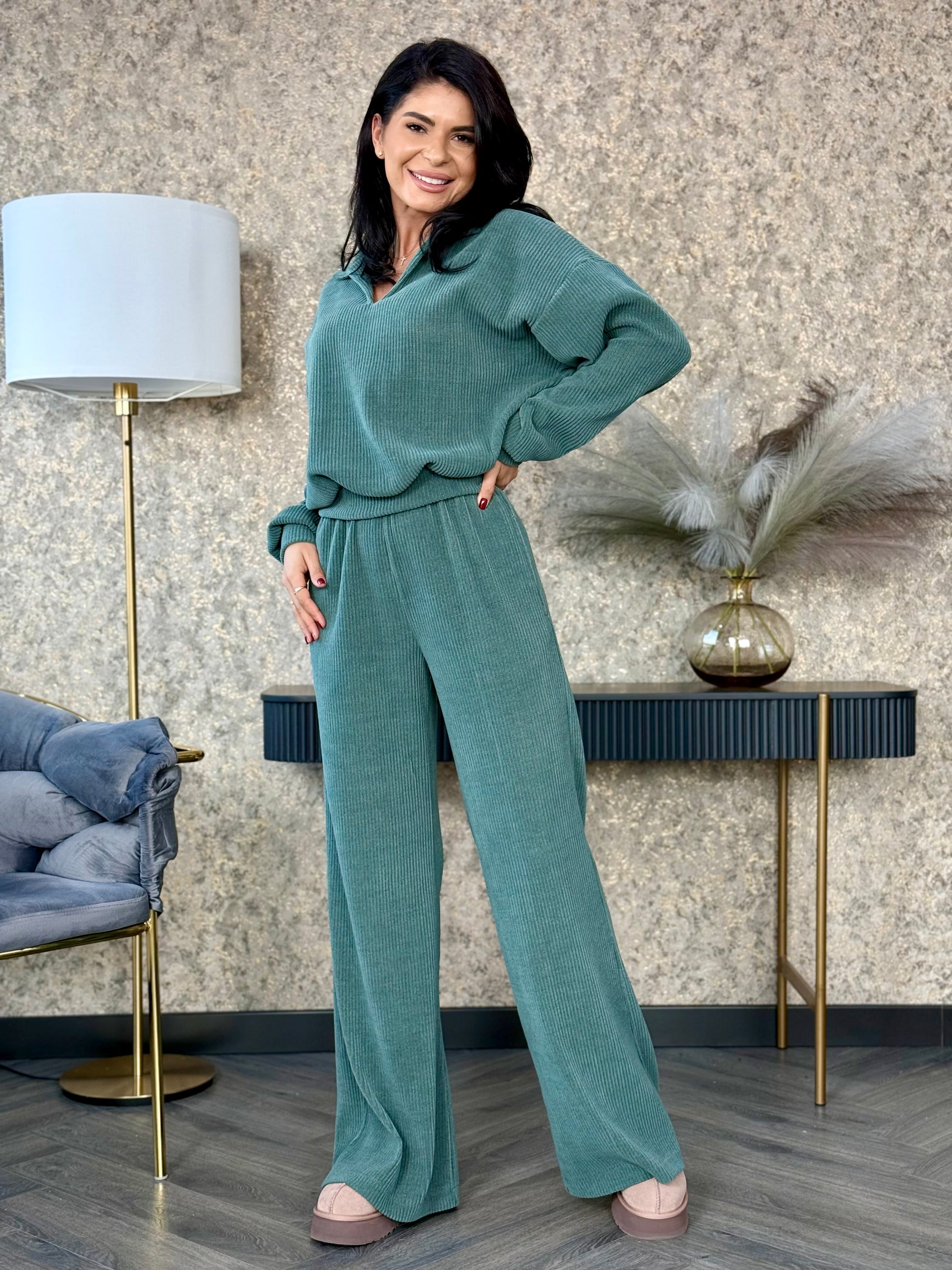 Un outfit modern si versatil, realizat dintr-o catifea reiata moale, cu textura placuta la atingere si aspect elegant. Bluza are croiala lejera, guler si maneci lungi, oferind libertate de miscare si un aer relaxat.