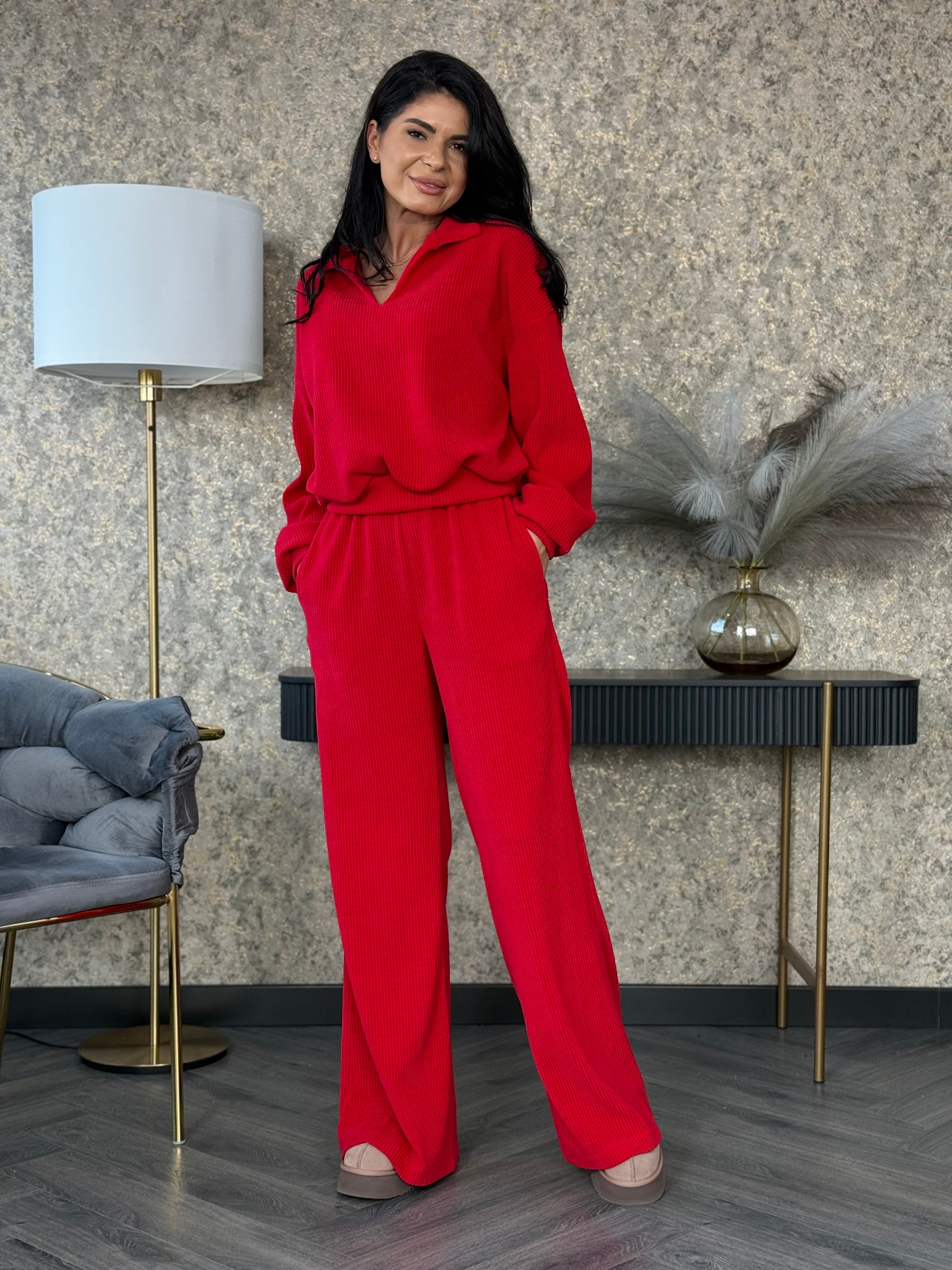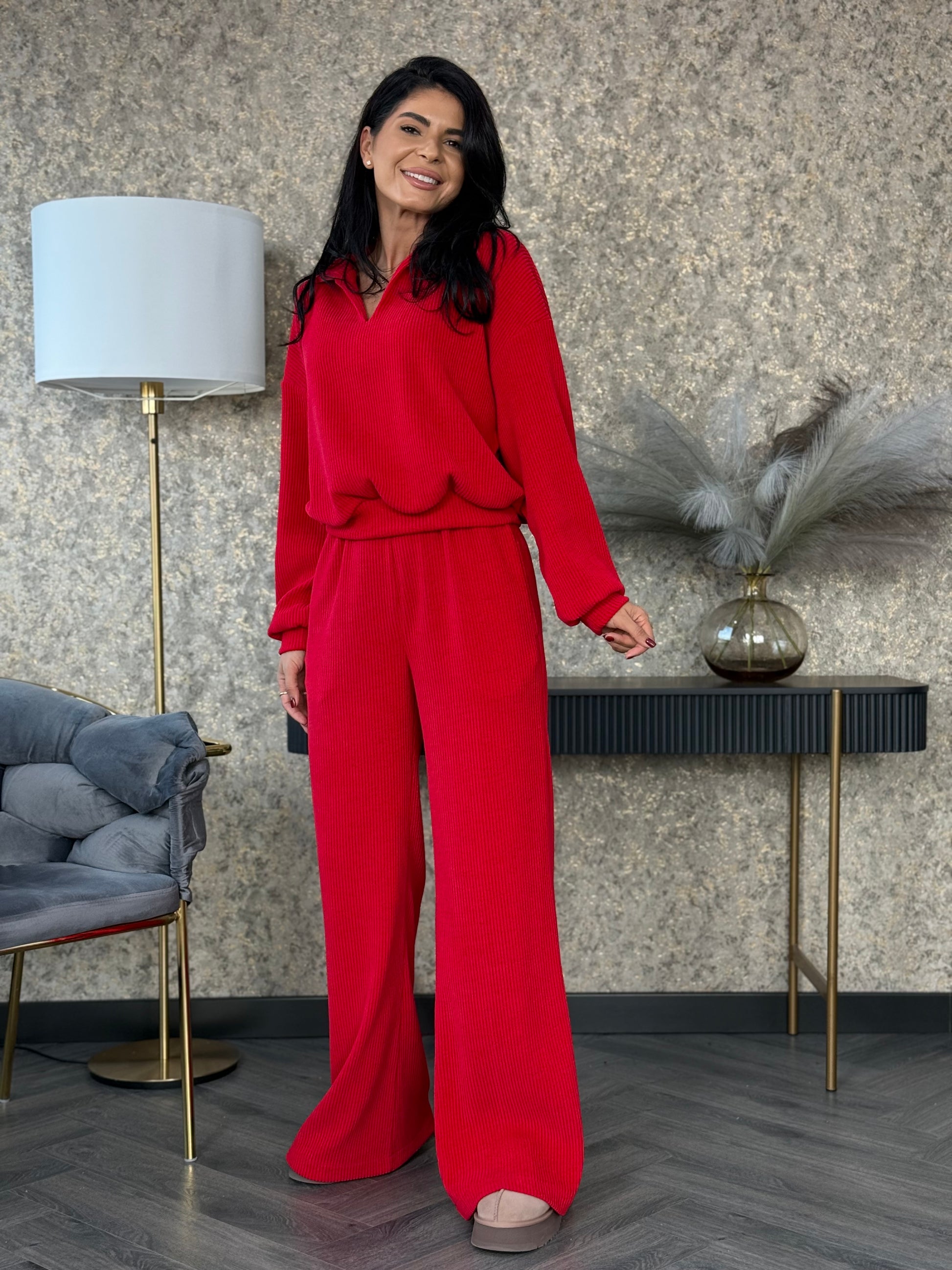 Un outfit modern si versatil, realizat dintr-o catifea reiata moale, cu textura placuta la atingere si aspect elegant. Bluza are croiala lejera, guler si maneci lungi, oferind libertate de miscare si un aer relaxat.