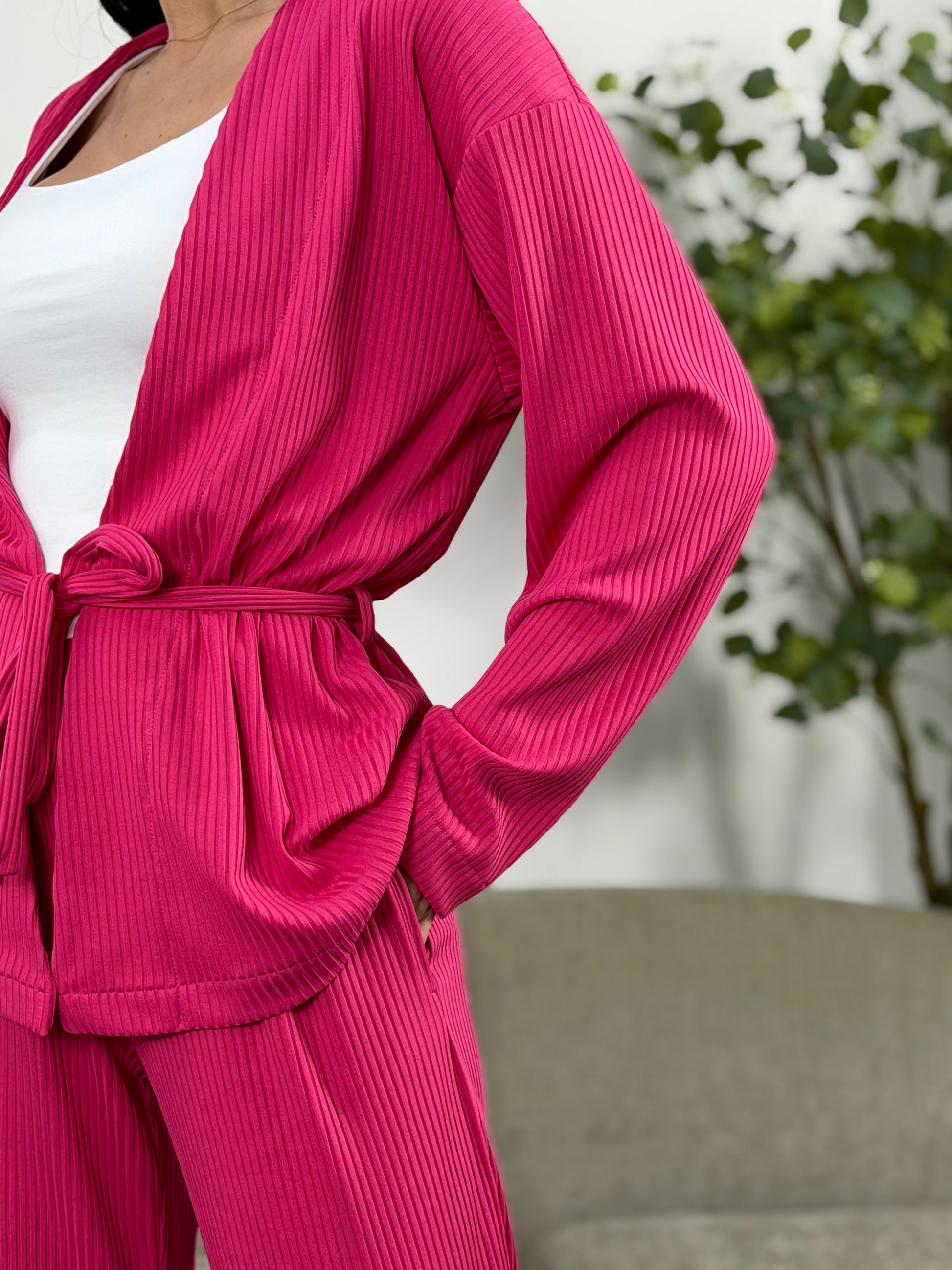 Setul impresionează printr-un design modern, echilibrat între confort și estetică. Realizat dintr-o țesătură cu nervuri fine, setul are un aspect lejer, dar bine definit, potrivit atât pentru ținute casual, cât și pentru apariții relaxate, cu stil.