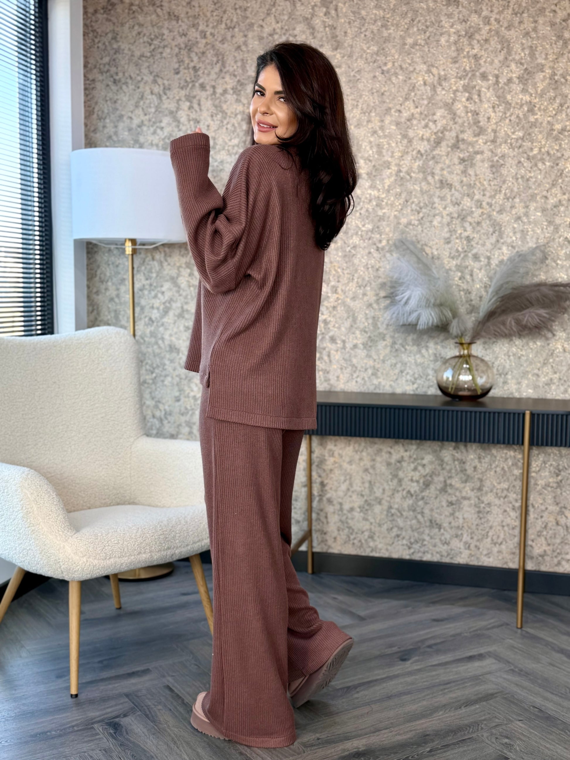 Un set realizat din tricot moale, cu textură gofrată și cădere naturală, creat pentru confort și stil în același timp. Bluza are un croi lejer, ușor oversized, cu decolteu în V și mâneci lungi, oferind un look relaxat, modern și feminin. Pantalonii au croi drept, wide-leg, cu talie confortabilă, alungind vizual silueta și asigurând libertate de mișcare. Un outfit versatil, ideal pentru purtare zilnică, care poate fi ales ca set pentru un efect minimalist și elegant sau purtat separat, integrat ușor în ținute casual-chic, de birou sau pentru momentele în care îți dorești o apariție simplă, dar rafinată.