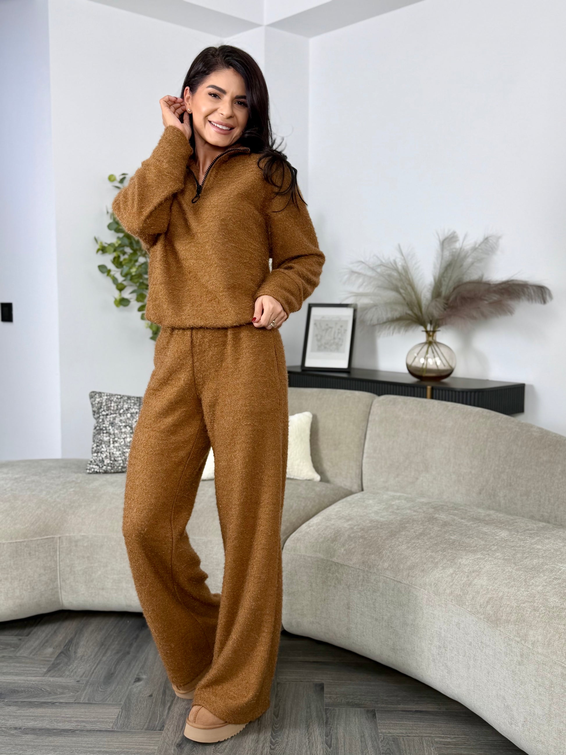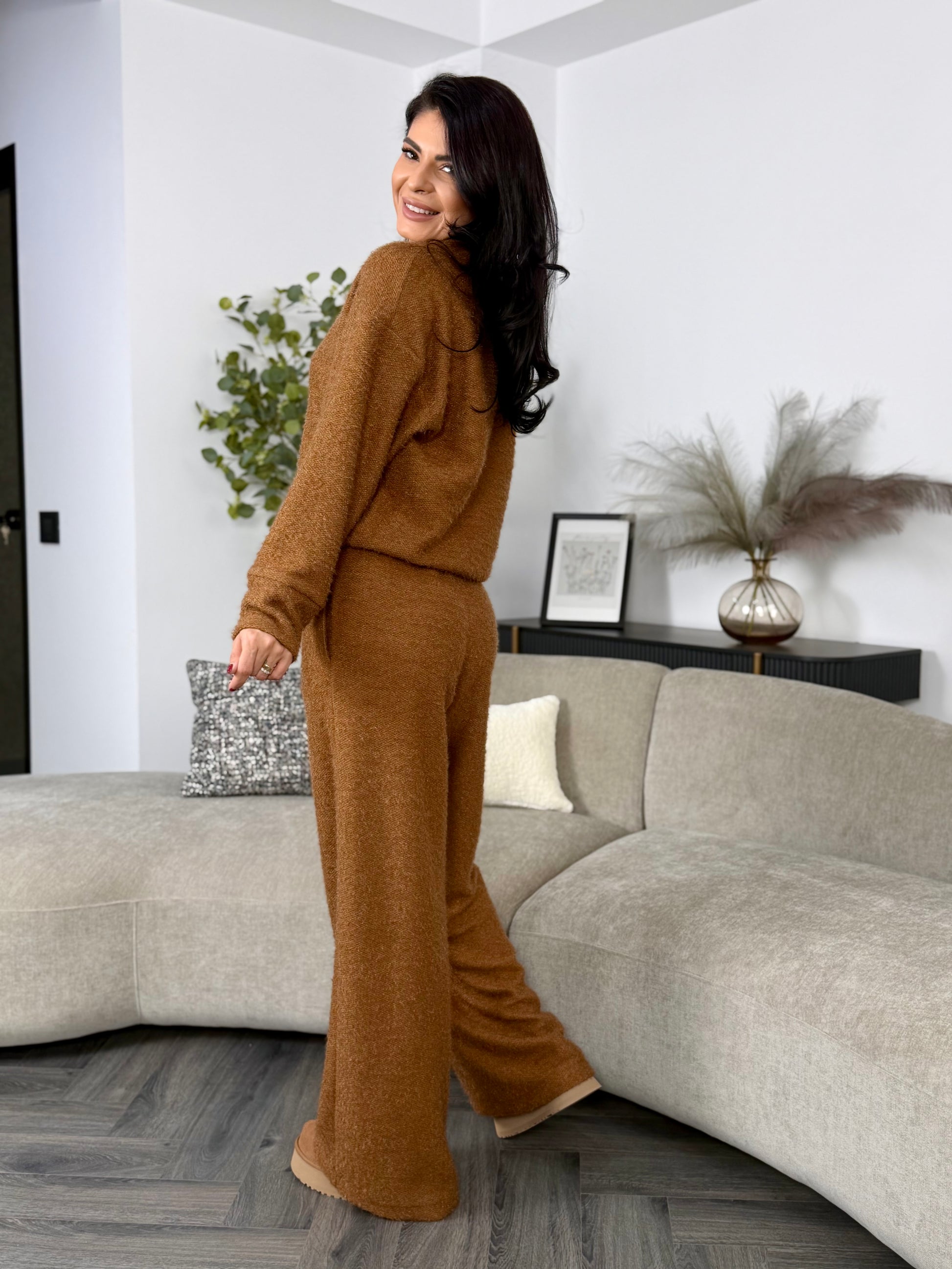 Un outfit cozy-chic, realizat dintr-o țesătură pufoasă și densă, perfectă pentru sezonul rece. Croiala lejeră și textura moale conferă un aer relaxat, dar sofisticat, ideal pentru un look effortless.