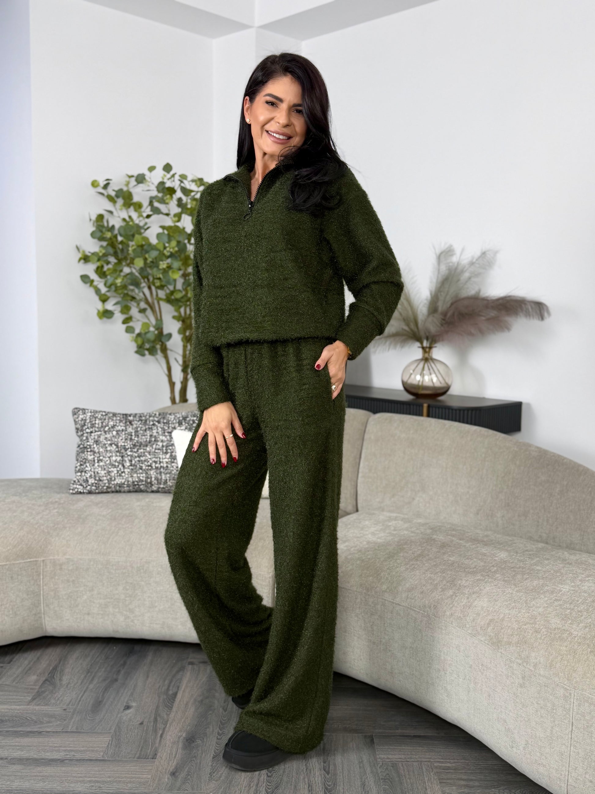 Un outfit cozy-chic, realizat dintr-o țesătură pufoasă și densă, perfectă pentru sezonul rece. Croiala lejeră și textura moale conferă un aer relaxat, dar sofisticat, ideal pentru un look effortless.
