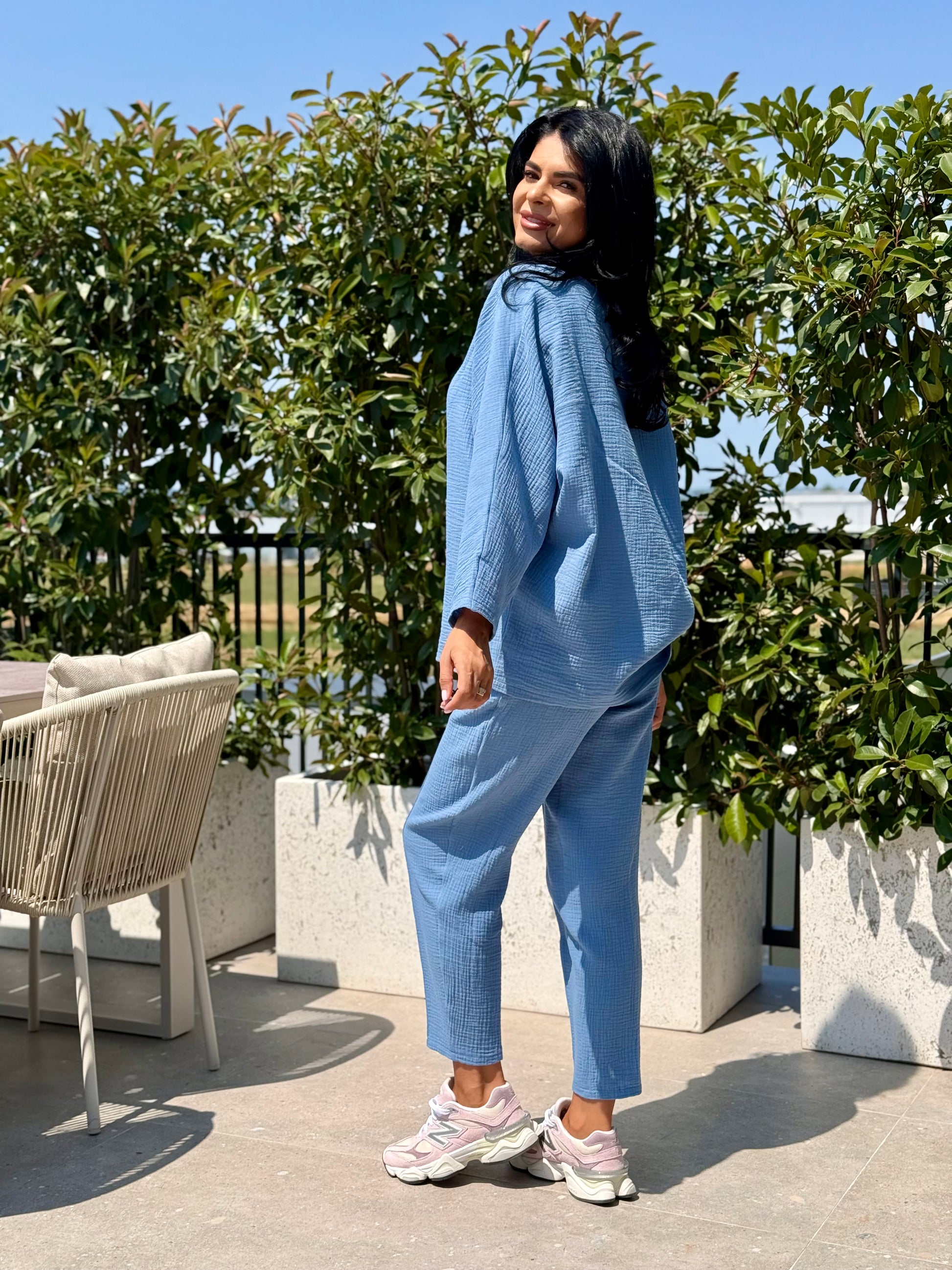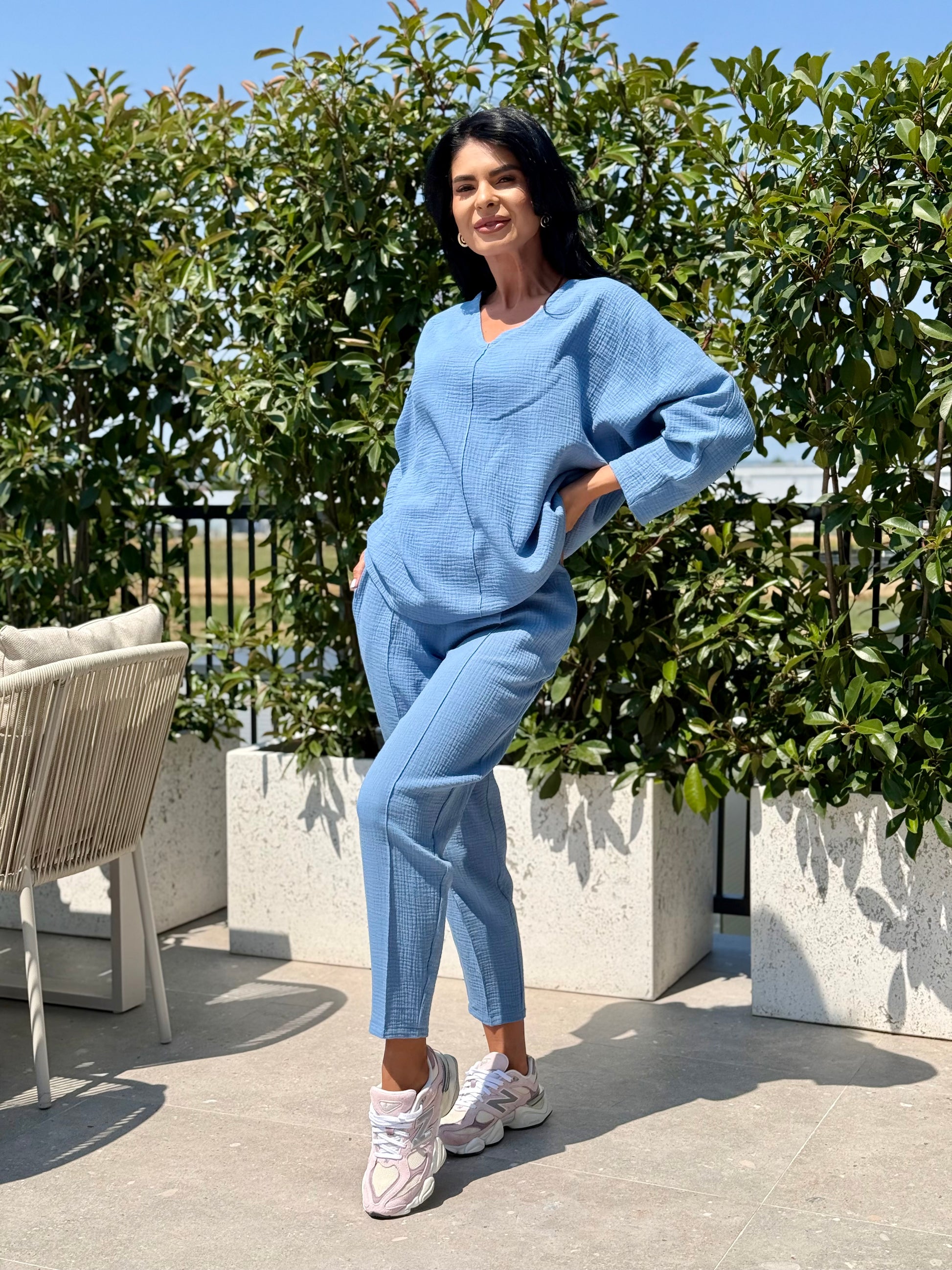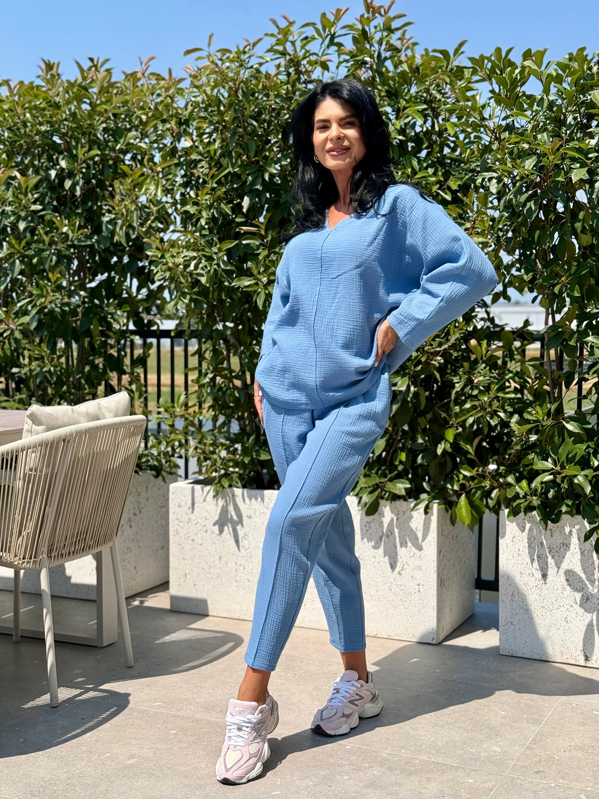 Costum din tesatura muselina dublu-gofrata, cu textura fina si usoara. Bluza are croi lejer, maneci lungi si decolteu in V, iar pantalonii sunt conici, cu talie elastica si cusaturi discrete pentru un plus de structura. Un outfit comod si stilat, ideal pentru tinutele de zi sau escapadele urbane.