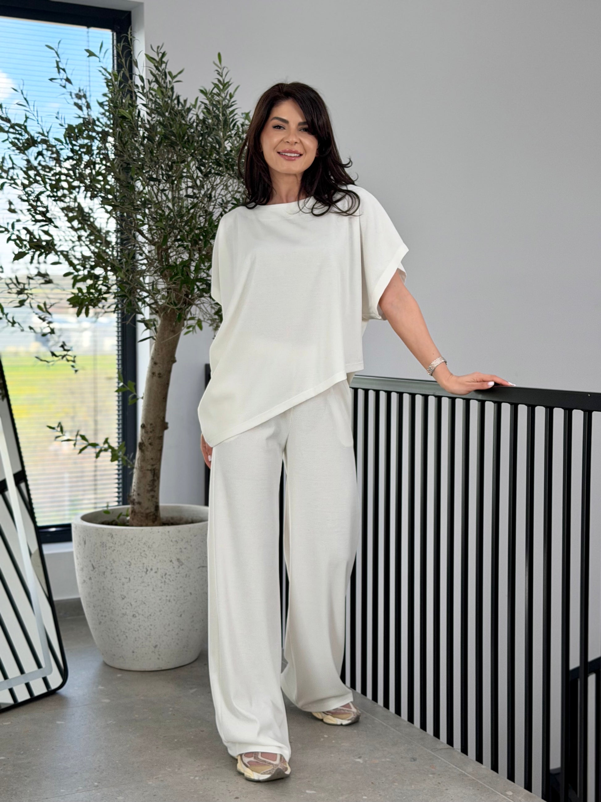 Pantalonii sunt cu talie înaltă și elastică, având un croi amplu, drept (wide-leg), care alungește vizual silueta și oferă libertate de mișcare. Întregul tipar creează un outfit echilibrat, ușor de purtat, care îmbină confortul cu un look feminin și modern.