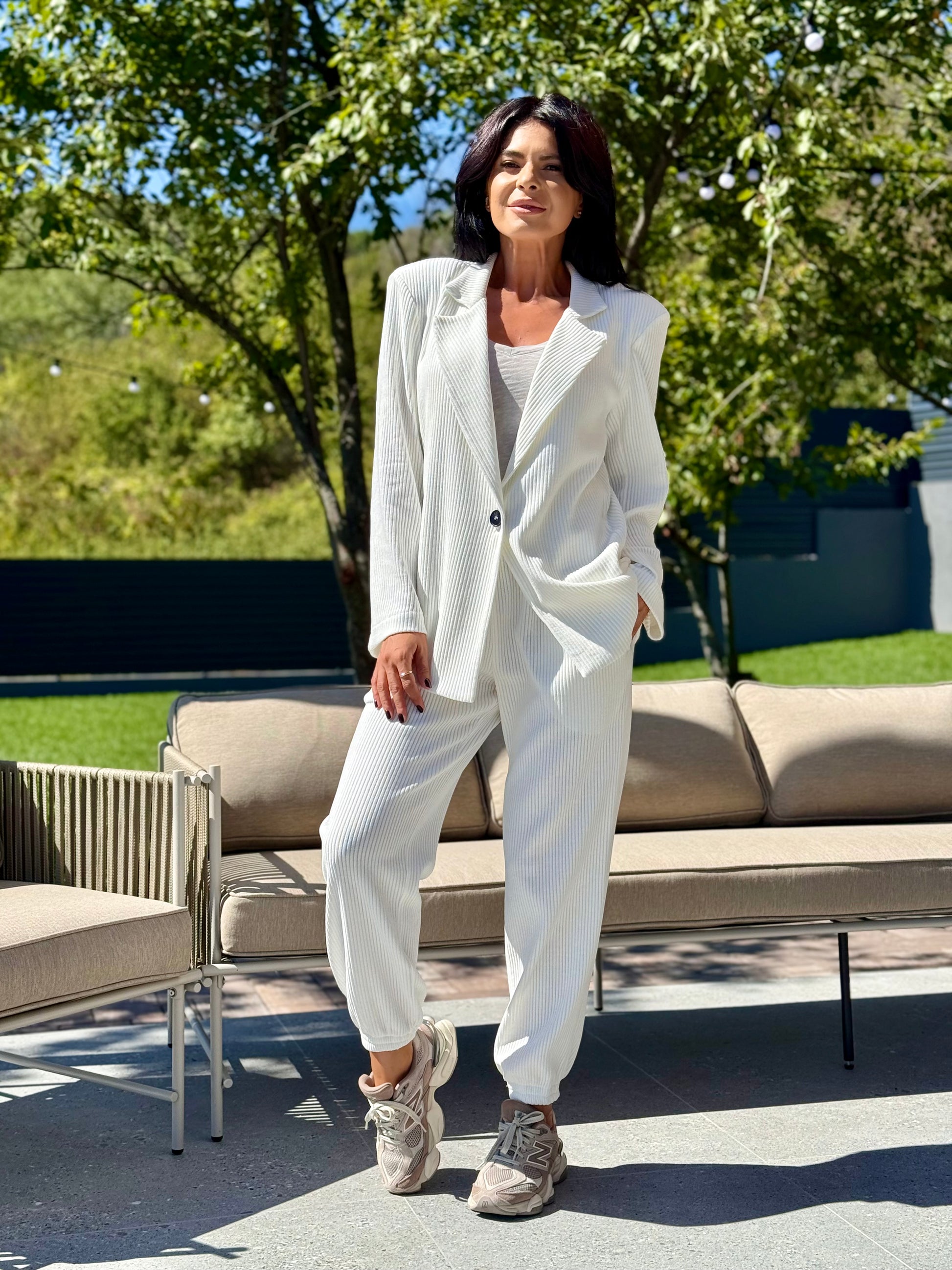 Un set modern, versatil și confortabil, realizat dintr-o țesătură moale, cu textură reiată. Sacoul are un croi lejer, cu umeri structurați și mâneci lungi, oferind libertate de mișcare și un aer relaxat. Pantalonii sunt prevăzuți cu talie elastică și manșete la bază, având o linie conică ce alungește silueta și asigură confort pe tot parcursul zilei.