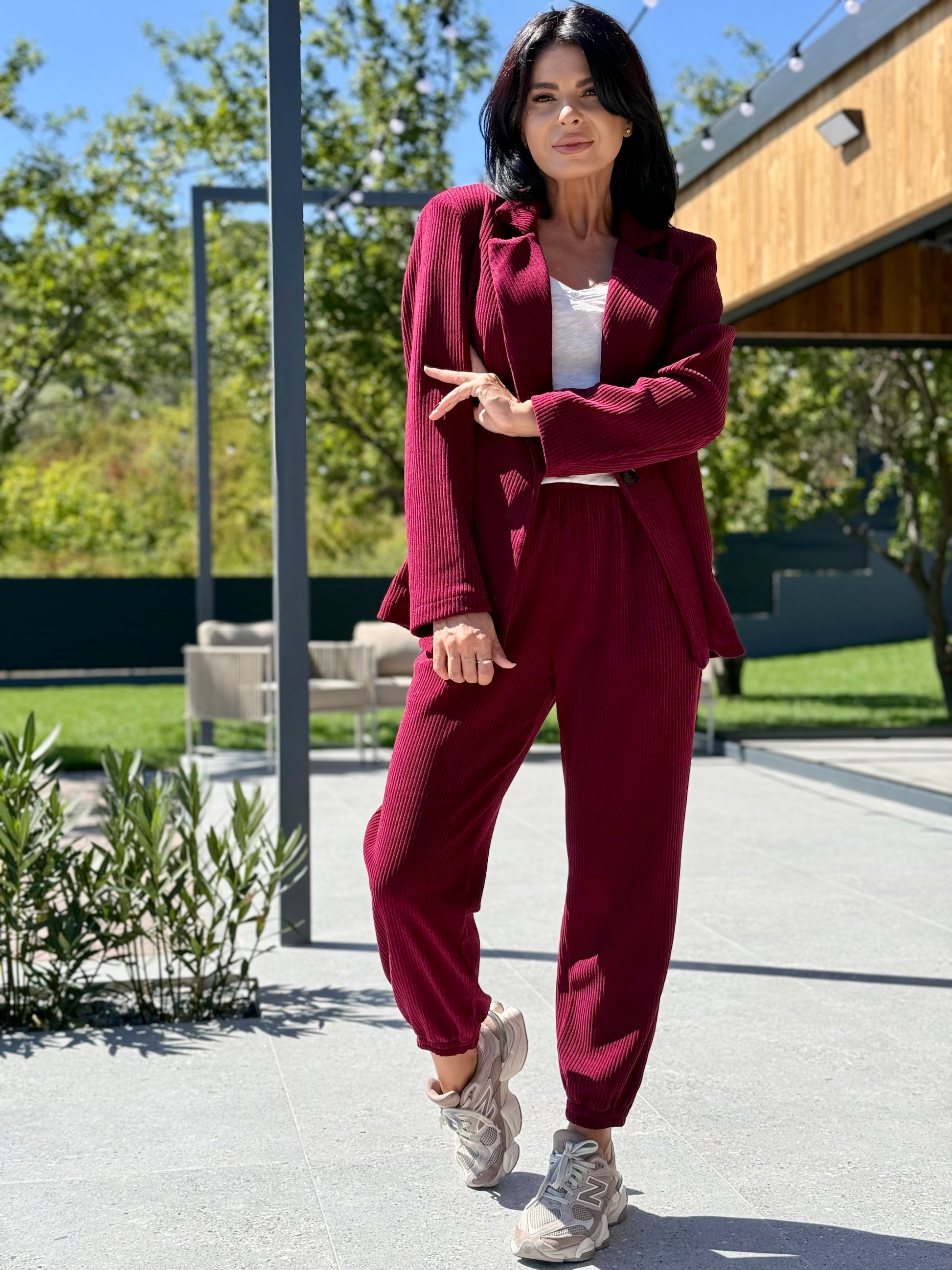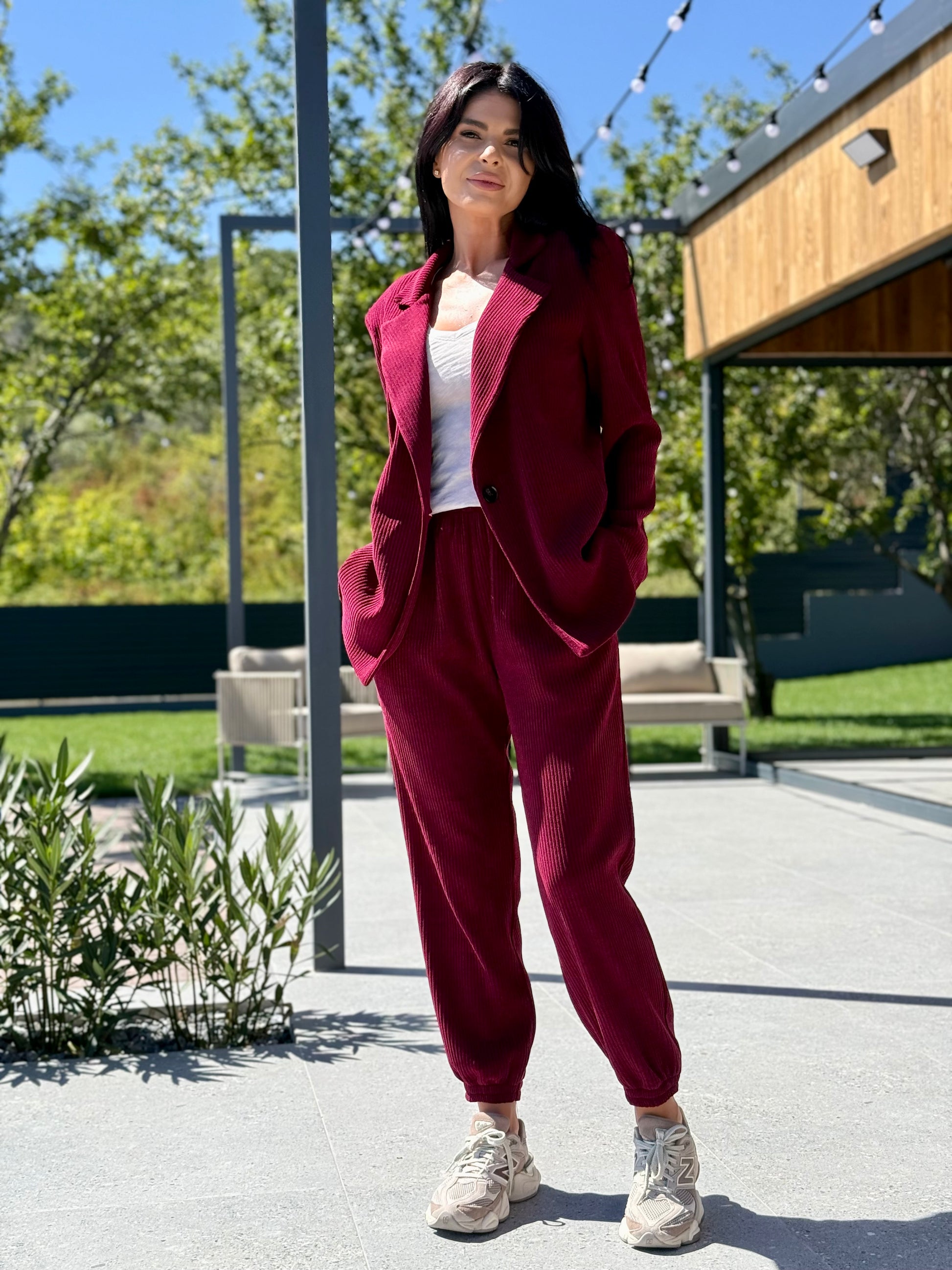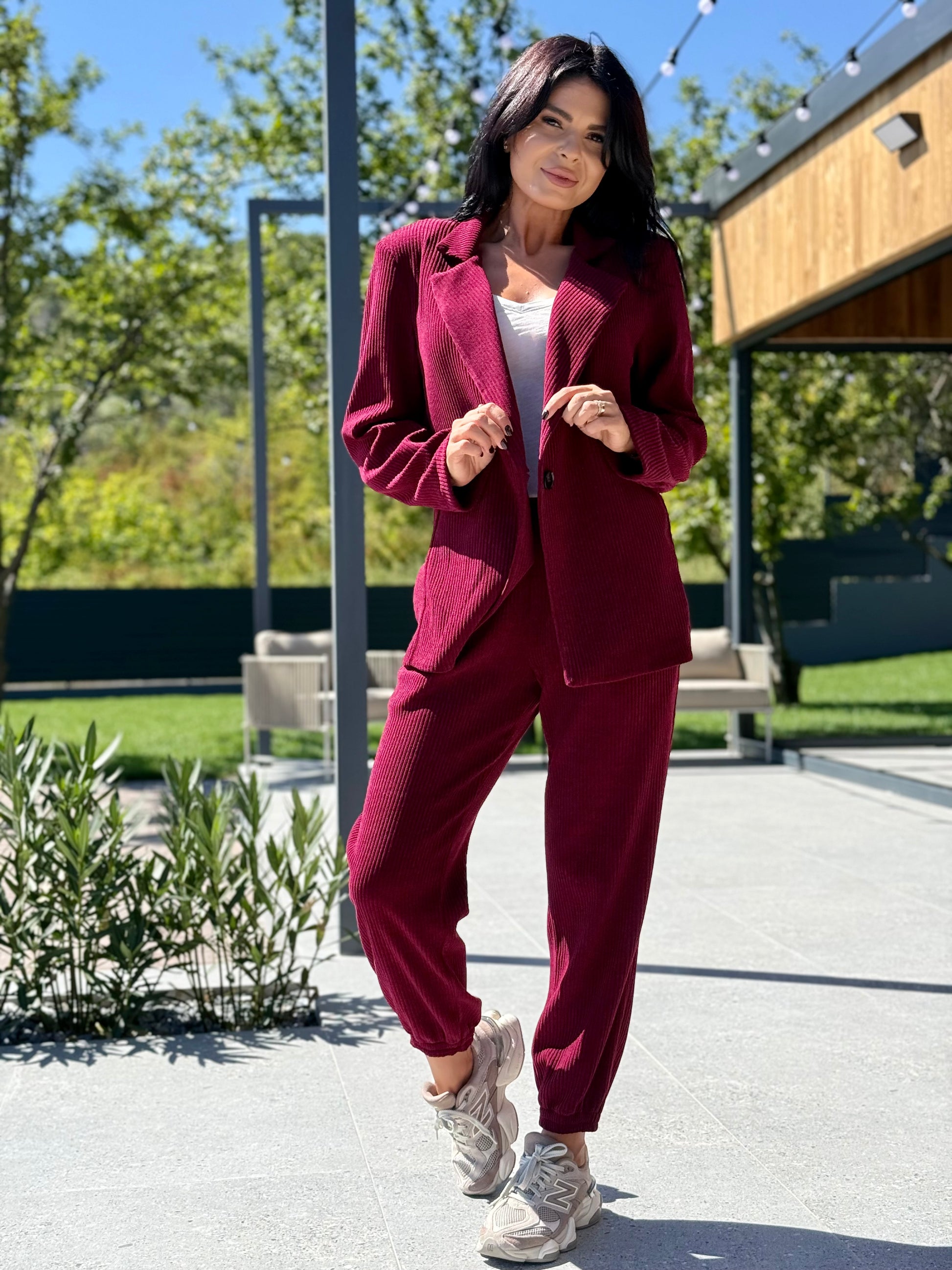 Un set modern, versatil și confortabil, realizat dintr-o țesătură moale, cu textură reiată. Sacoul are un croi lejer, cu umeri structurați și mâneci lungi, oferind libertate de mișcare și un aer relaxat. Pantalonii sunt prevăzuți cu talie elastică și manșete la bază, având o linie conică ce alungește silueta și asigură confort pe tot parcursul zilei.