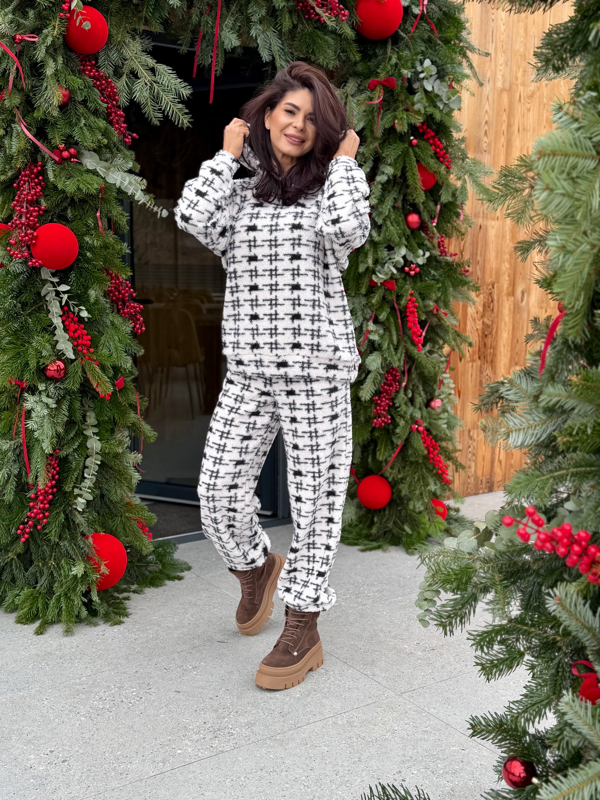 Un set cozy-chic realizat din teddy plush premium, moale, pufos și extrem de plăcut la purtare. Bluza are croi lejer, cu glugă confortabilă și linii simple, moderne, care oferă libertate de mișcare și un look relaxat. Pantalonii vin cu talie elastică și croi lejer, finisat cu manșete elastice la bază pentru un plus de confort.