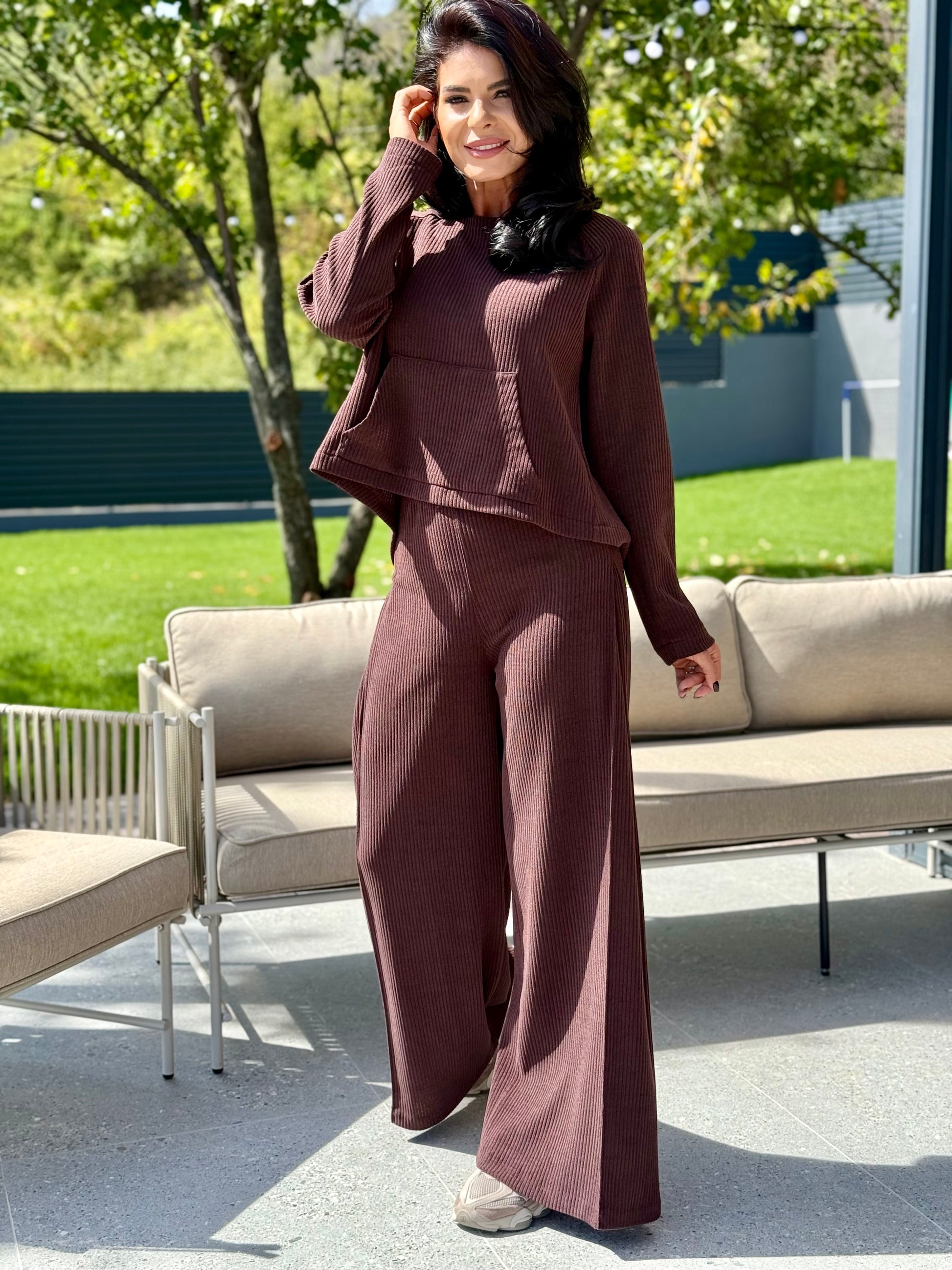 Set casual chic din catifea reiata, cu textura moale si confortabila, ideal pentru zilele in care vrei sa imbini lejeritatea cu un look modern. Bluza are croiala lejera cu buzunar tip kangaroo si detaliu cusatura la spate, in ton cu linia pantalonului. Pantalonii au talie elastica si croi palazzo, fluid, pliu lateral care alungeste silueta.