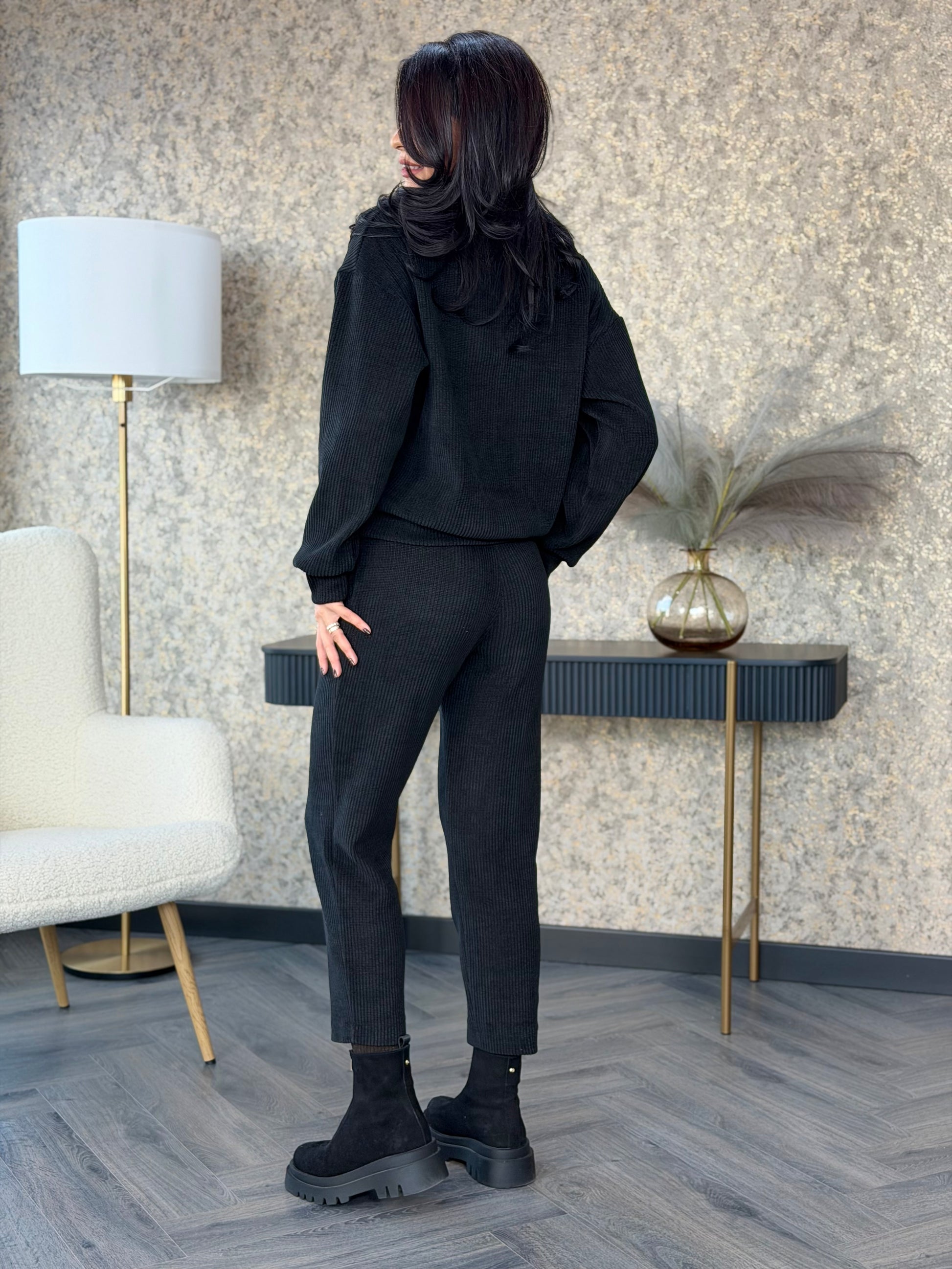 Un set versatil, perfect pentru zilele în care vrei să te simți comodă, dar și stylish. Realizat din catifea reiată moale și plăcută la atingere, oferă un aspect modern și rafinat. Bluza are o croială lejeră, cu guler și închidere cu capse, ideală pentru un look relaxat, dar bine definit. Pantalonii au croială conică și talie elastică, care asigură confort și o potrivire perfectă.