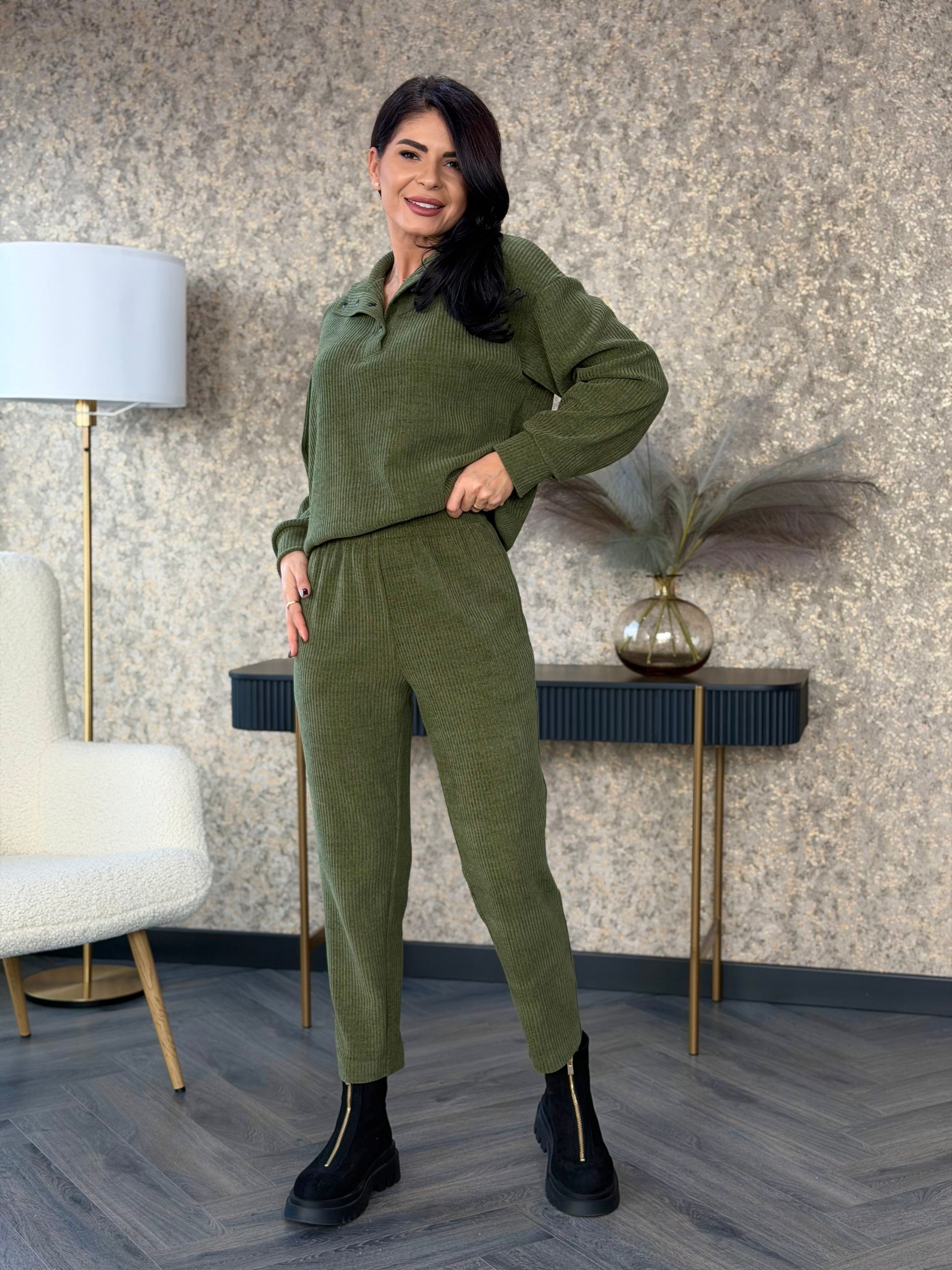 Un set versatil, perfect pentru zilele în care vrei să te simți comodă, dar și stylish. Realizat din catifea reiată moale și plăcută la atingere, oferă un aspect modern și rafinat. Bluza are o croială lejeră, cu guler și închidere cu capse, ideală pentru un look relaxat, dar bine definit. Pantalonii au croială conică și talie elastică, care asigură confort și o potrivire perfectă.
