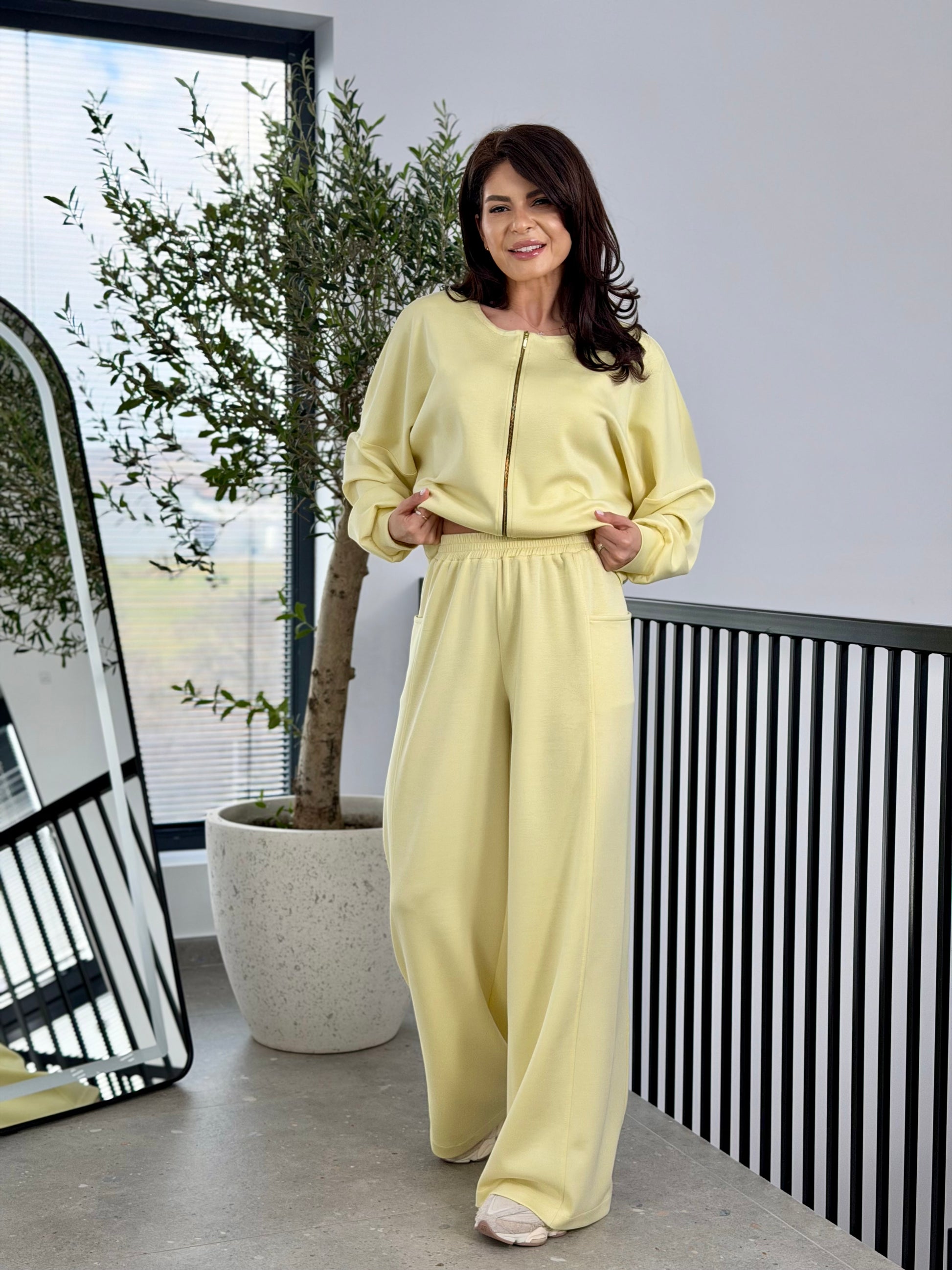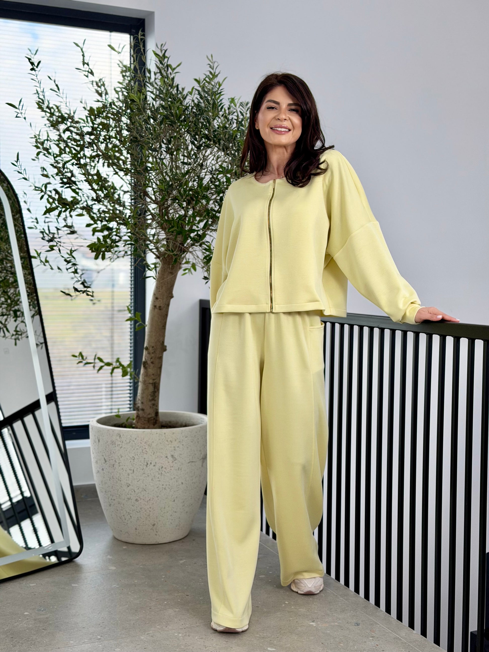 Setul este construit pe un tipar lejer, modern, care pune accent pe confort și libertate de mișcare, fără a compromite estetica. Bluza are un croi oversized, cu linie ușor boxy, mânecă căzută și volum amplu, ceea ce oferă un aer relaxat și contemporan. Închiderea frontală cu fermoar adaugă un plus de versatilitate și funcționalitate, permițând purtarea atât deschisă, cât și închisă.