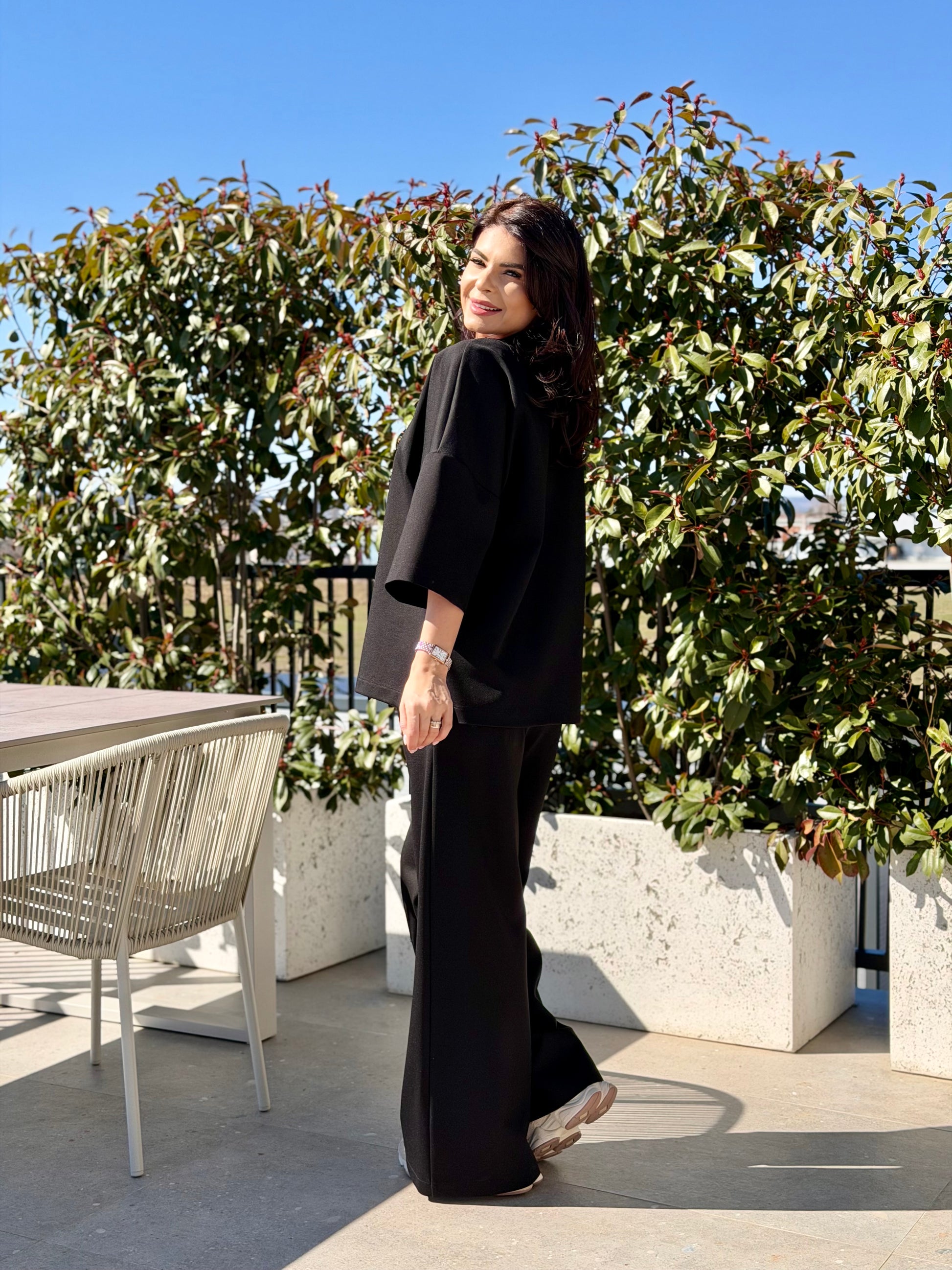 Un outfit modern și relaxat, realizat din țesătură Morgan, apreciată pentru textura sa plăcută, elasticitatea confortabilă și aspectul elegant. Materialul oferă o cădere frumoasă pe siluetă și este ideal pentru ținute casual sofisticate, ușor de purtat în orice moment al zilei.