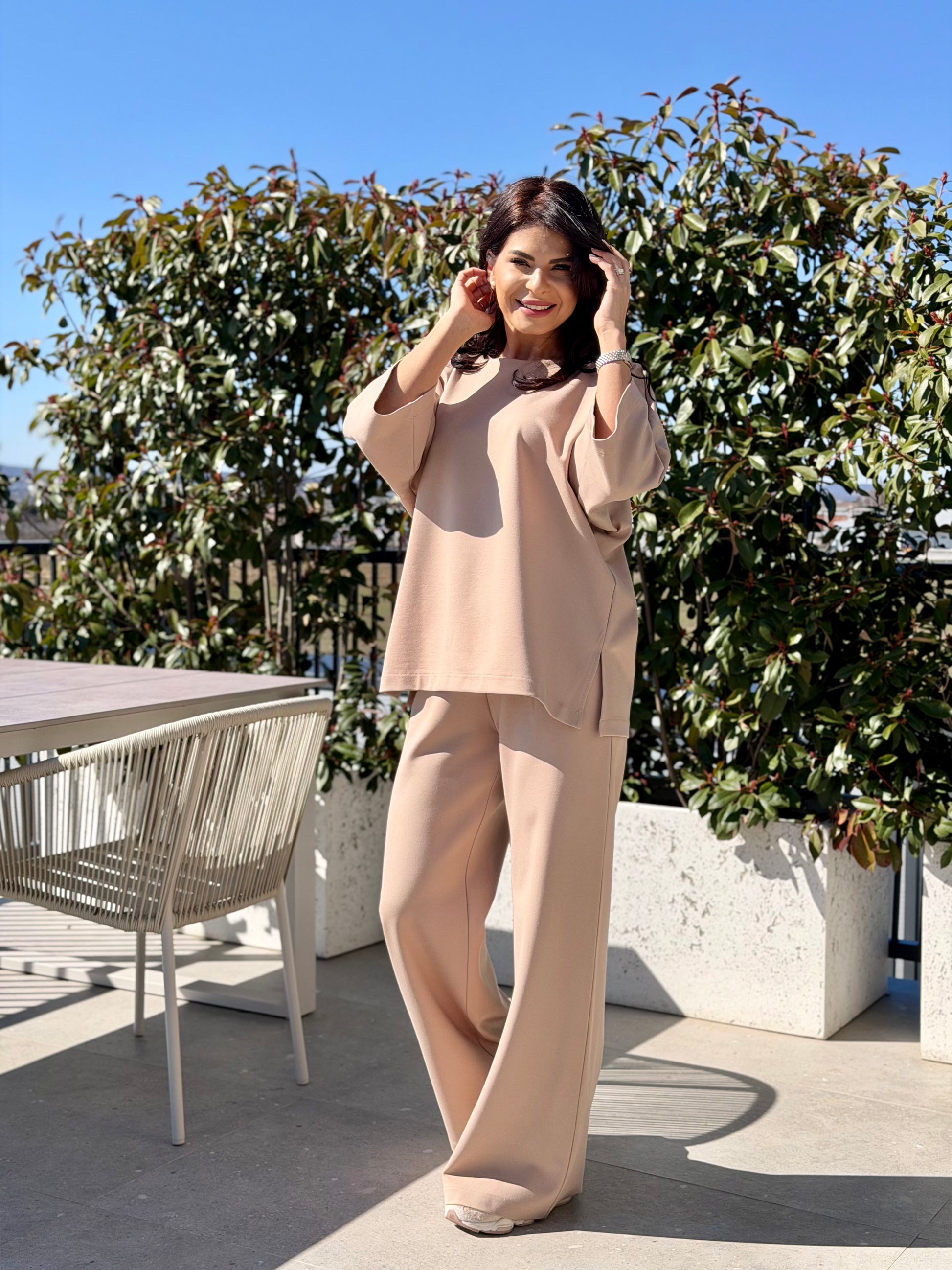 Setul este compus din bluză și pantaloni, două piese versatile care pot fi purtate atât împreună, cât și separat, pentru a crea multiple combinații de styling. Bluza are un tipar lejer, cu linie minimalistă și mâneci largi, oferind libertate de mișcare și un look modern. Lungimea ușor alungită și croiul relaxat avantajează silueta și creează un outfit echilibrat.