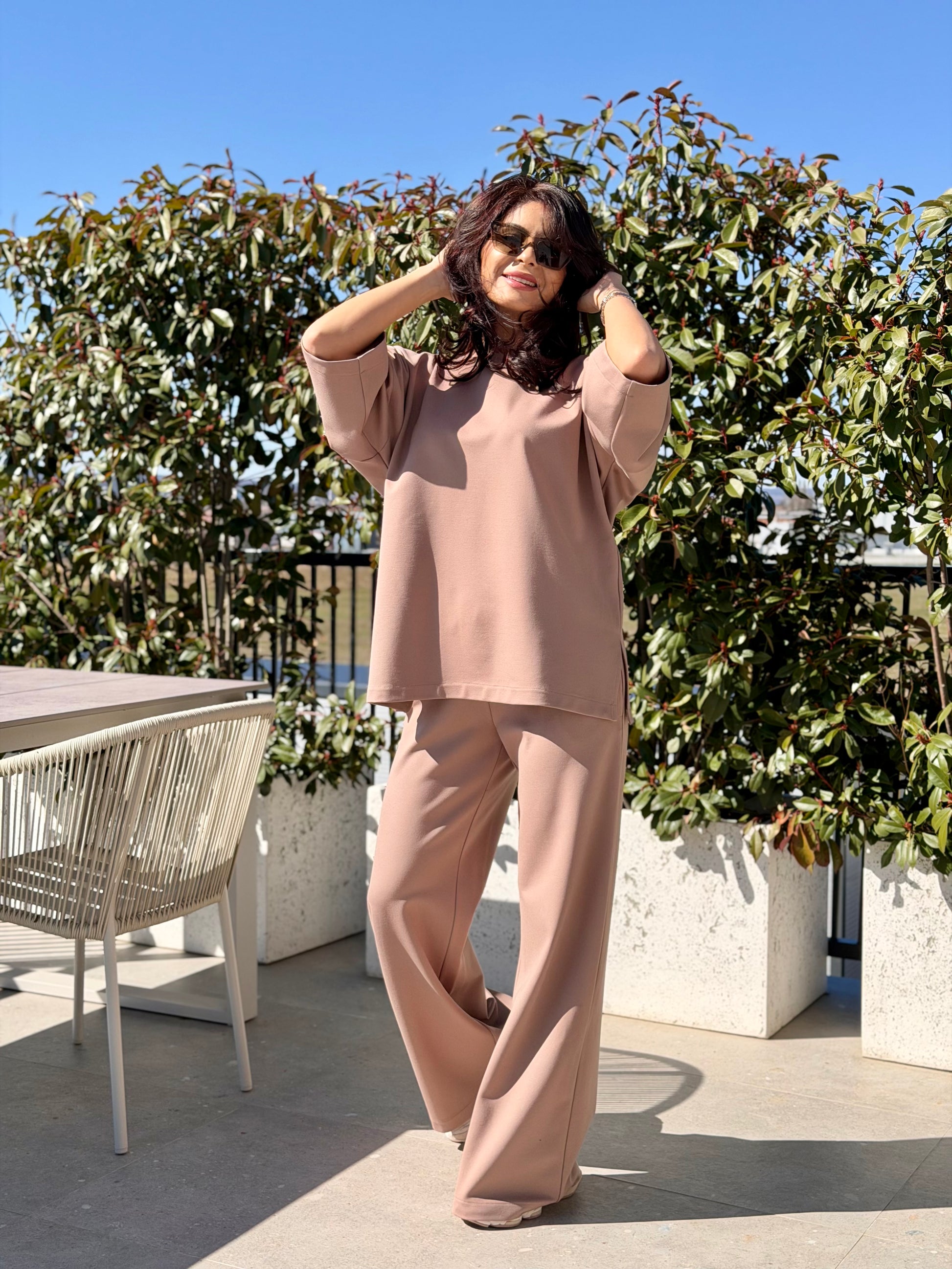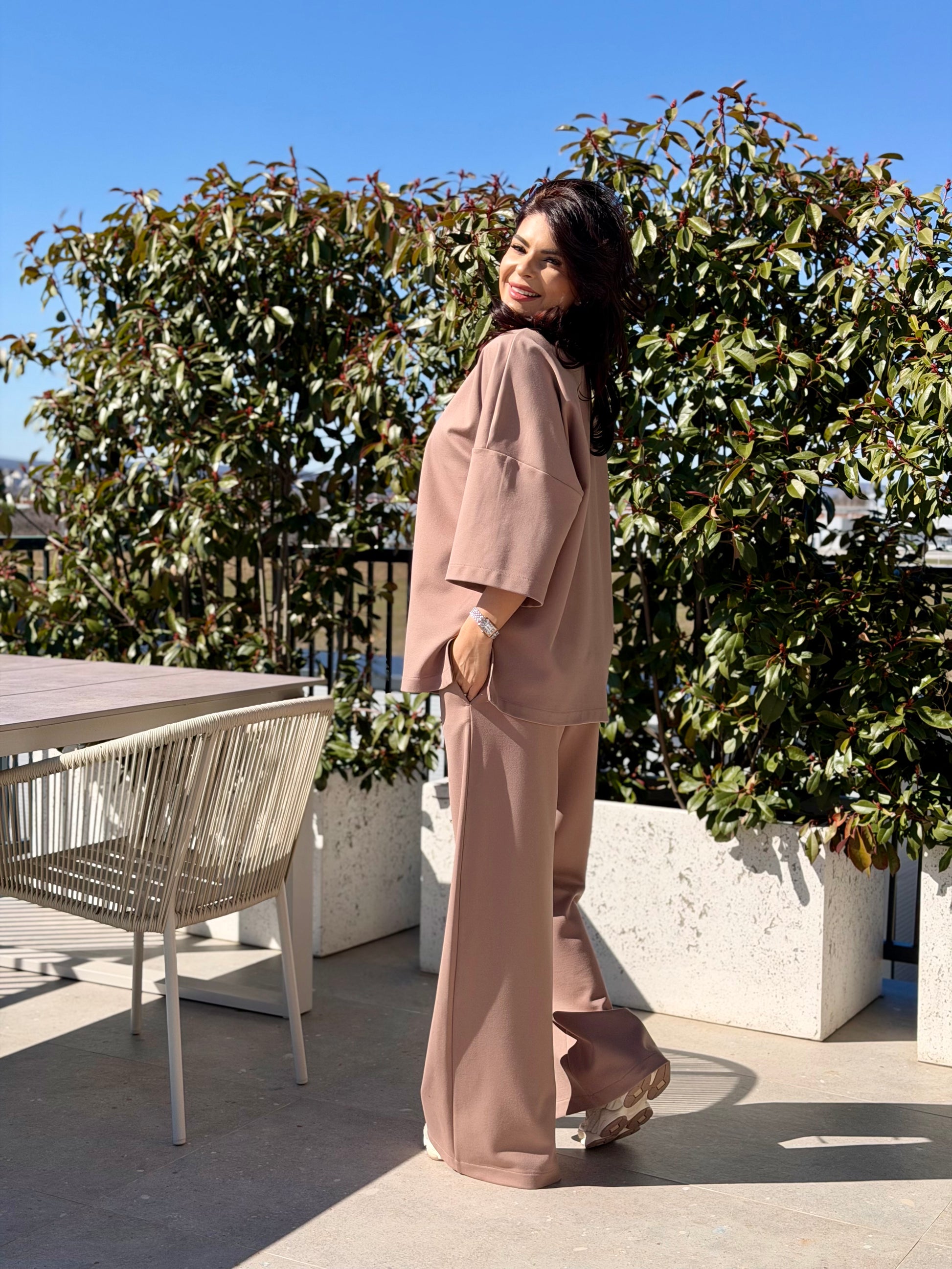 Un outfit modern și relaxat, realizat din țesătură Morgan, apreciată pentru textura sa plăcută, elasticitatea confortabilă și aspectul elegant. Materialul oferă o cădere frumoasă pe siluetă și este ideal pentru ținute casual sofisticate, ușor de purtat în orice moment al zilei.