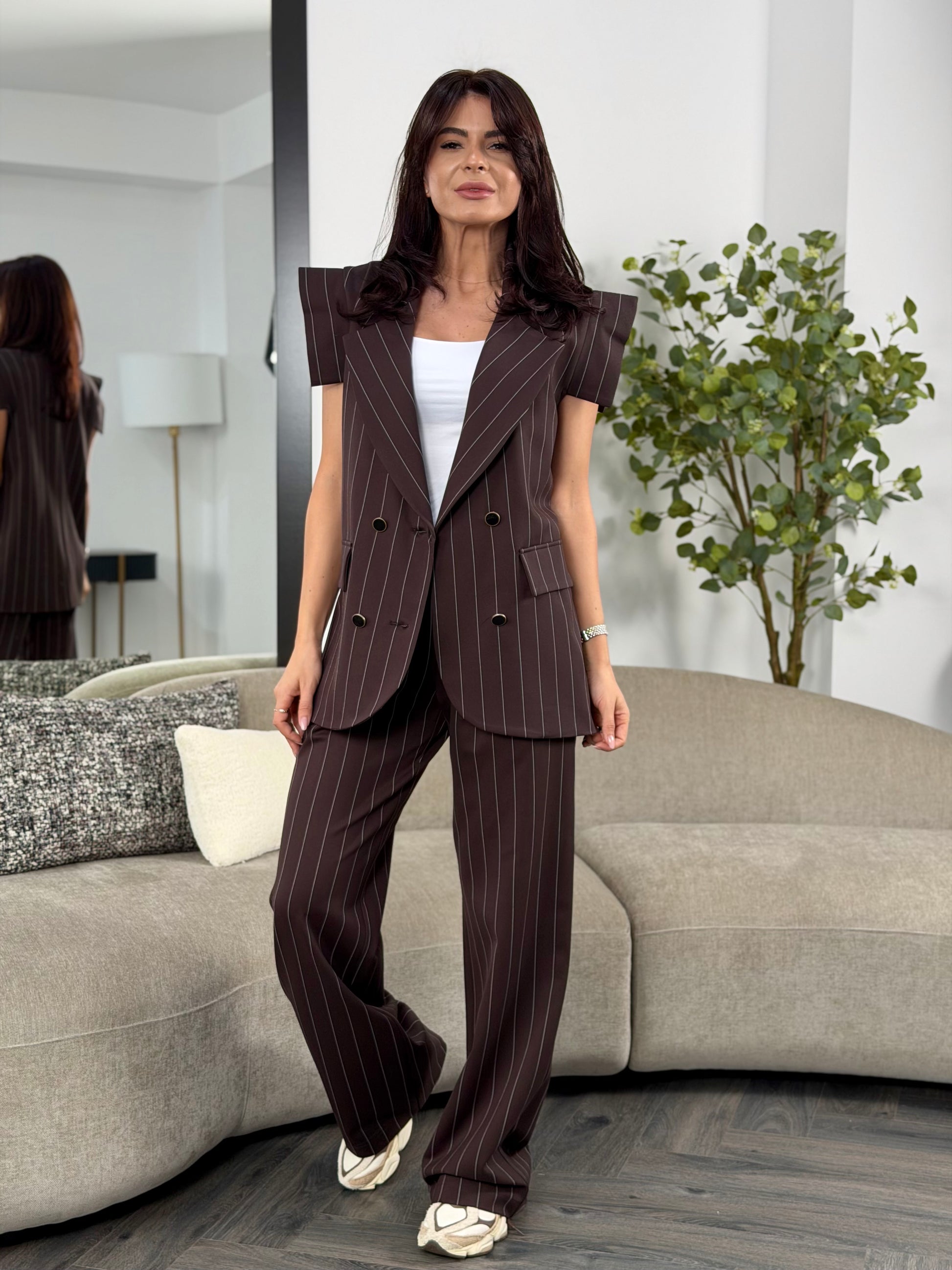 Costum realizat într-un tipar modern, cu vestă cambrată, structurată, fără mâneci, cu rever amplu și închidere dublă cu nasturi decorativi. Umerii sunt bine definiți, oferind ținutei un aer elegant și actual.