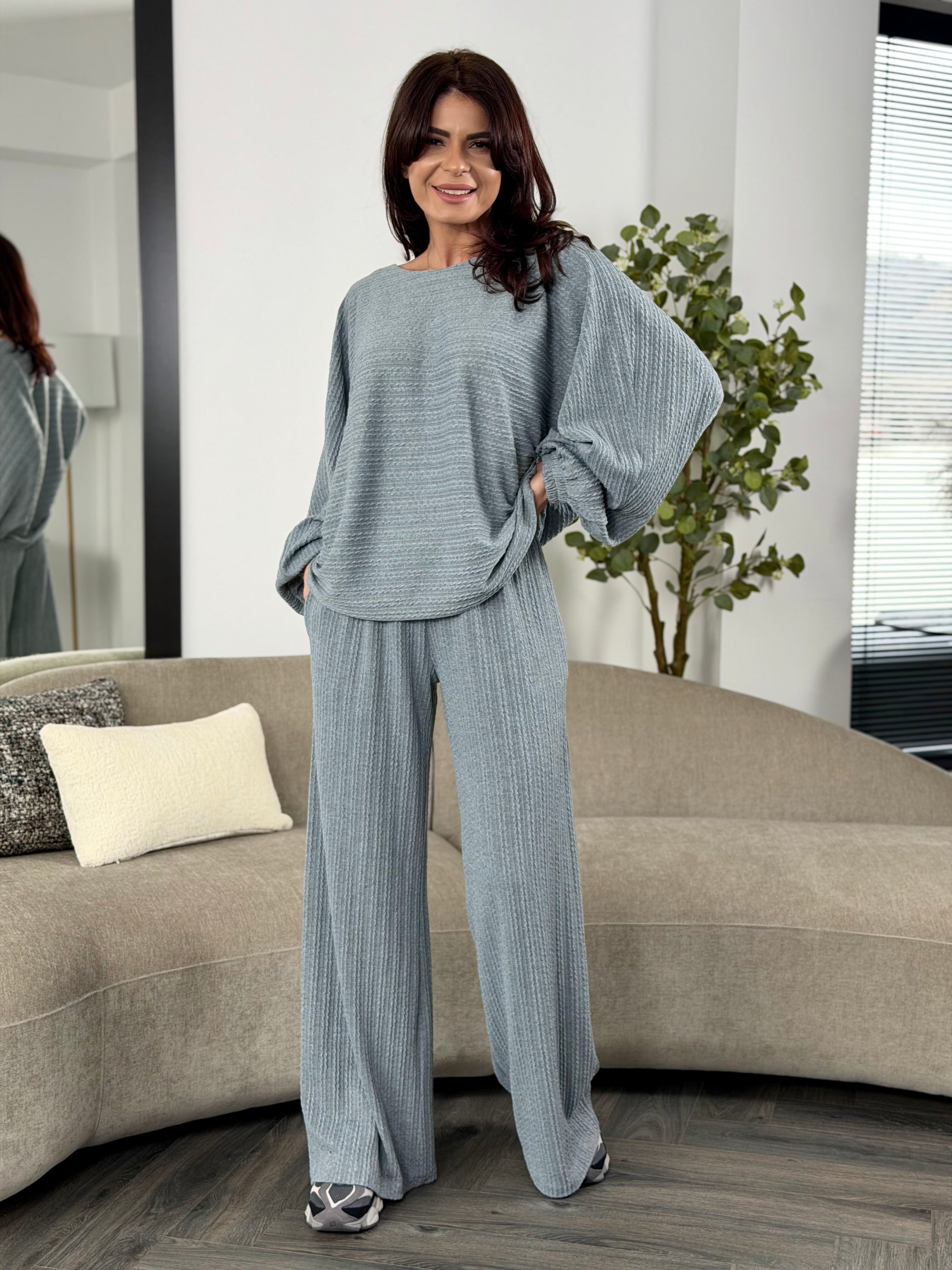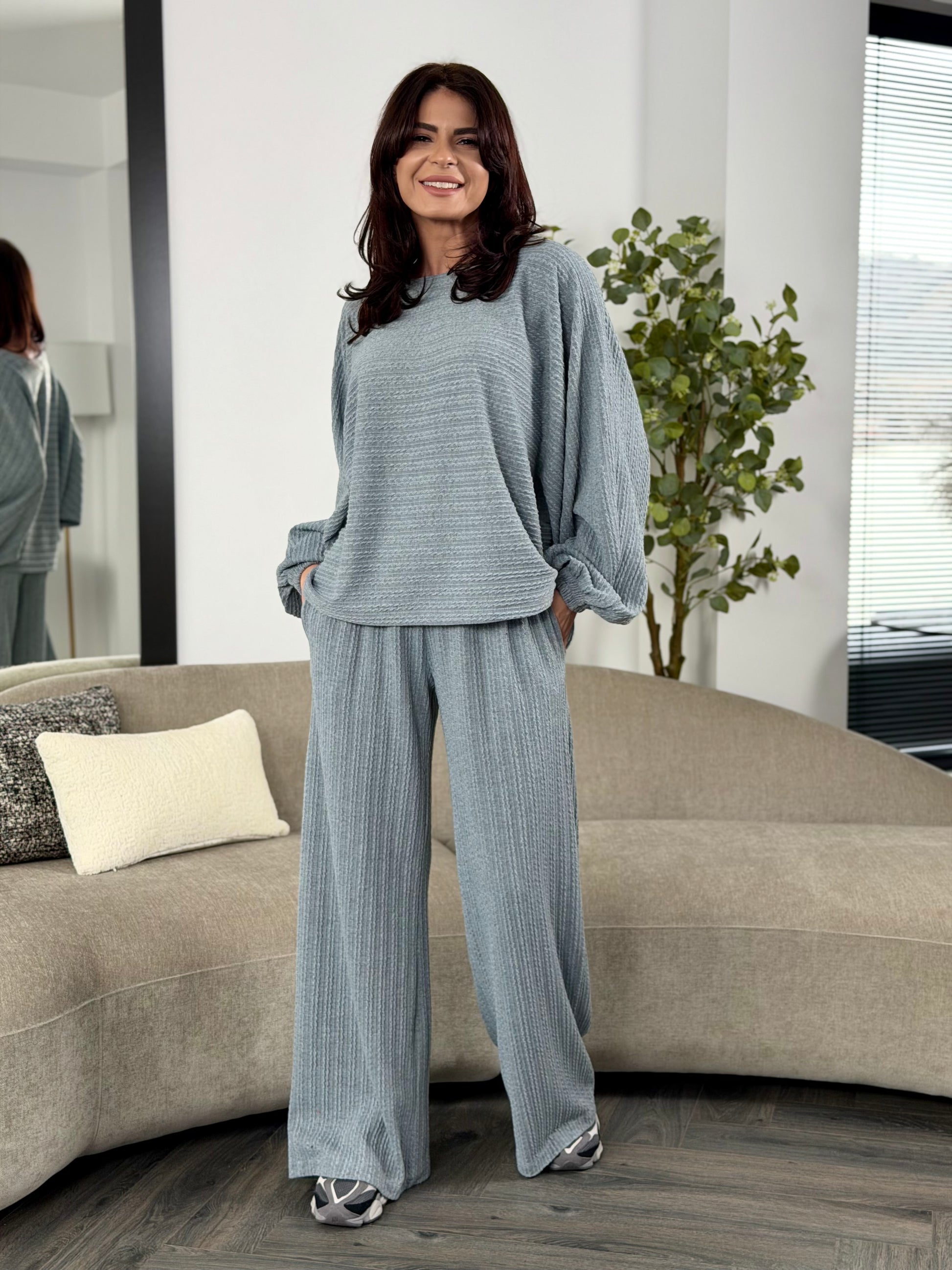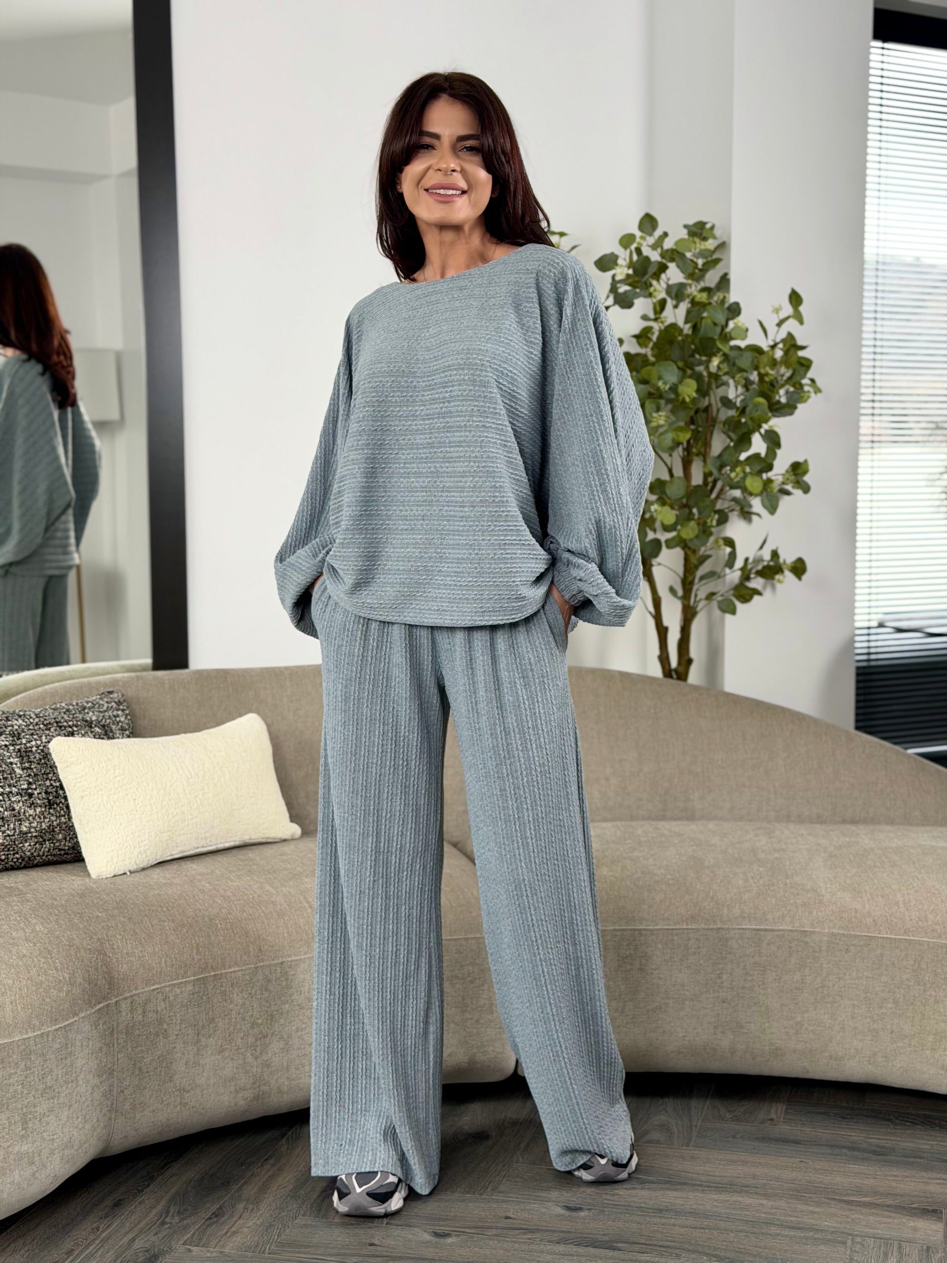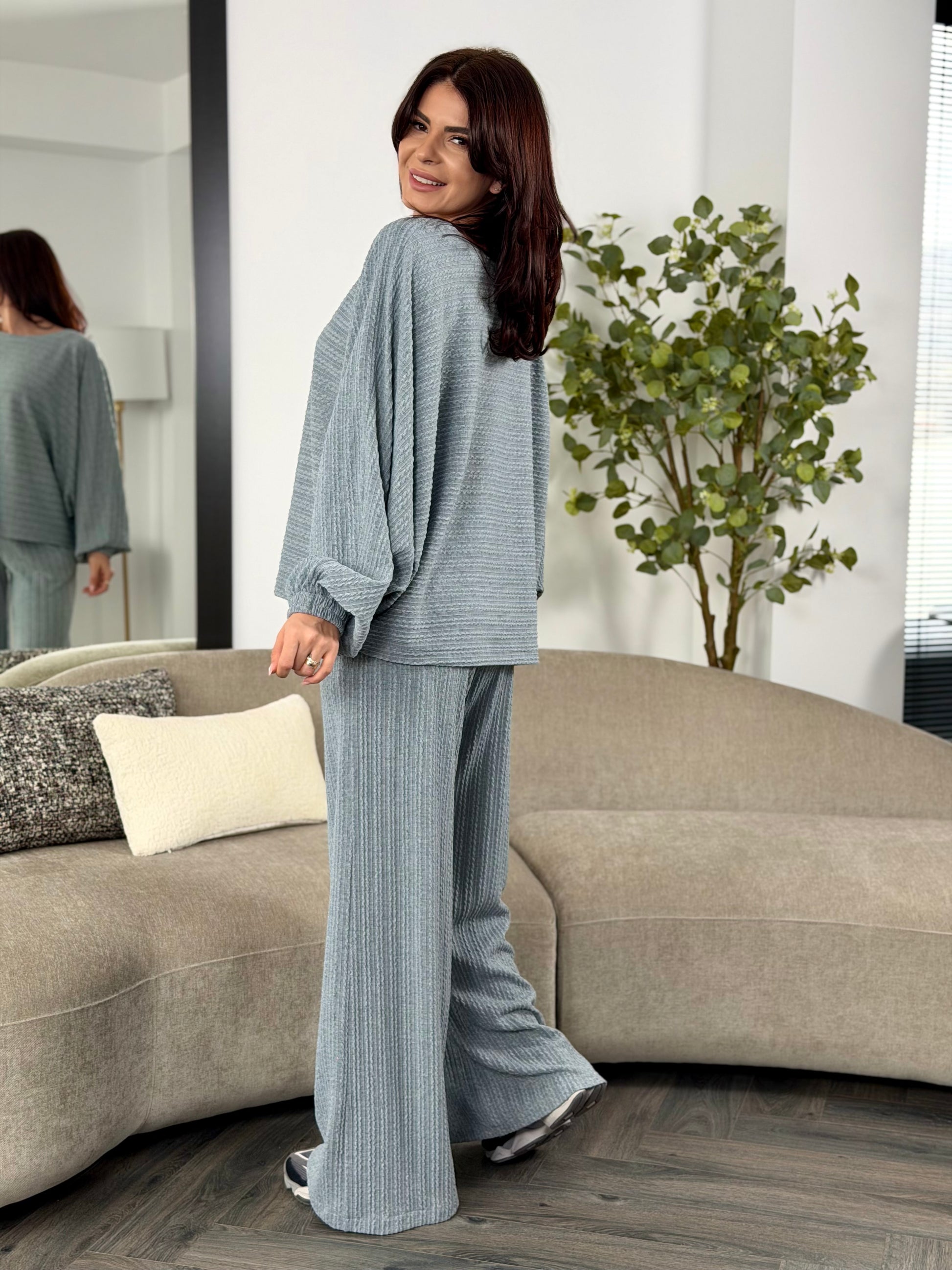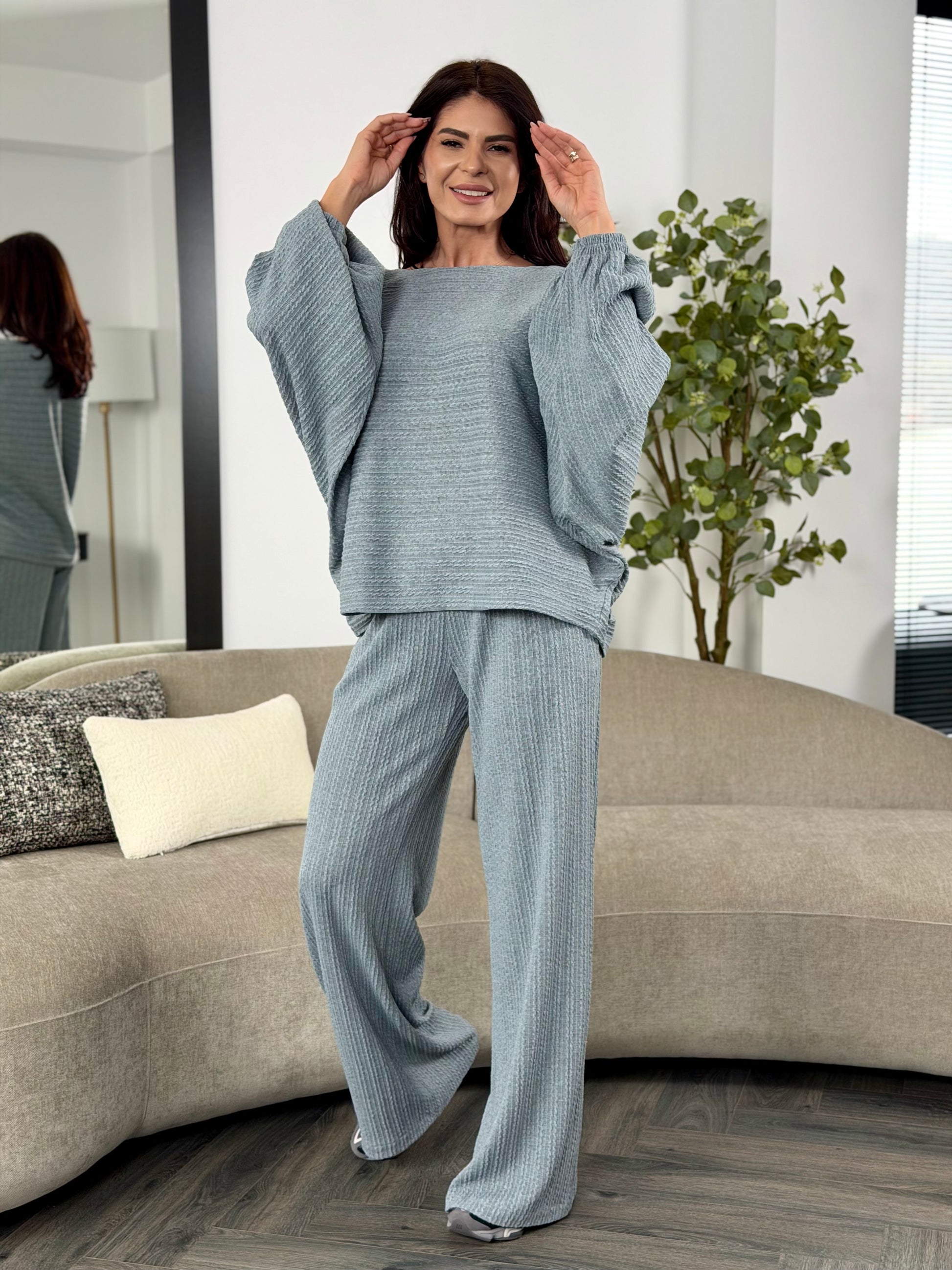 Un set lejer, modern și extrem de confortabil, realizat din țesătură texturată, perfect pentru un look casual-chic.