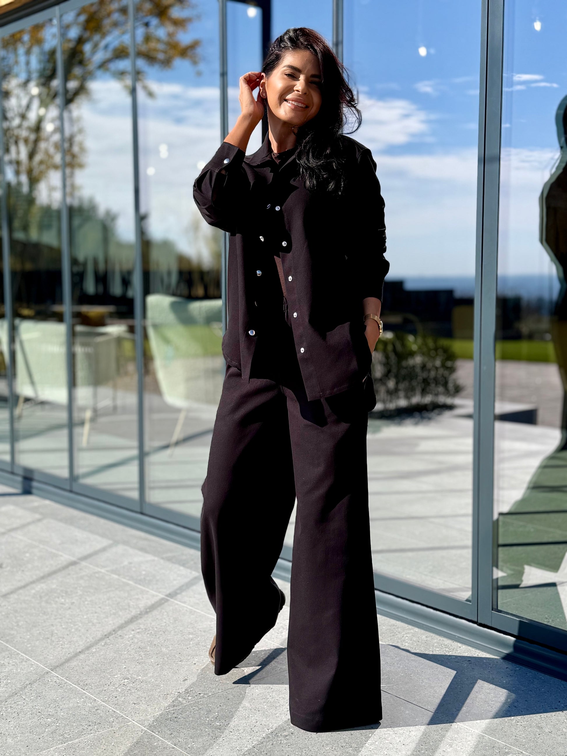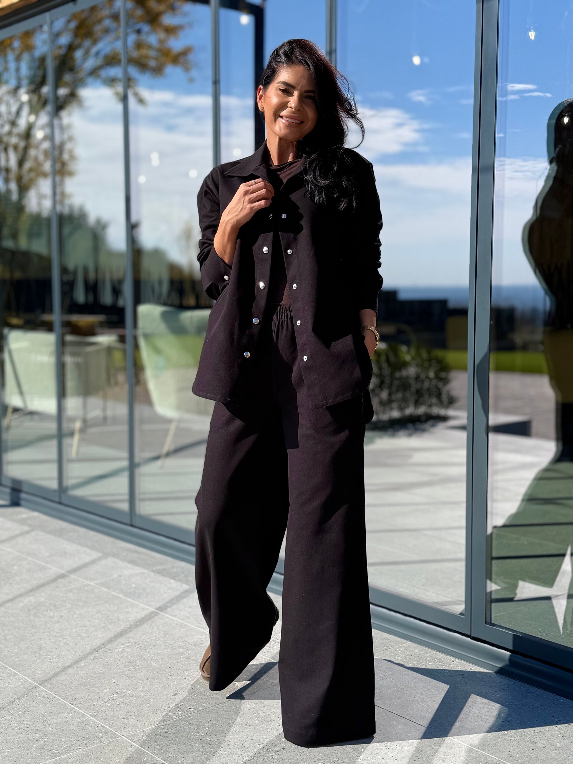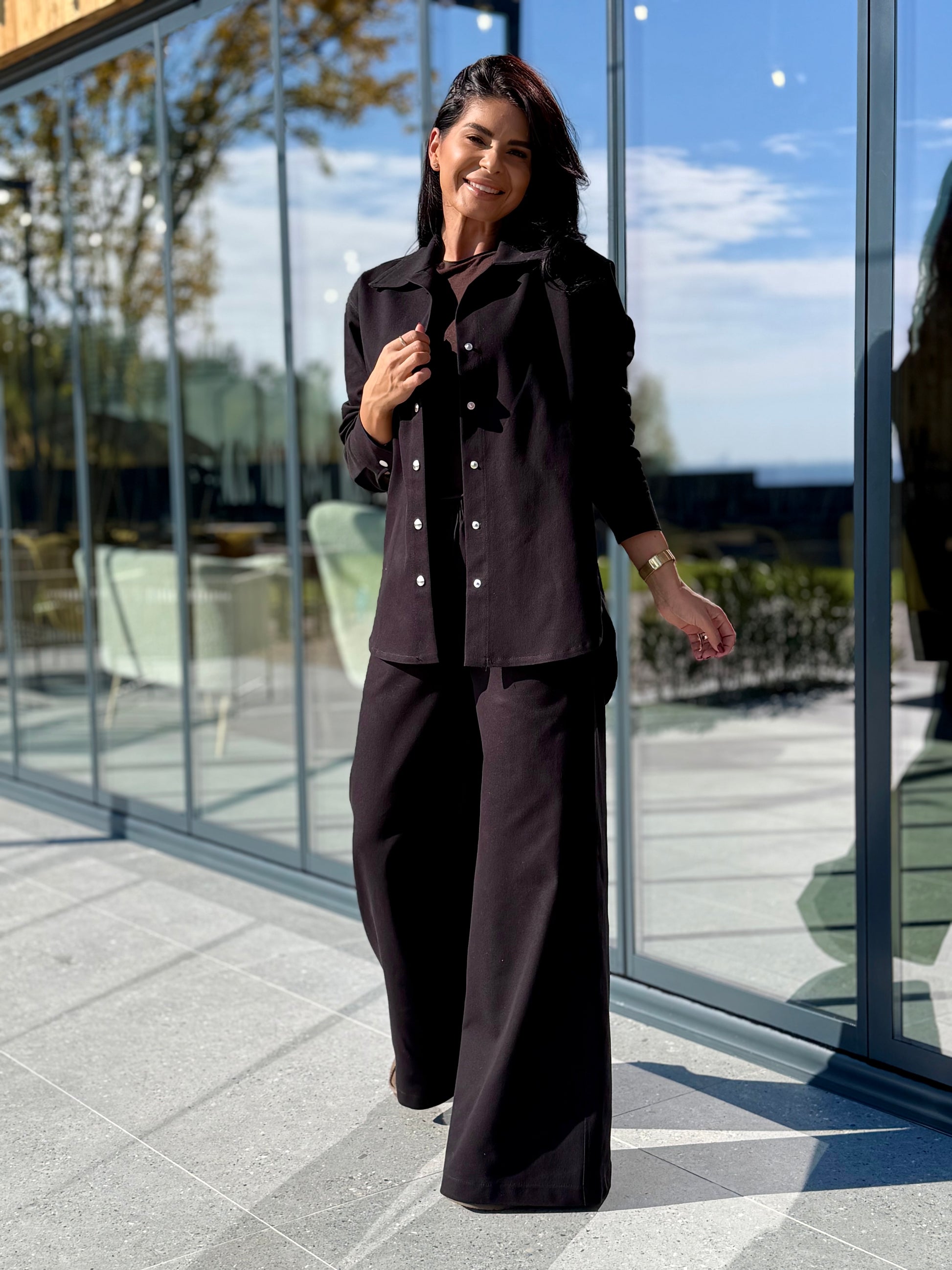 Set din doua piese, realizat dintr-o tesatura moale si confortabila, placuta la atingere. Camasa are croiala lejera, cu inchidere cu capse frontale, maneci lungi si tiv usor rotunjit, ce ofera un aspect modern si feminin. Pantalonii au talie elastica pentru un plus de confort si croi lejer. Un outfit versatil, ideal pentru zilele in care vrei sa te simti bine, dar sa arati impecabil.