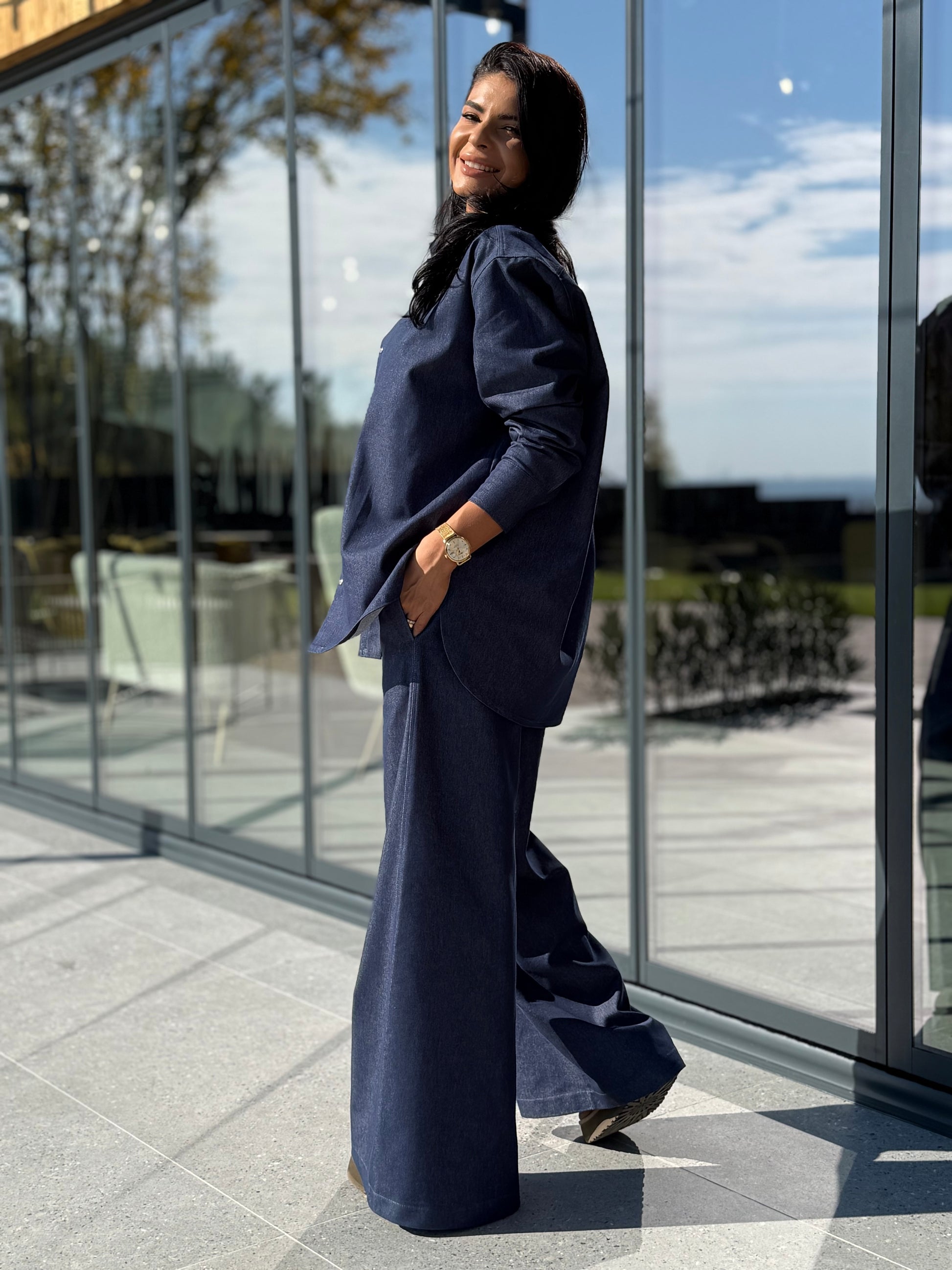 Set din doua piese, realizat dintr-o tesatura moale si confortabila, placuta la atingere. Camasa are croiala lejera, cu inchidere cu capse frontale, maneci lungi si tiv usor rotunjit, ce ofera un aspect modern si feminin. Pantalonii au talie elastica pentru un plus de confort si croi lejer. Un outfit versatil, ideal pentru zilele in care vrei sa te simti bine, dar sa arati impecabil.