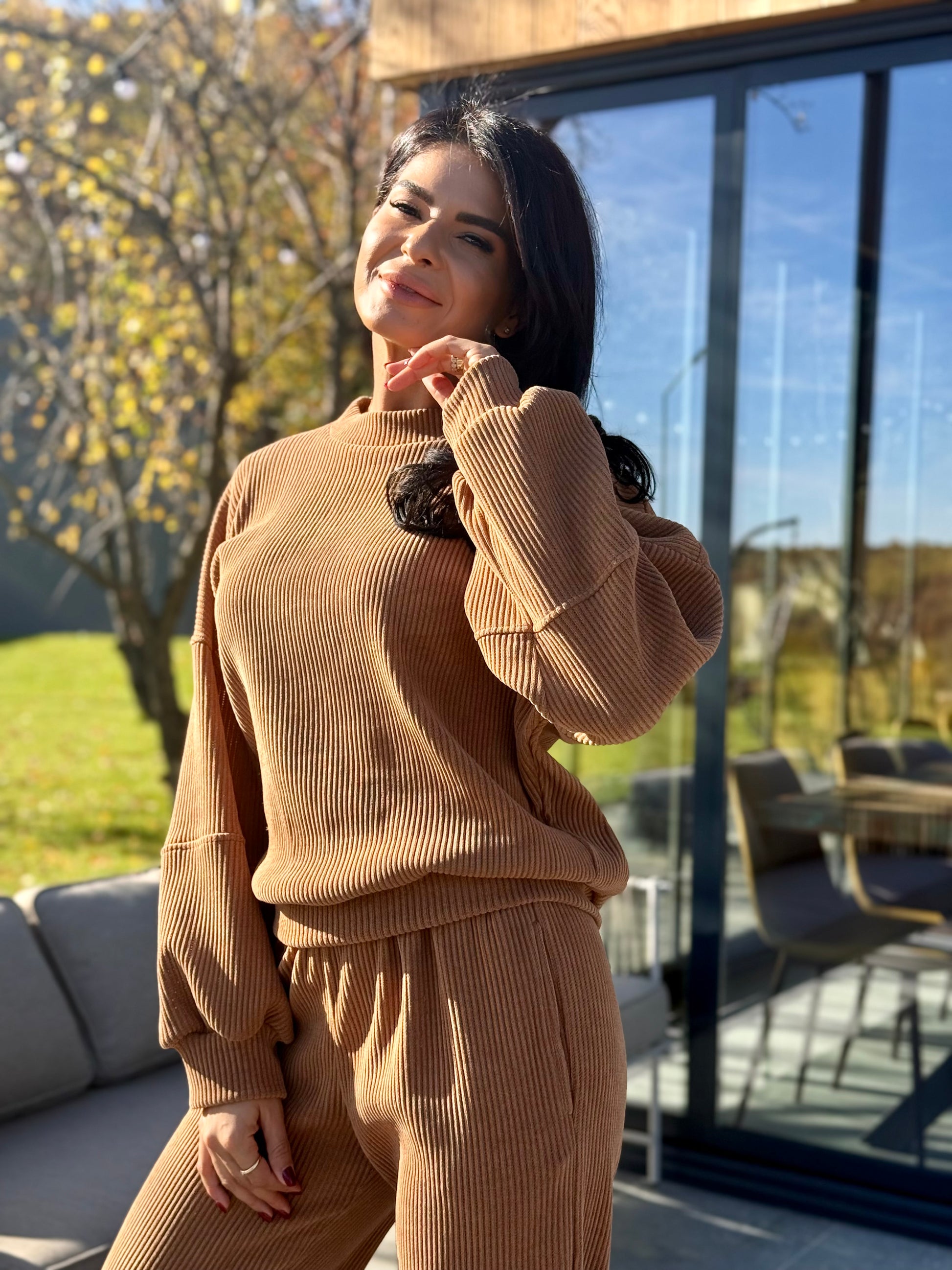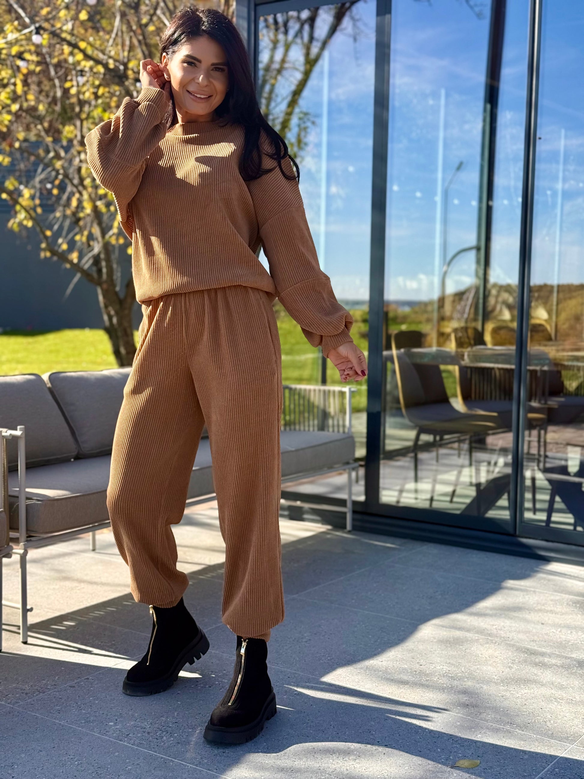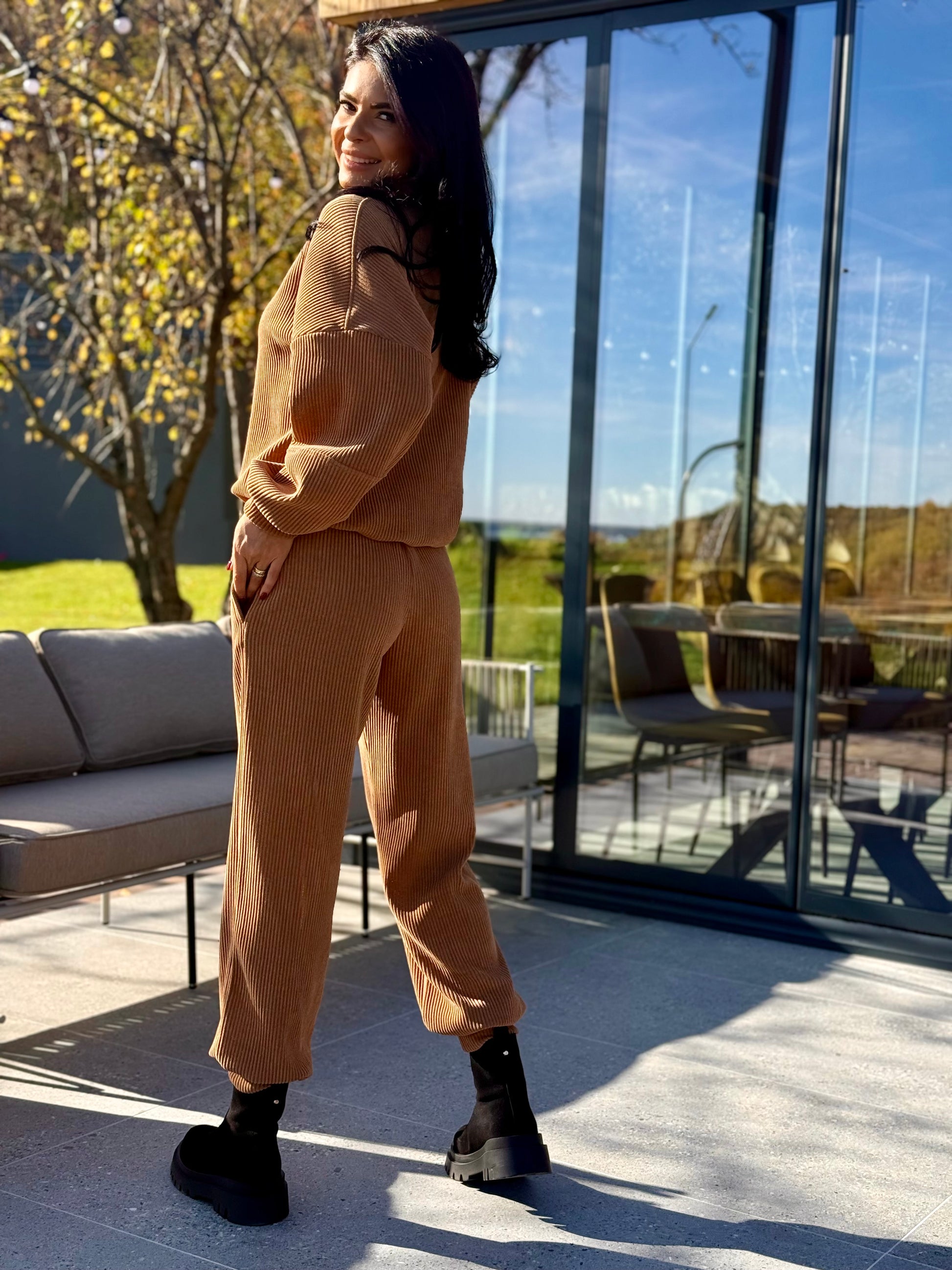 Un outfit cozy si modern, realizat din catifea reiata moale si placuta la atingere, cu textura fina si densitate ideala pentru sezonul rece. Bluza are croiala lejera, mansete elastice la maneci si un design minimalist, usor de integrat in tinutele de zi cu zi. Pantalonii sunt prevazuti cu talie elastica si mansete in partea de jos, oferind confort si libertate de miscare, pastrand in acelasi timp o linie eleganta.