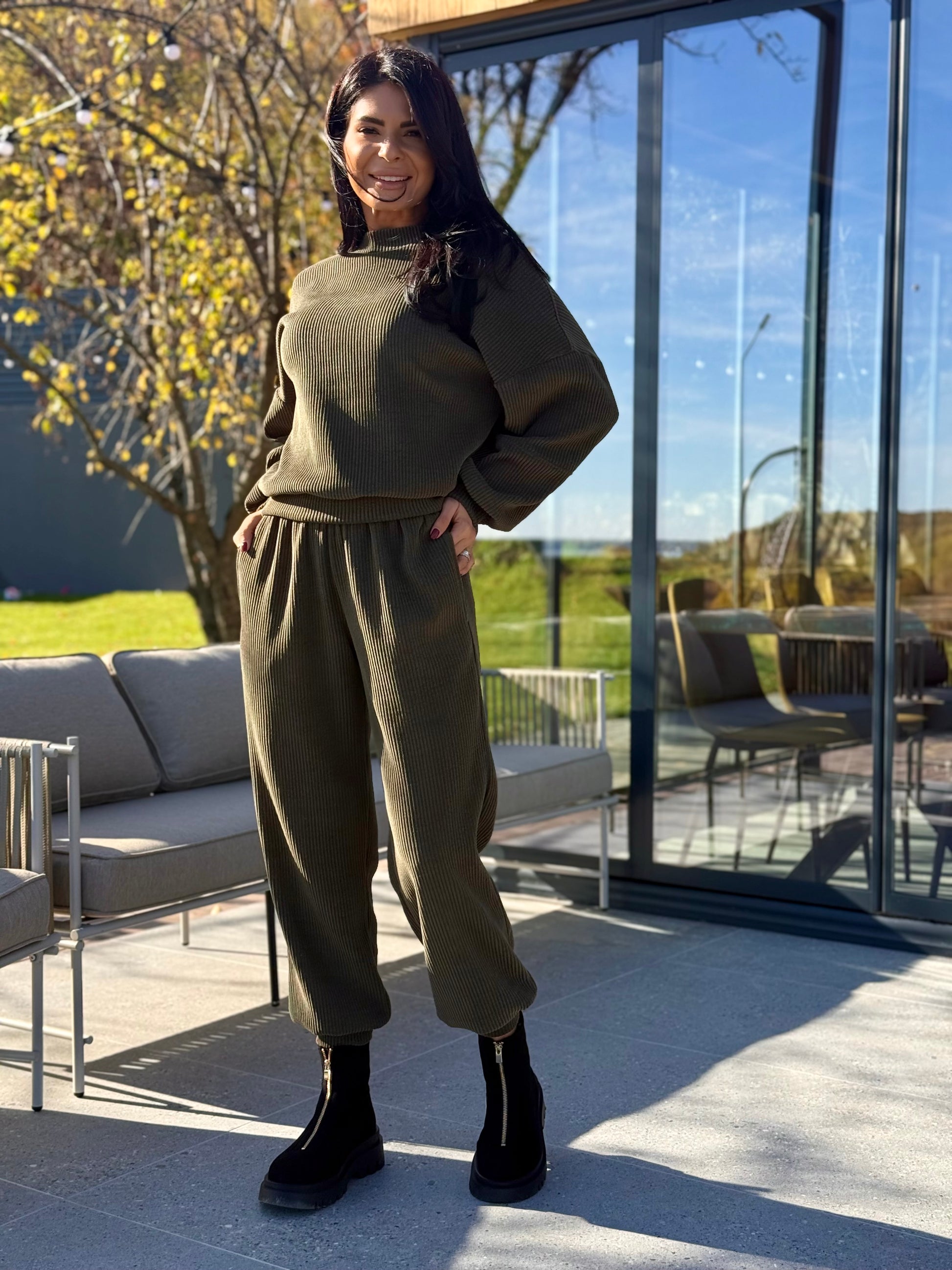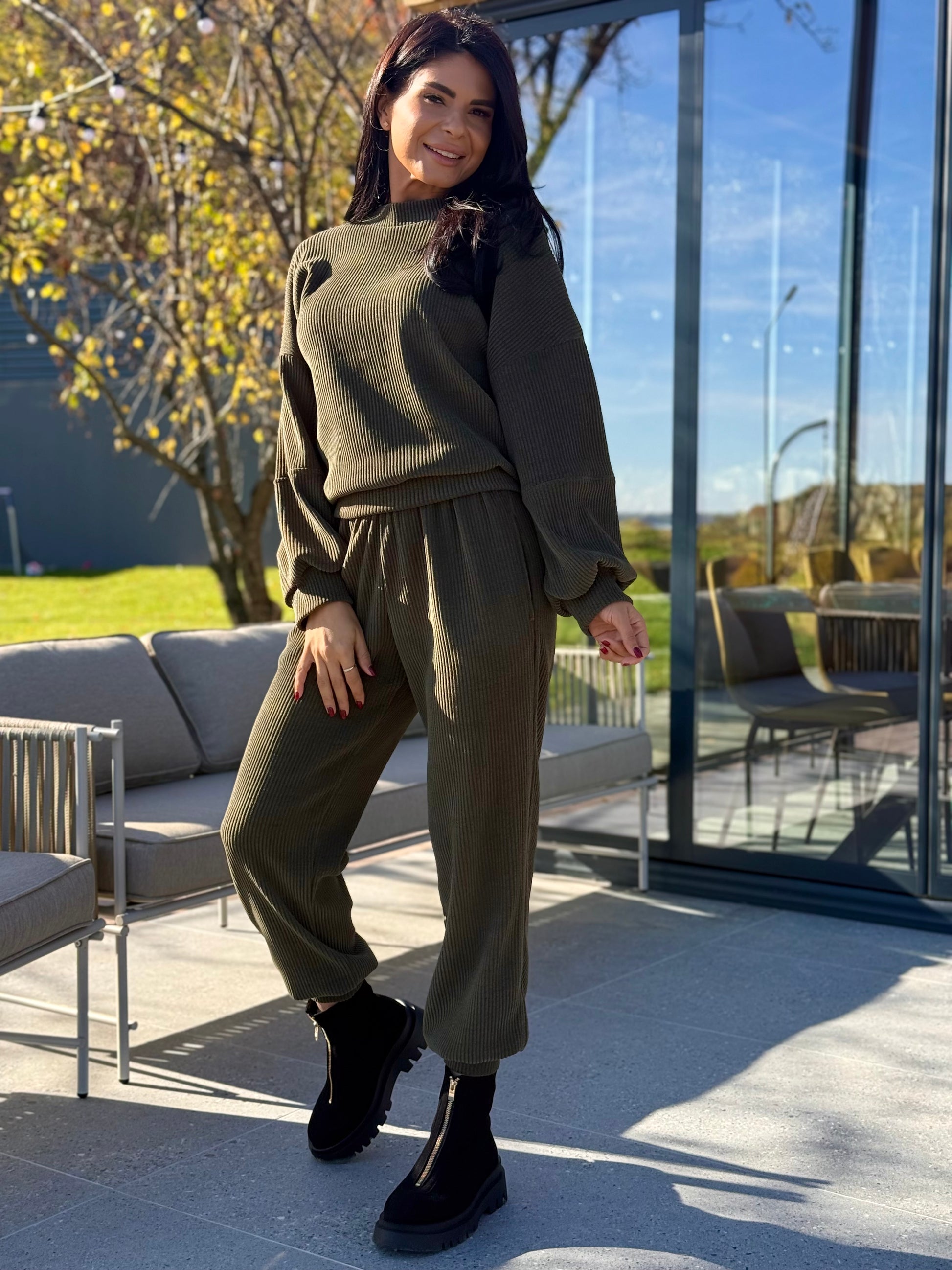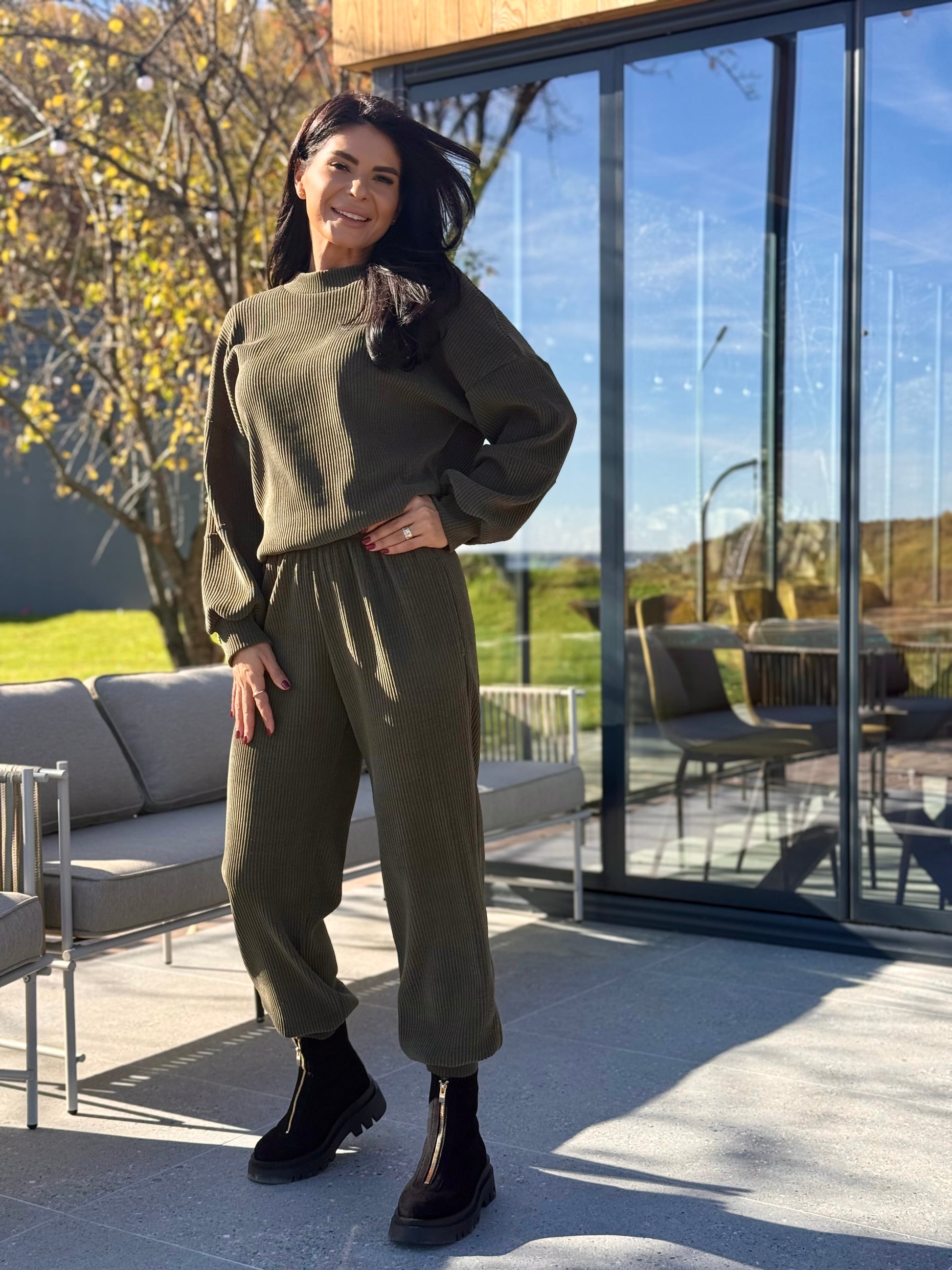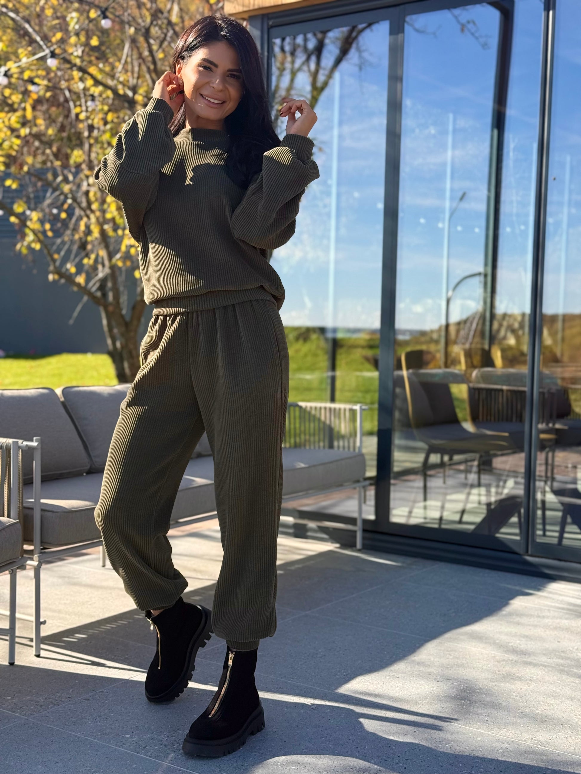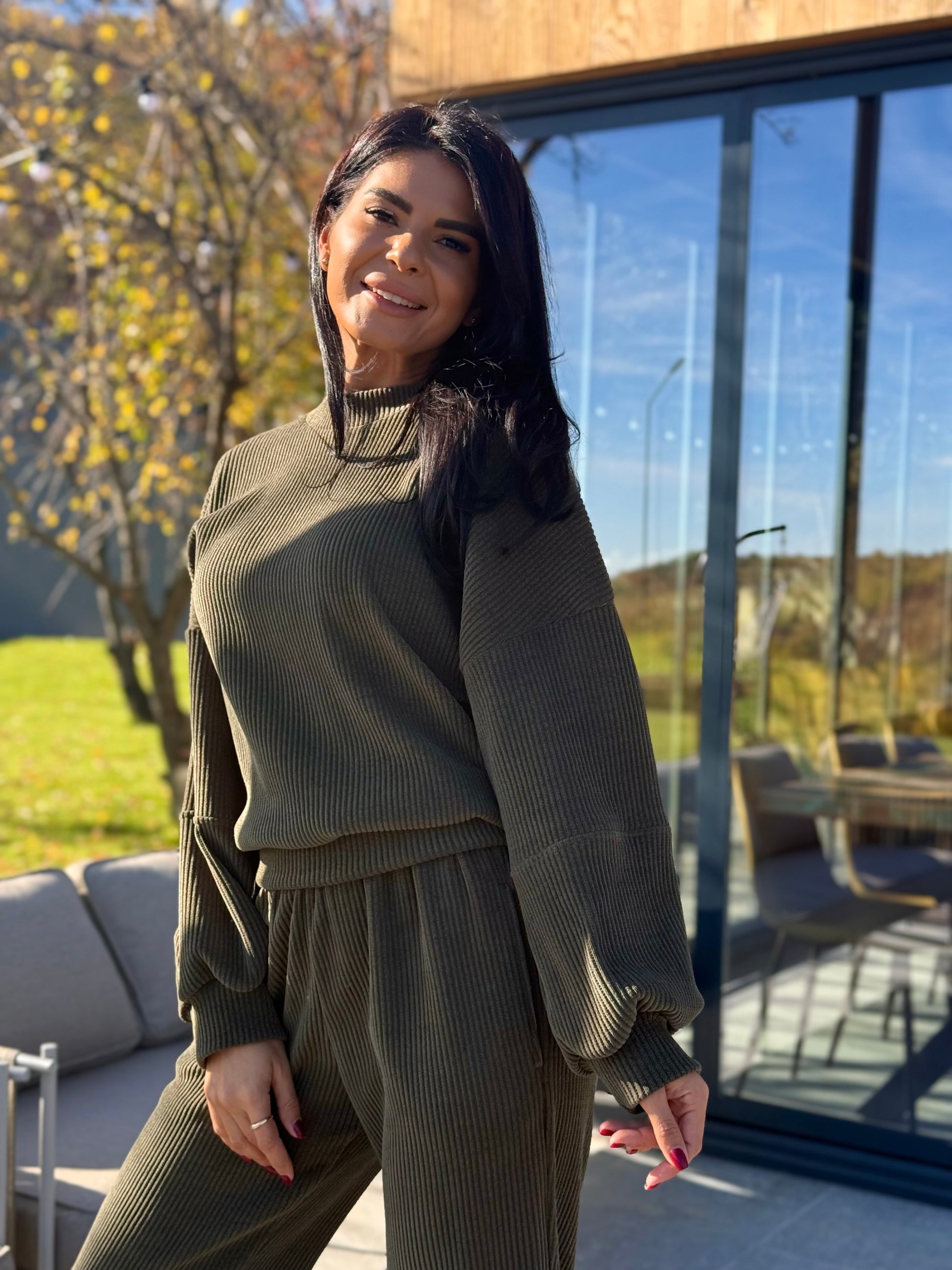 Un outfit cozy si modern, realizat din catifea reiata moale si placuta la atingere, cu textura fina si densitate ideala pentru sezonul rece. Bluza are croiala lejera, mansete elastice la maneci si un design minimalist, usor de integrat in tinutele de zi cu zi. Pantalonii sunt prevazuti cu talie elastica si mansete in partea de jos, oferind confort si libertate de miscare, pastrand in acelasi timp o linie eleganta.